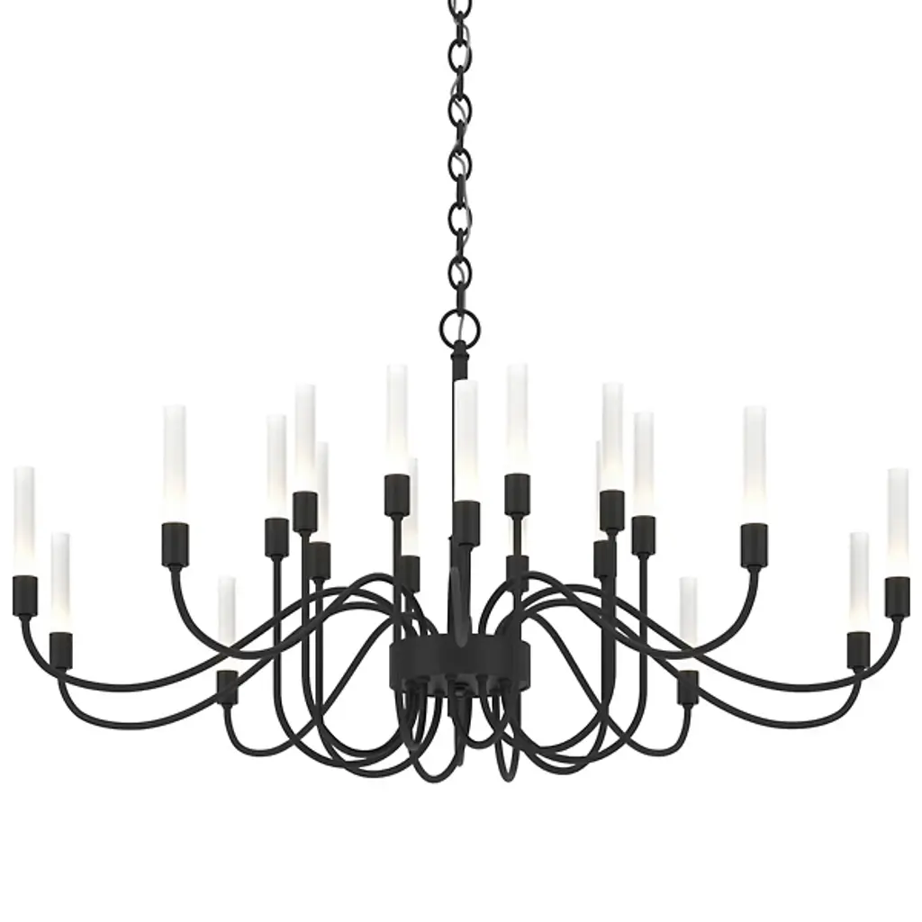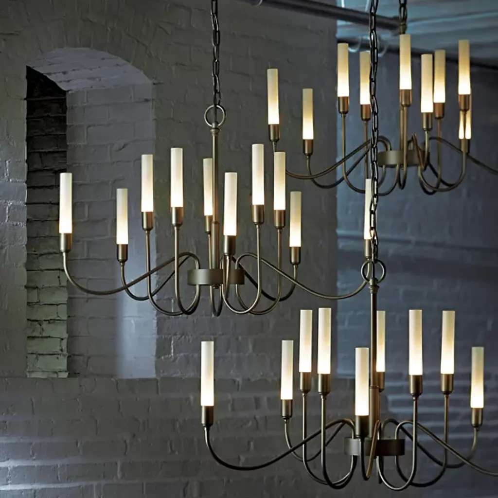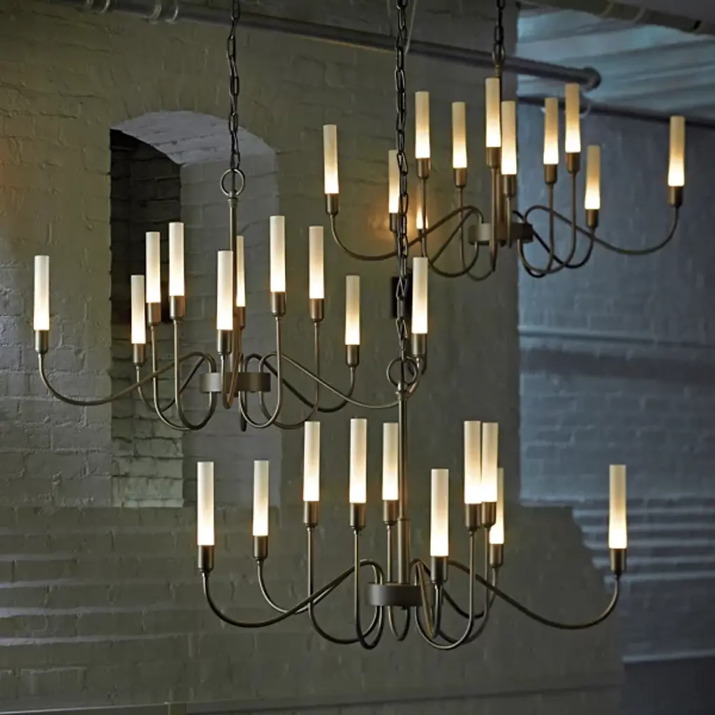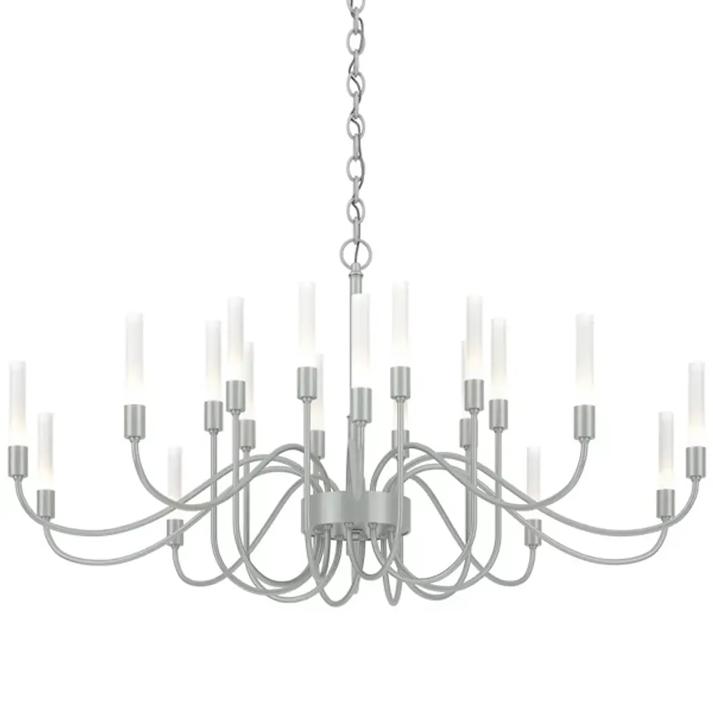 Minimalist grace. The Hubbardton Forge Lisse Chandelier offers an unfettered style with gentle curves and smooth lines. (Indeed, the word "lisse" is French for "smooth.") Ten arms support slim cylindrical Frosted glass shades, creating a silhouette that is at once linear and organic. A spare and stylish alternative to traditional chandeliers.