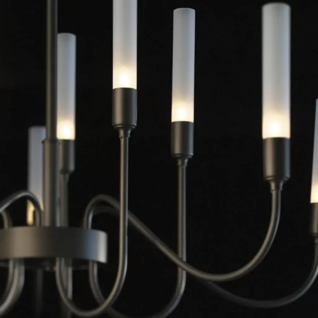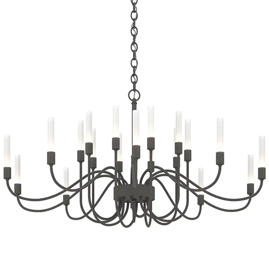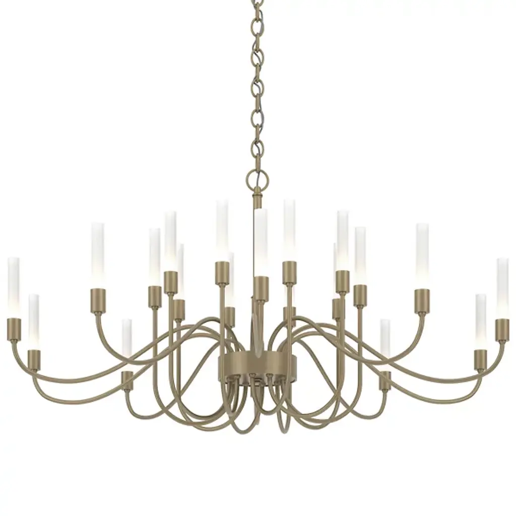Minimalist grace. The Hubbardton Forge Lisse Chandelier offers an unfettered style with gentle curves and smooth lines. (Indeed, the word "lisse" is French for "smooth.") Ten arms support slim cylindrical Frosted glass shades, creating a silhouette that is at once linear and organic. A spare and stylish alternative to traditional chandeliers.