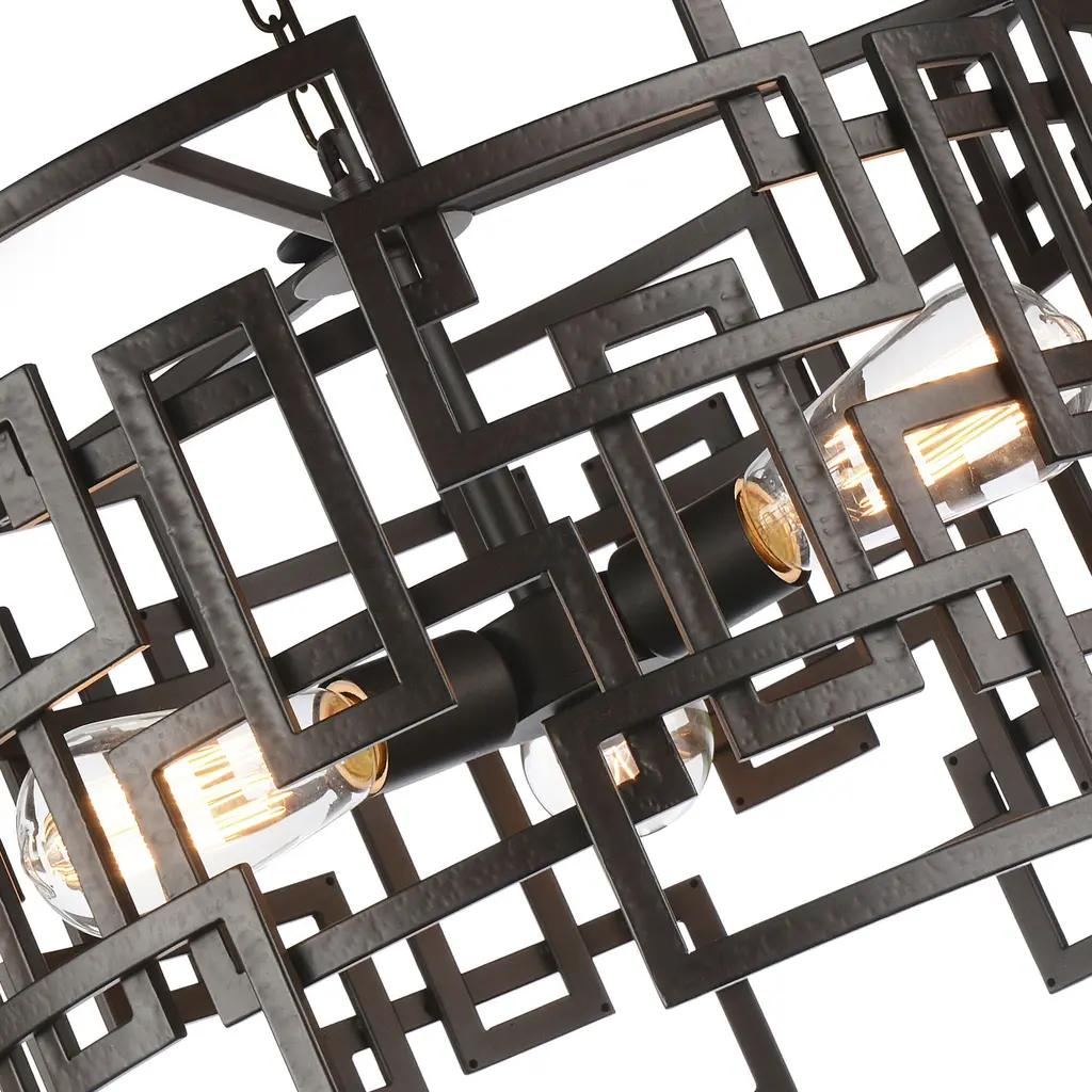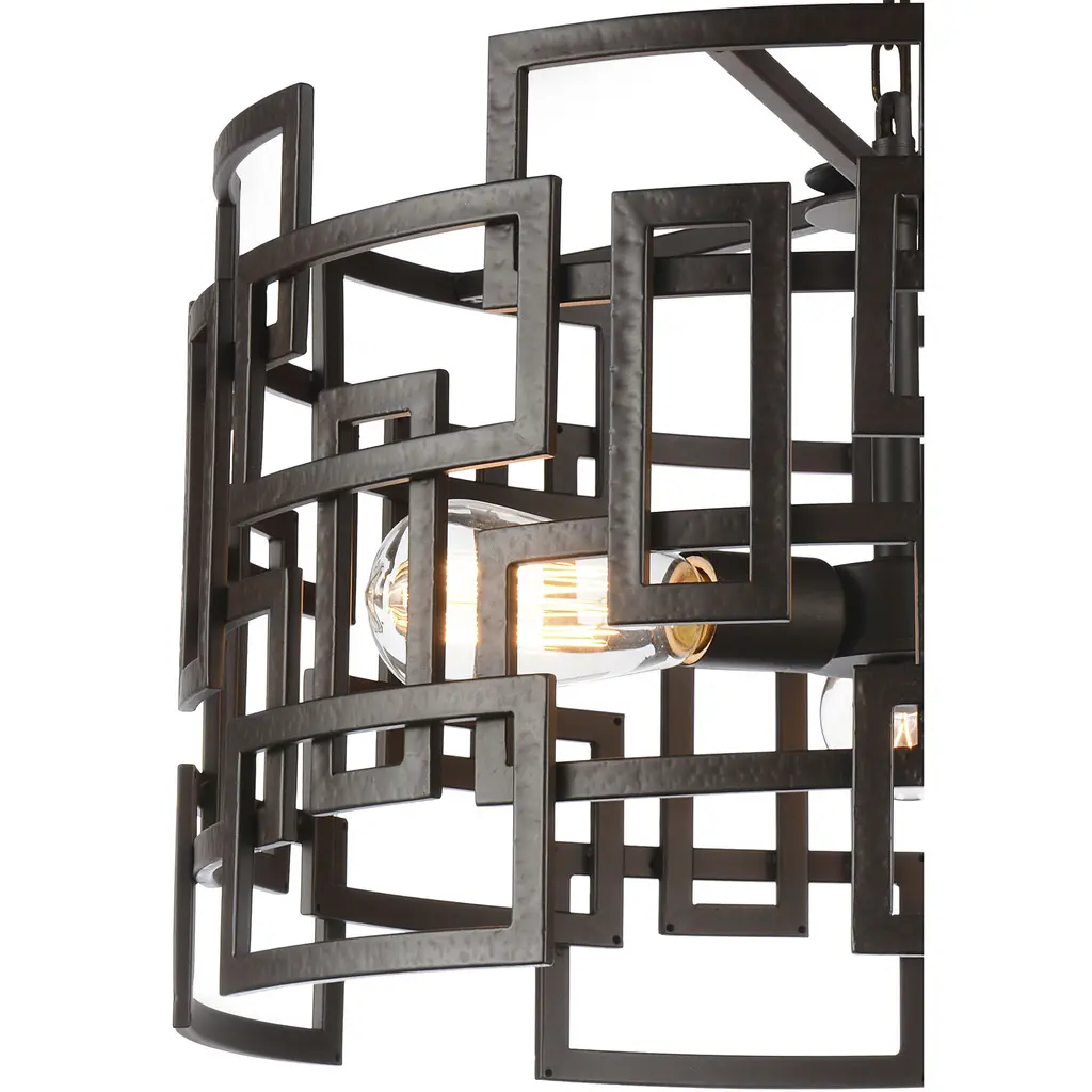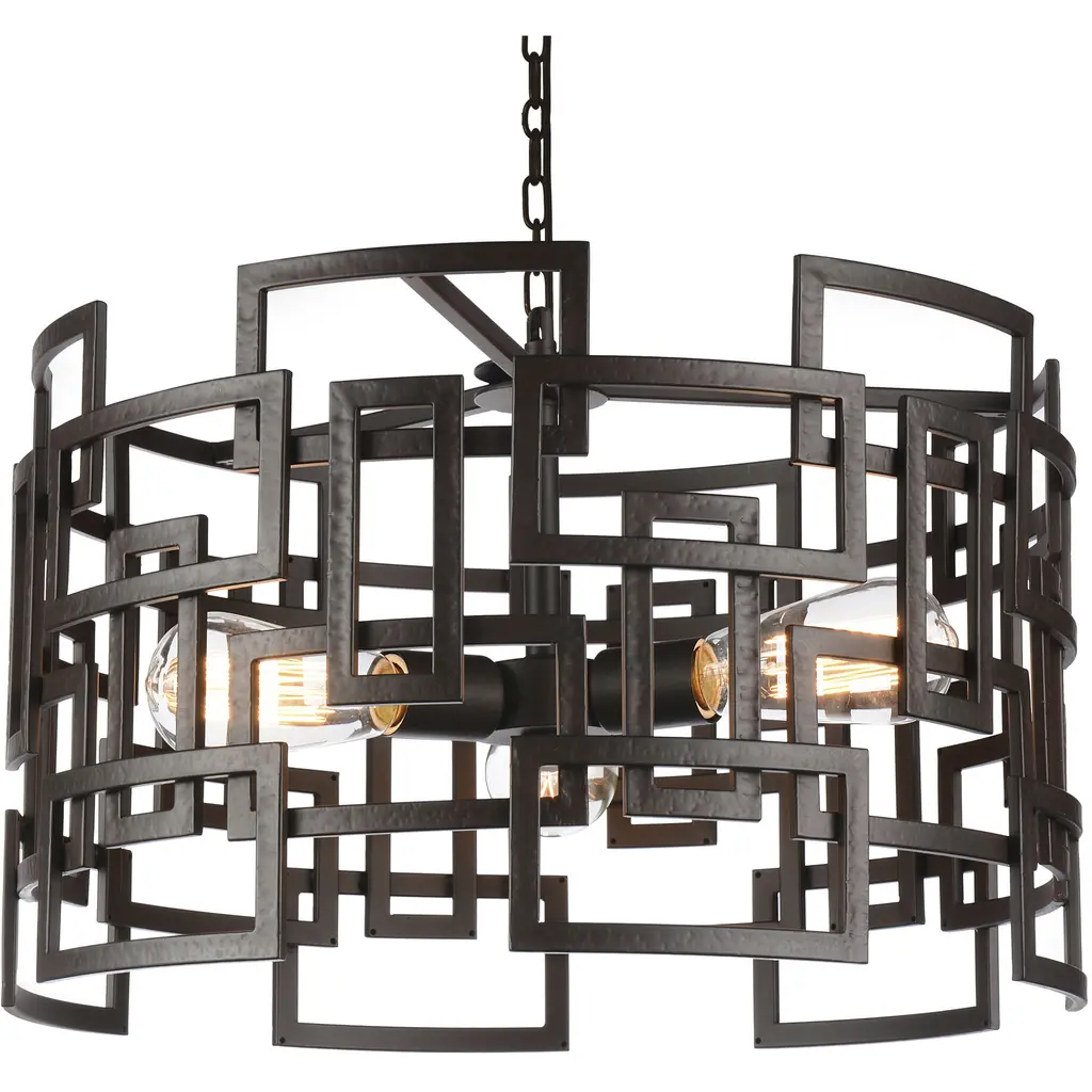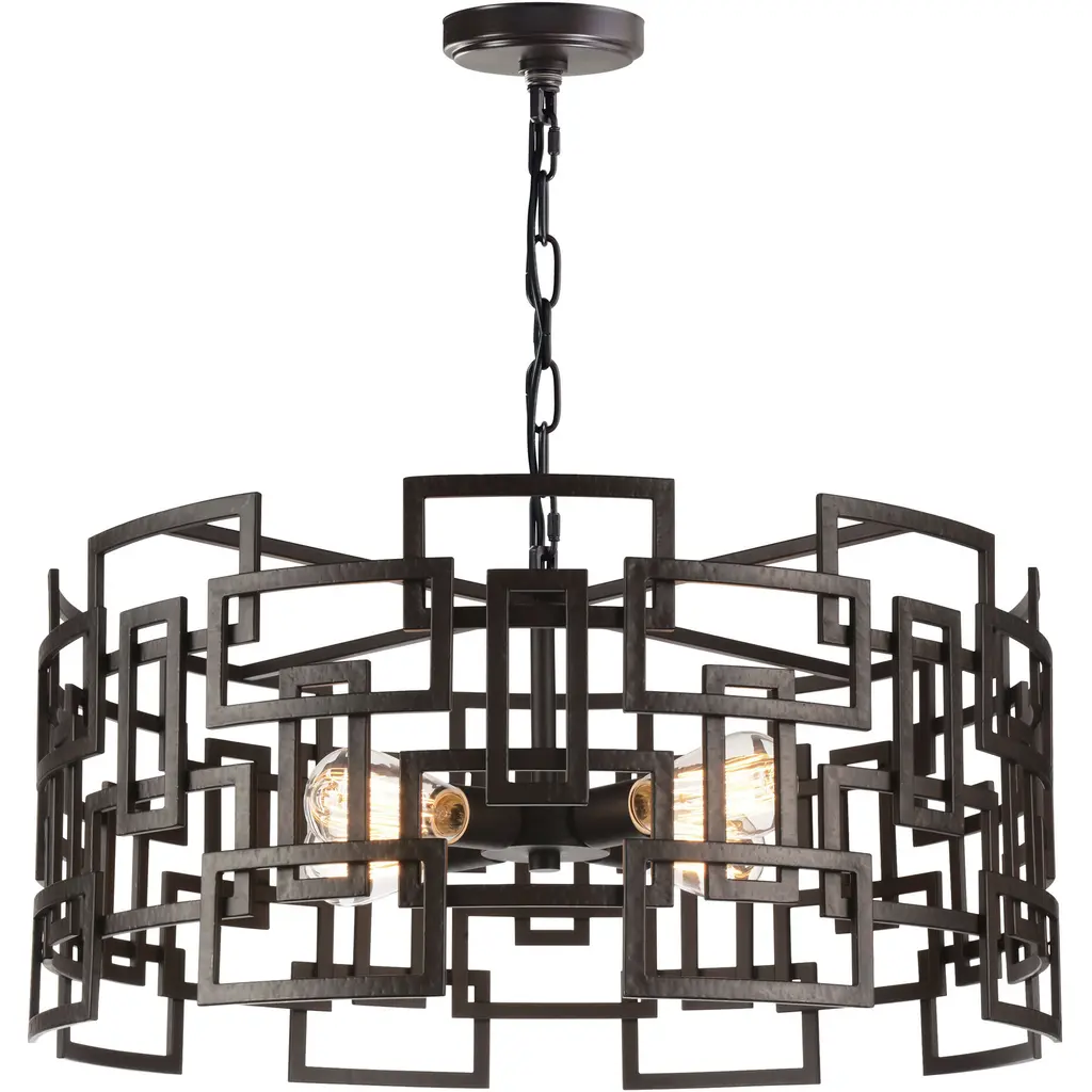 Change the character of a space with the Litani 3 Light Chandelier. This light fixture displays an interesting form with its 19 inch circular shade crafted in metal and designed with overlapping rectangular frames. The edginess of the angles is balanced by the pendant's round silhouette. Three exposed bulbs radiate a soft glow. This down chandelier will look perfect in the bedroom, living room, office, or dining room.