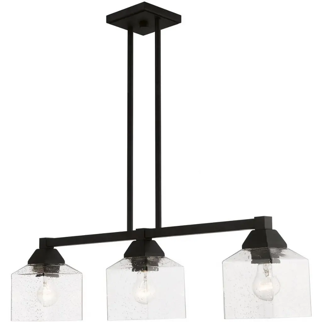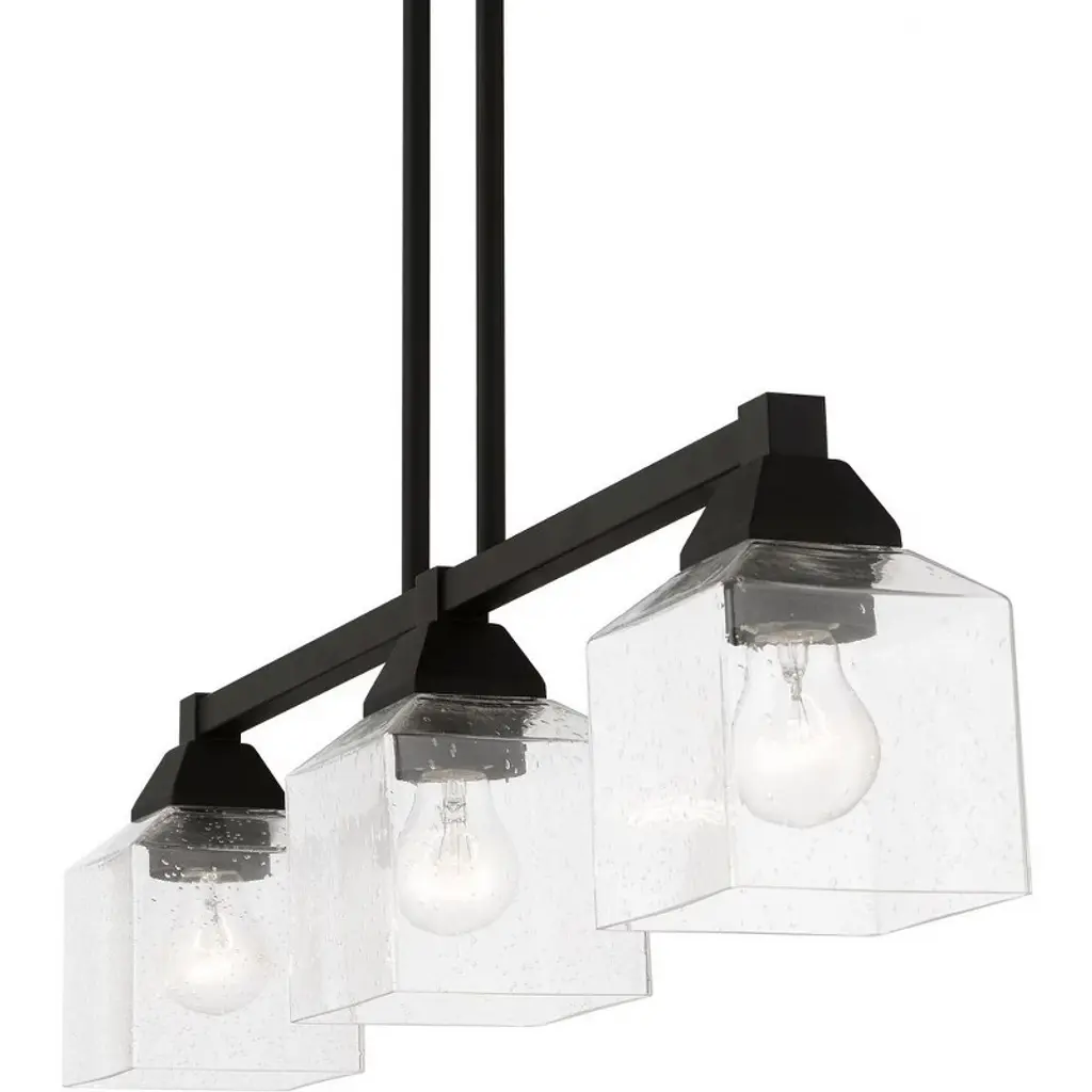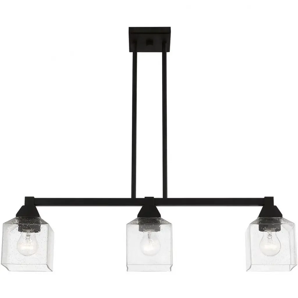 Collection: Aragon, Material: Steel, Finish Color: Black, Width: 4.75", Height: 14.25", Length: 30", Hanging Method: Stem, Lamping Type: Incandescent, Number Of Bulbs: 3, Wattage: 180 Watts, Moisture Rating: Dry Rated, Desc: This three light linear chandelier from the Aragon collection is sure to provide reliable illumination without sacrificing style. It features clear seeded glass shades with an open bottom, exposing the bulb inside. A black finish covers the angular frame and accents the light.,