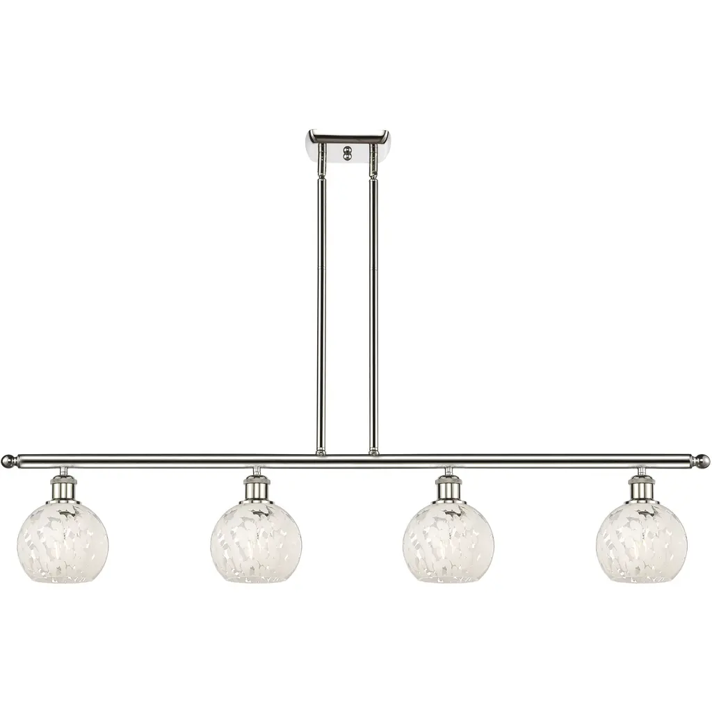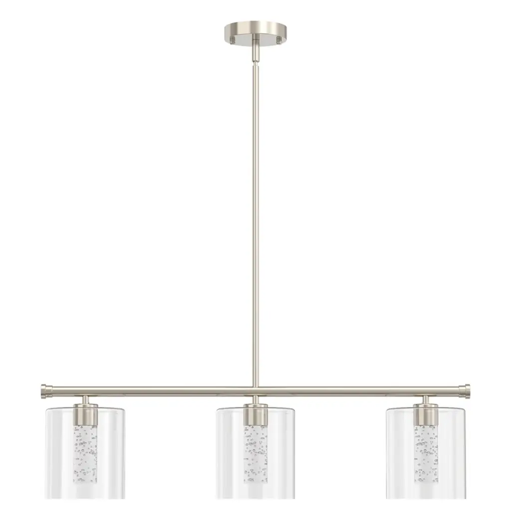 Collection: Ashcroft, Material: Steel, Finish Color: Brushed Nickel, Width: 7", Height: 17.25", Length: 30", Hanging Method: Stem, Lamping Type: Incandescent, Number Of Bulbs: 3, Wattage: 180 Watts, Moisture Rating: Dry Rated, Desc: The Ashcroft collection redefines elegance. It boasts a bronze finish combined with clear water glass. The scale of this three-light linear chandelier amplifies todays contemporary approach to any interior needing dramatic air. Place it over your dining room table or a countertop and enjoy this unforgettable conversation piece. No. of Rods: 3 / Canopy Included: Yes / Canopy Diameter: 5.13 x 0.75 / Rod Length(s): 18.00. ,