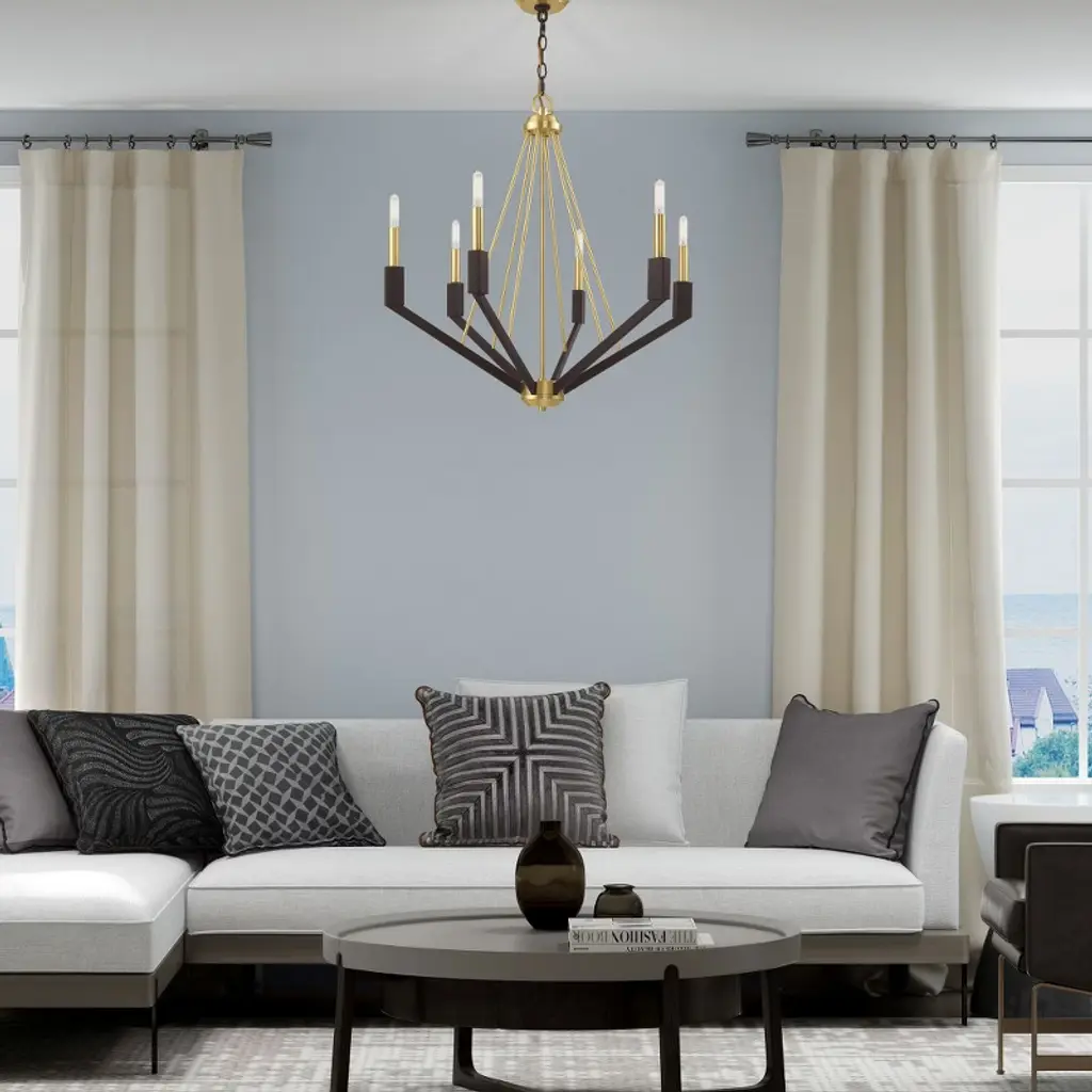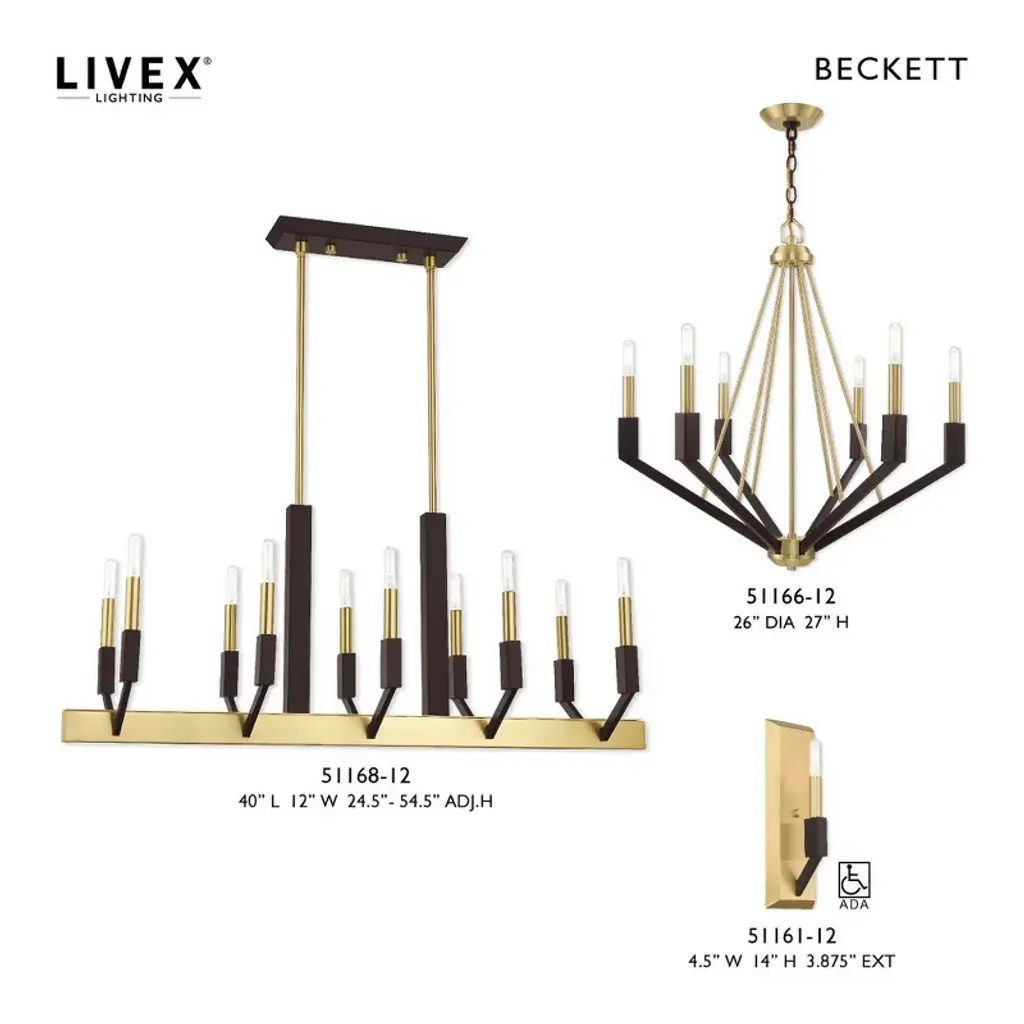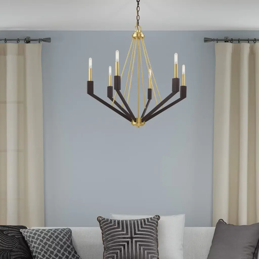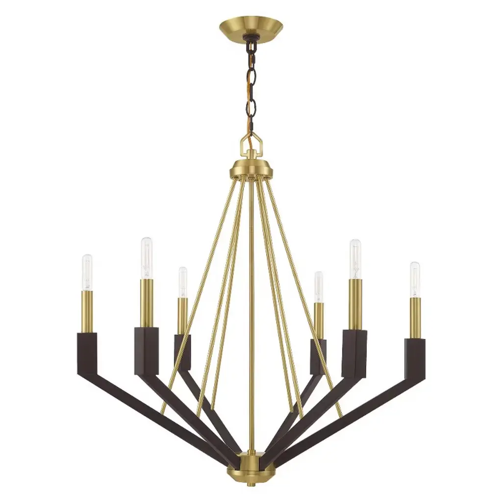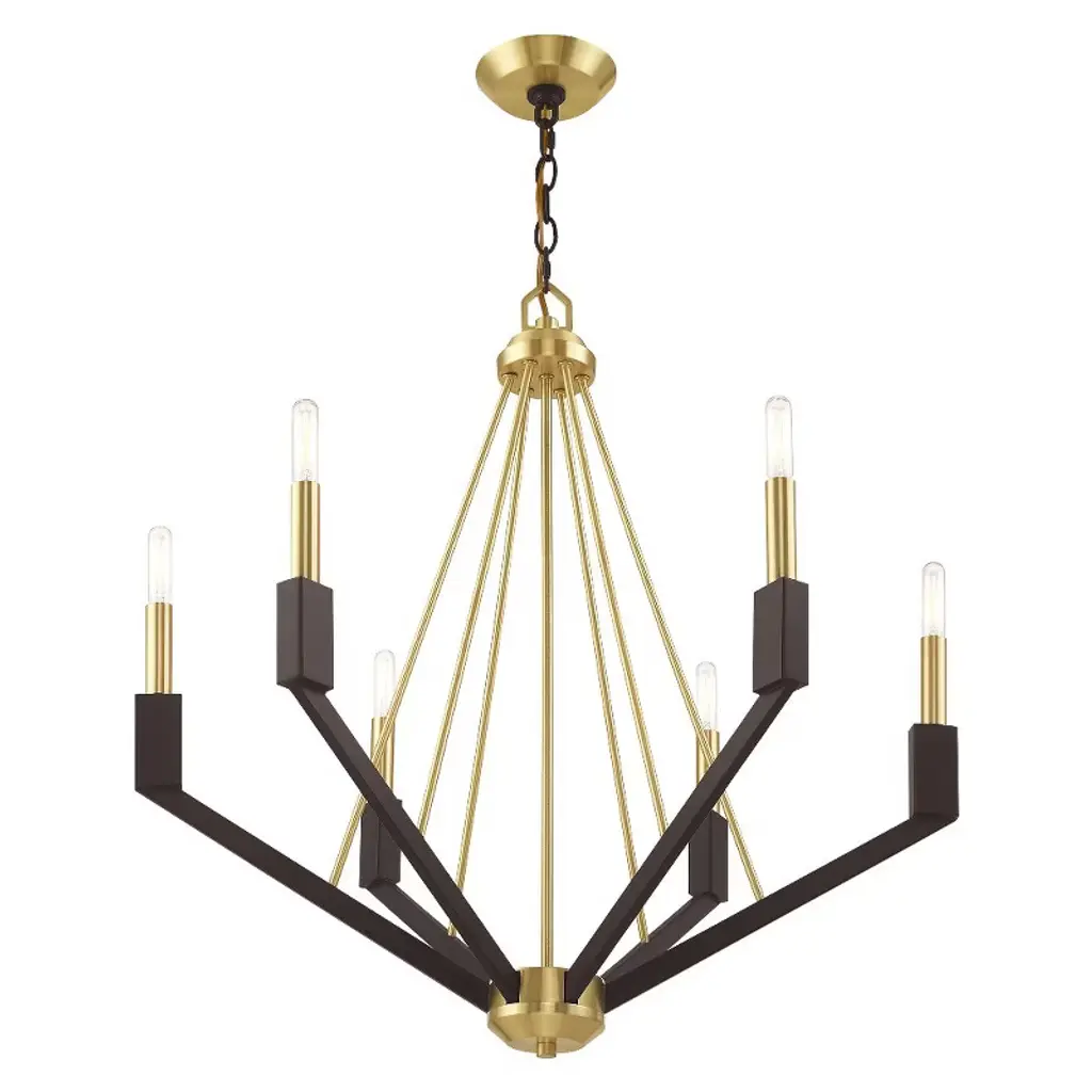 Collection: Beckett, Material: Steel, Finish Color: Satin Brass/Bronze, Width: 26", Height: 27", Hanging Method: Chain, Chain Length: 36", Lamping Type: Incandescent, Number Of Bulbs: 6, Wattage: 360 Watts, Moisture Rating: Dry Rated, Desc: Illuminate your home with bright designs from the Beckett collection. The six light chandelier emulates a mid-century modern style made popular in the 50s and 60s. The satin brass frame is accented with bronze accents, helping to fully complete this look. Canopy Included: Yes / Canopy Diameter: 5.00. ,