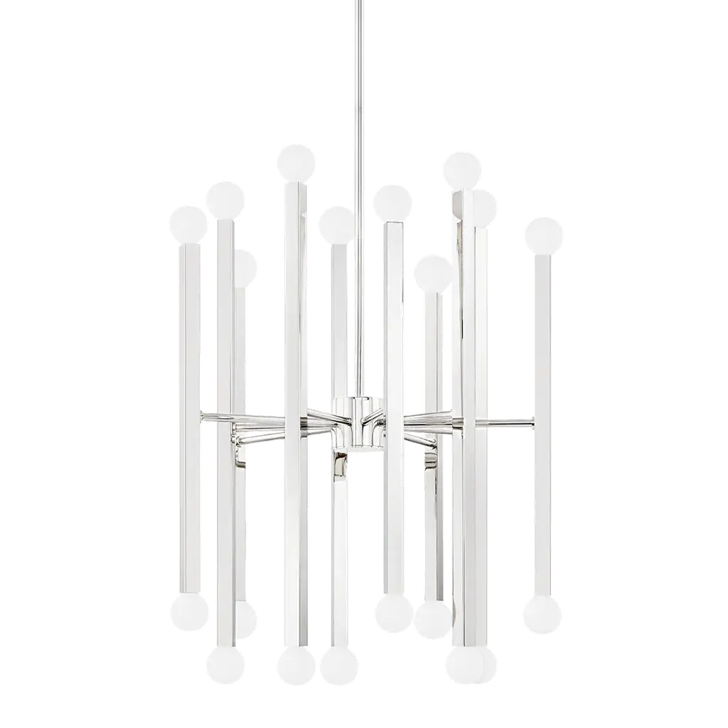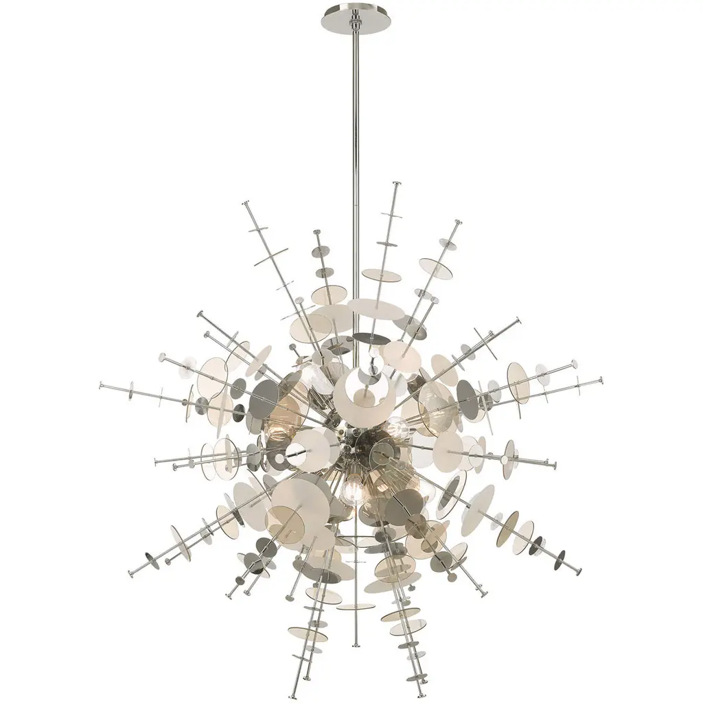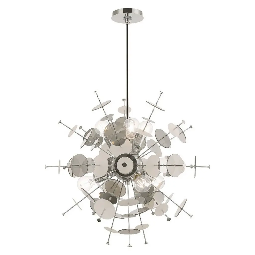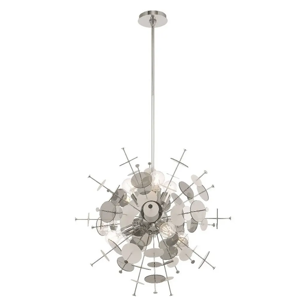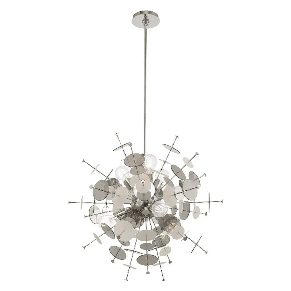 Collection: Circulo, Material: Steel, Finish Color: Polished Chrome, Width: 24", Height: 32", Hanging Method: Stem, Lamping Type: Incandescent, Number Of Bulbs: 6, Wattage: 360 Watts, Moisture Rating: Dry Rated, Desc: Cast a luxurious glow over your room with this polished chrome six light pendant chandelier. It has beautiful geometric glass discs that will add dimension to any room. This Art Deco-inspired design features a polished chrome finish for an up-scaled taste of class. No. of Rods: 3 / Canopy Included: Yes / Shade Included: Yes / Canopy Diameter: 5.13 / Rod Length(s): 18.00. ,