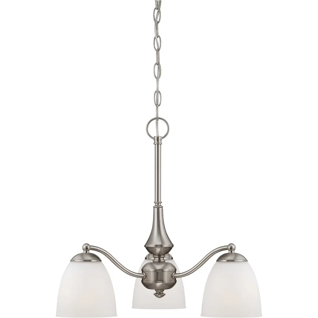 Collection: Essex, Material: Steel, Finish Color: Brushed Nickel, Width: 20", Height: 11.25", Hanging Method: Chain, Chain Length: 36", Lamping Type: Incandescent, Number Of Bulbs: 3, Wattage: 300 Watts, Moisture Rating: Dry Rated, Desc: Bring a refined lighting style to your kitchen area with this Essex collection three light chandelier. Canopy Included: Yes / Shade Included: Yes / Canopy Diameter: 5.25. ,
