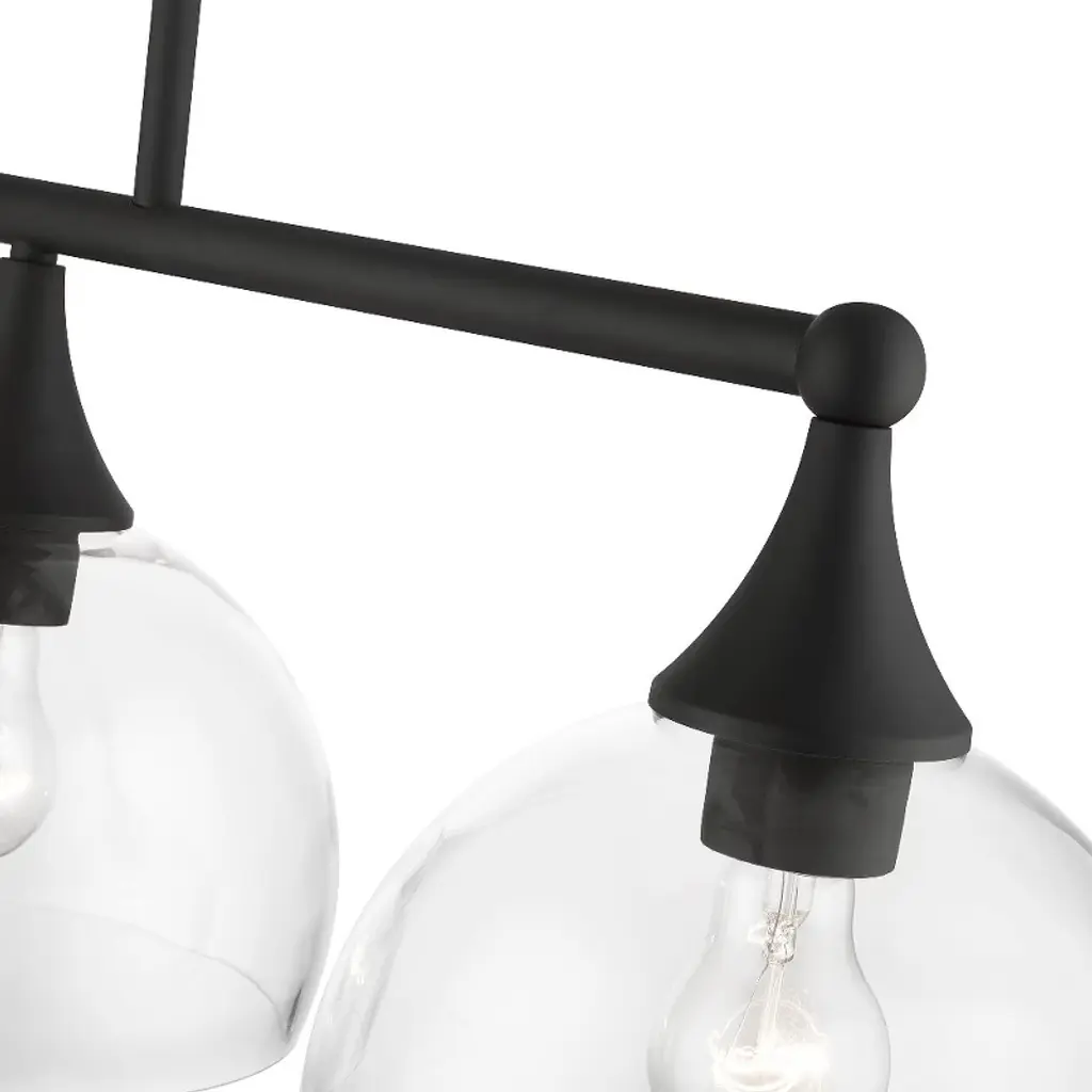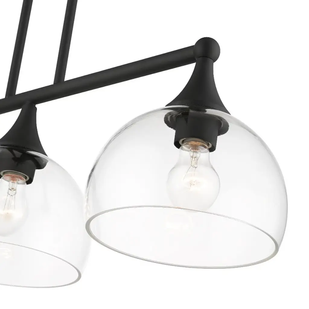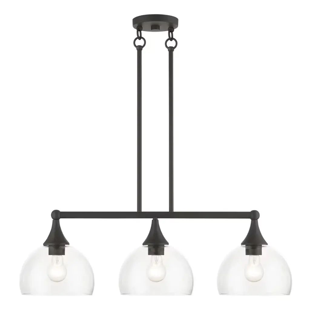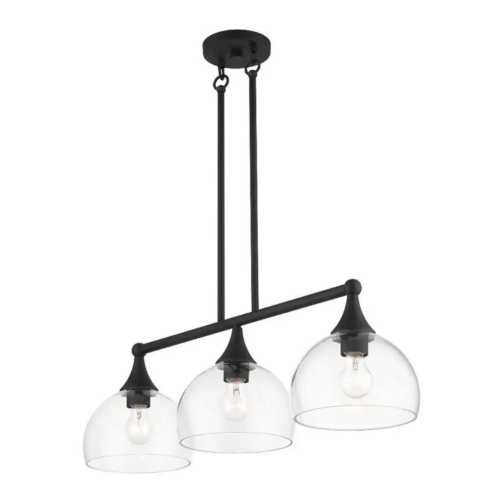 Collection: Glendon, Material: Steel, Finish Color: Black, Width: 8.25", Height: 18.75", Length: 30", Hanging Method: Stem, Lamping Type: Incandescent, Number Of Bulbs: 3, Wattage: 180 Watts, Moisture Rating: Dry Rated, Desc: This three light linear chandelier from the Glendon collection has understated elegance. It features minimal details, clear curved glass with an antique brass finish and can fit into any decor.,