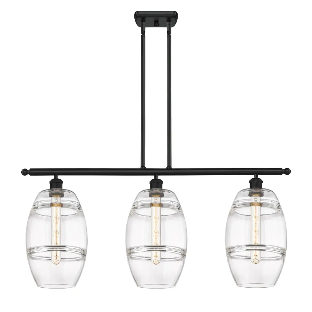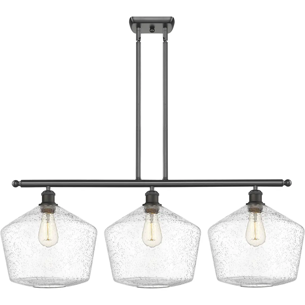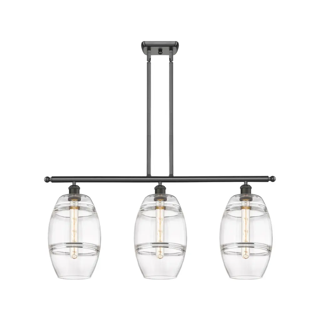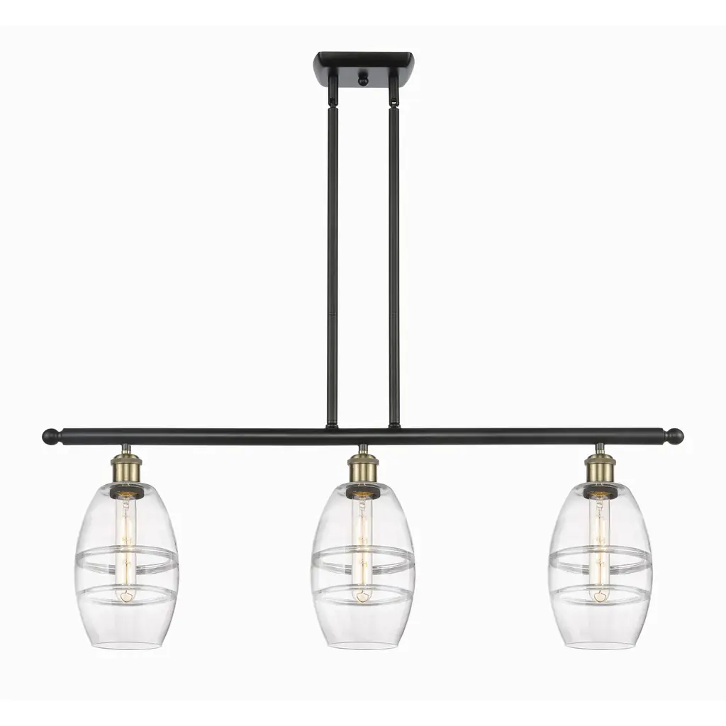 Collection: Glendon, Material: Steel, Finish Color: Black, Width: 8.25", Height: 18.75", Length: 30", Hanging Method: Stem, Lamping Type: Incandescent, Number Of Bulbs: 3, Wattage: 180 Watts, Moisture Rating: Dry Rated, Desc: This three light linear chandelier from the Glendon collection has understated elegance. It features minimal details, clear curved glass with an antique brass finish and can fit into any decor.,