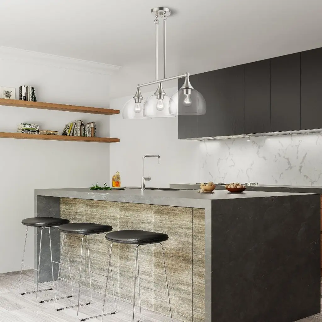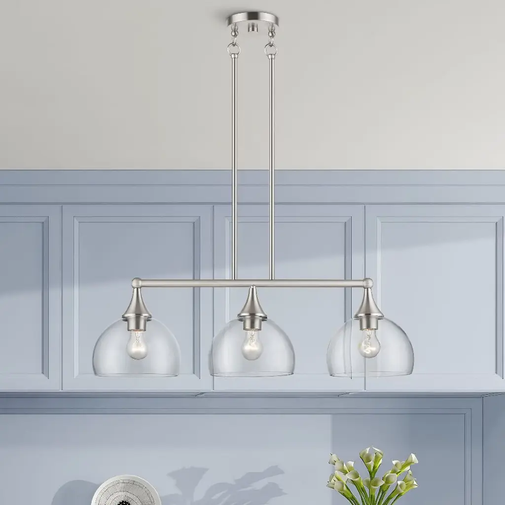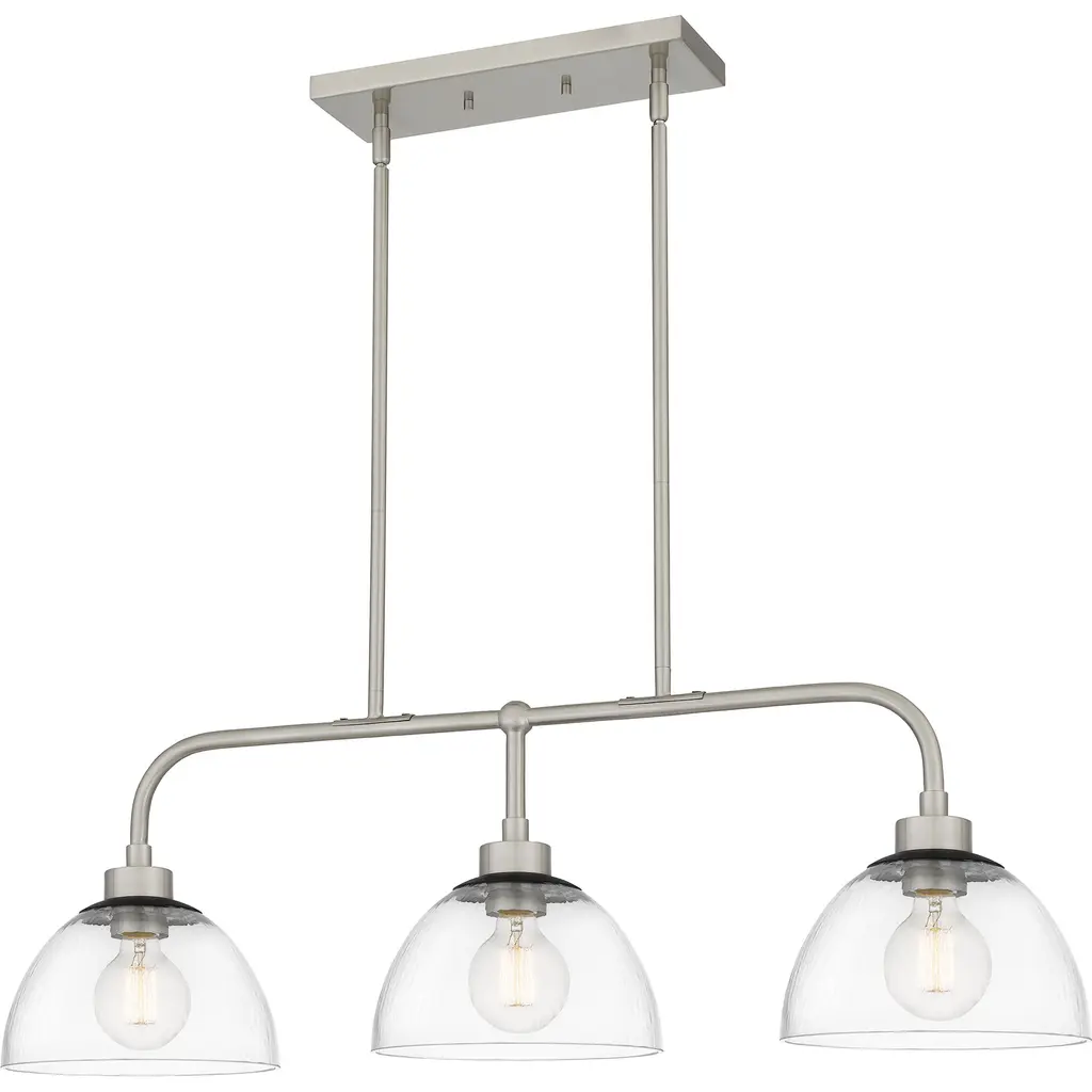 Collection: Glendon, Material: Steel, Finish Color: Brushed Nickel, Width: 8.25", Height: 18.75", Length: 30", Hanging Method: Stem, Lamping Type: Incandescent, Number Of Bulbs: 3, Wattage: 180 Watts, Moisture Rating: Dry Rated, Desc: This three light linear chandelier from the Glendon collection has understated elegance. It features minimal details, clear curved glass with an antique brass finish and can fit into any decor.,