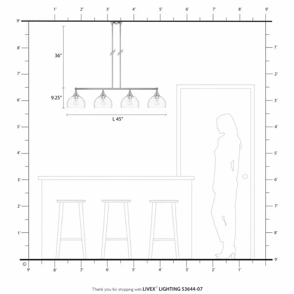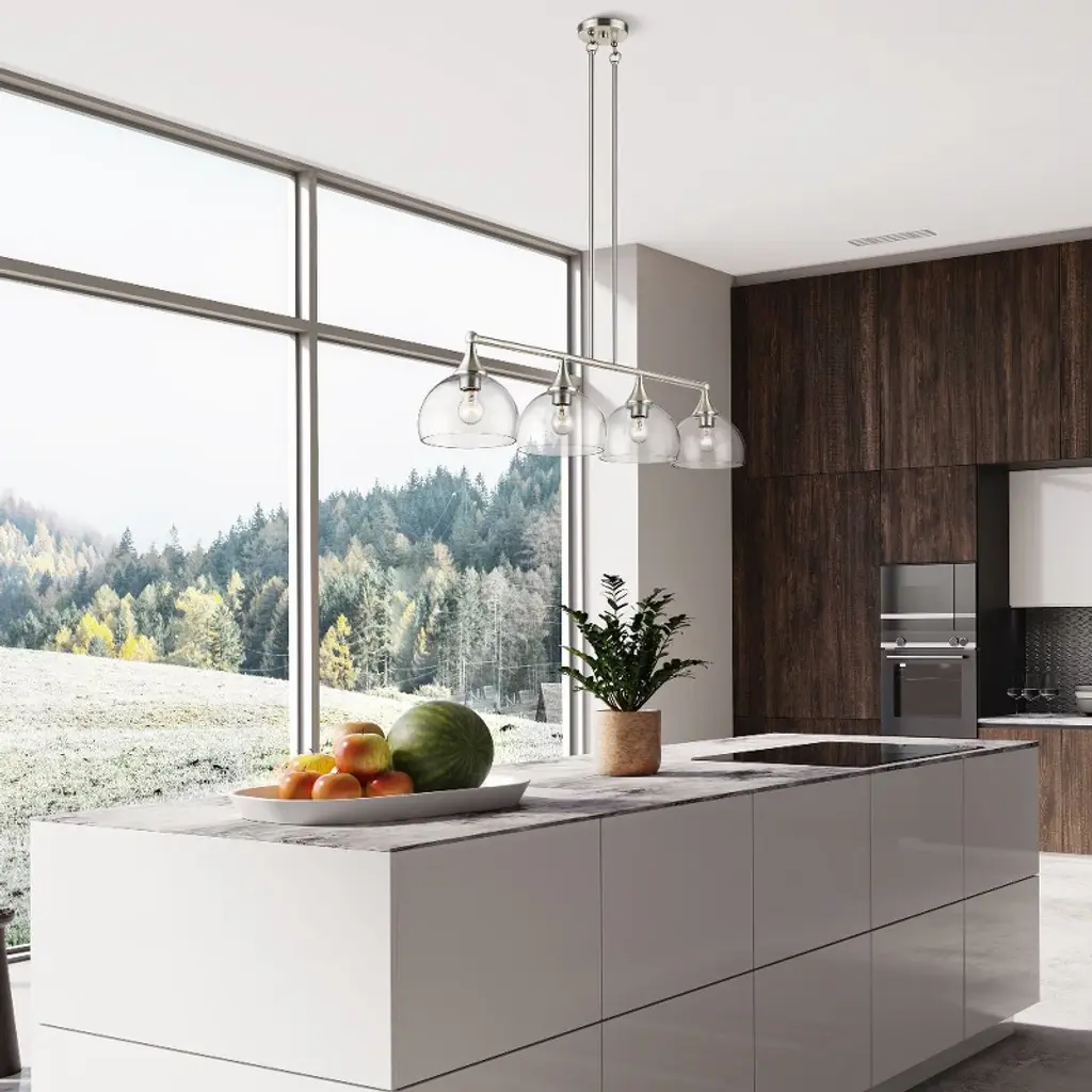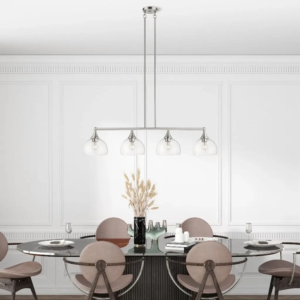 Collection: Glendon, Material: Steel, Finish Color: Brushed Nickel, Width: 8.25", Height: 18.75", Length: 45", Hanging Method: Stem, Lamping Type: Incandescent, Number Of Bulbs: 4, Wattage: 240 Watts, Moisture Rating: Dry Rated, Desc: This four light linear chandelier from the Glendon collection has understated elegance. It features minimal details, clear curved glass with an antique brass finish and can fit into any decor.,
