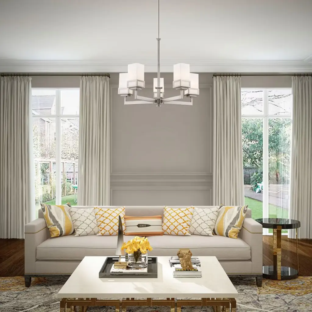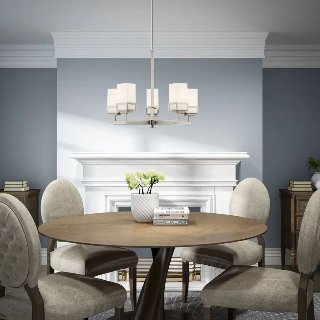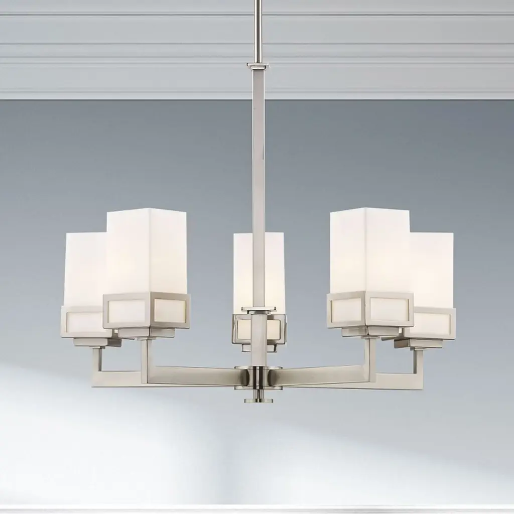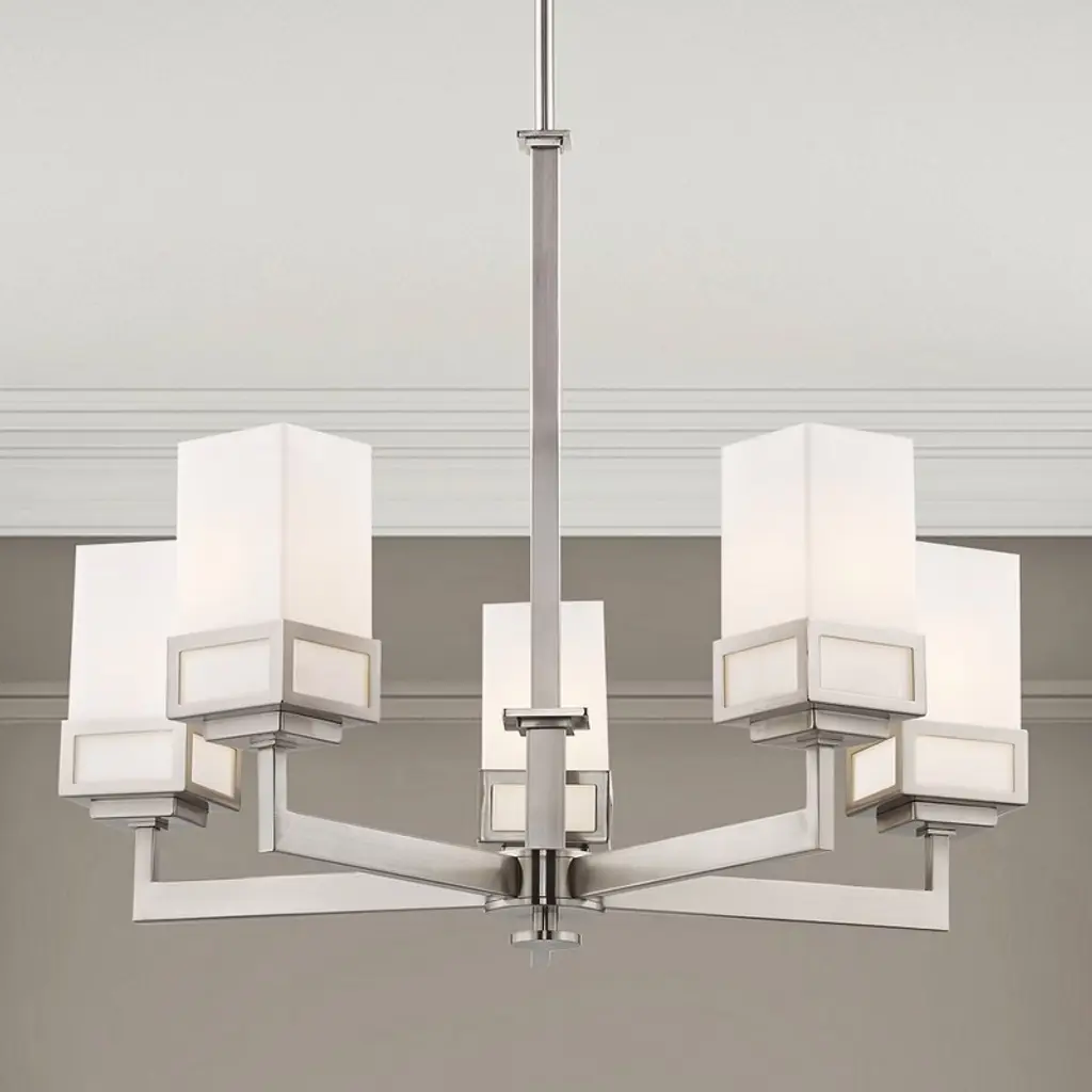 Collection: Harding, Material: Steel, Finish Color: Brushed Nickel, Width: 25", Height: 28.5", Hanging Method: Stem, Lamping Type: Incandescent, Number Of Bulbs: 5, Wattage: 500 Watts, Moisture Rating: Dry Rated, Desc: The transitional style of the Harding five light chandelier features an eye-catching satin opal white glass shade floating inside a unique double forged square design in a brushed nickel finish.,