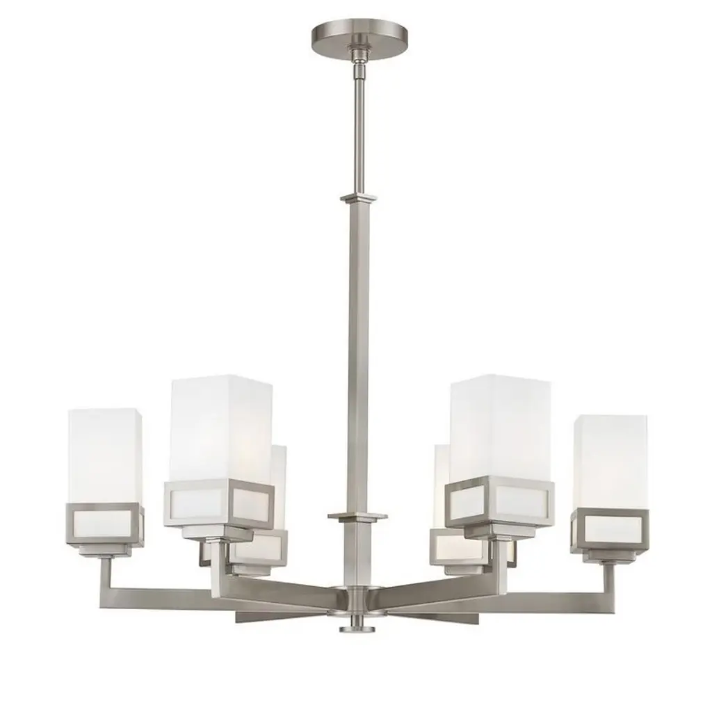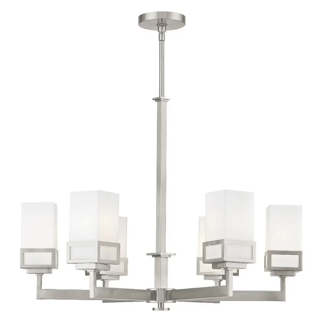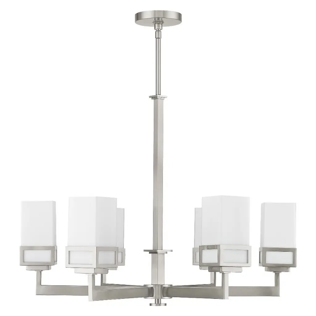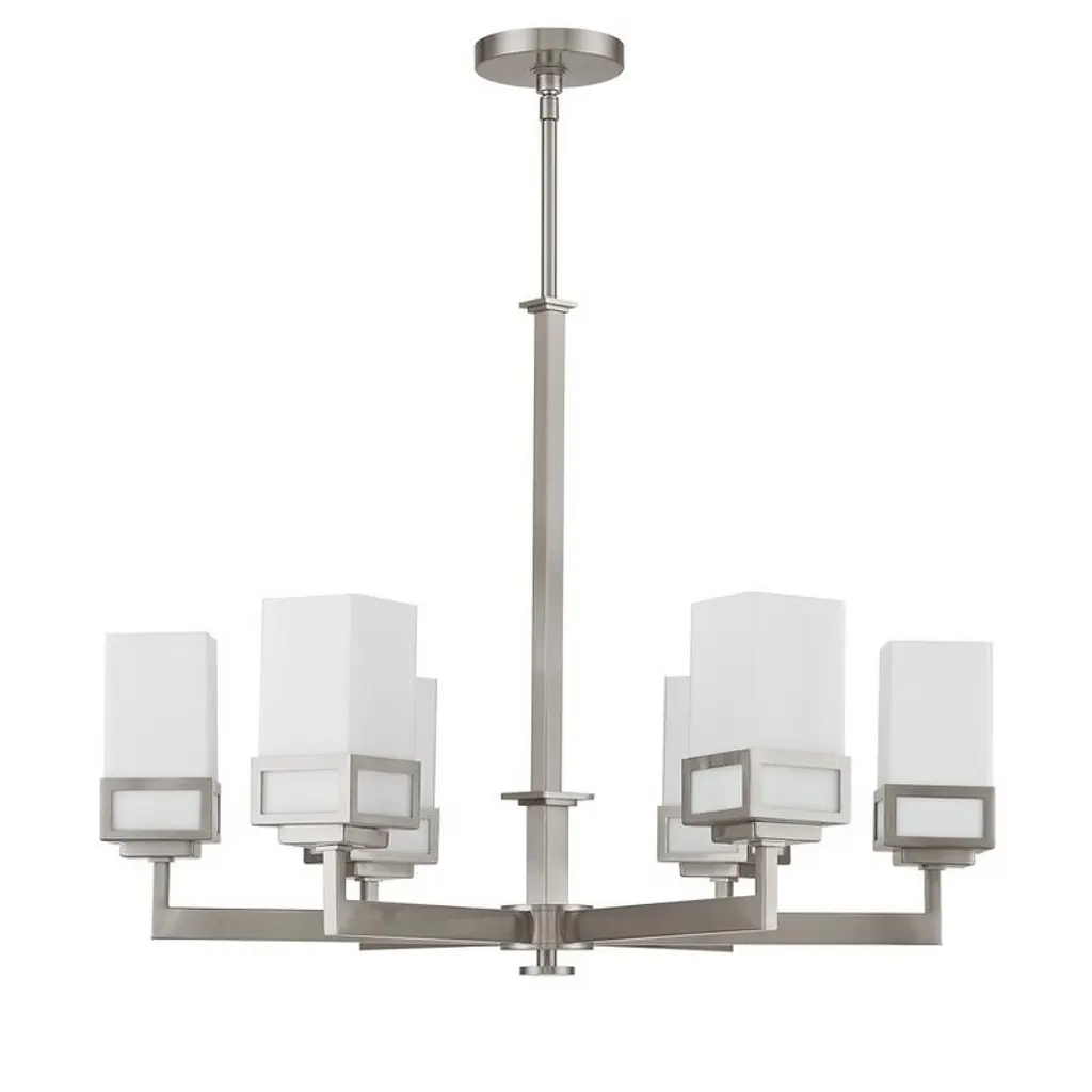 Collection: Harding, Material: Steel, Finish Color: Brushed Nickel, Width: 28.5", Height: 29.5", Hanging Method: Stem, Lamping Type: Incandescent, Number Of Bulbs: 6, Wattage: 600 Watts, Moisture Rating: Dry Rated, Desc: The transitional style of the Harding six light chandelier features an eye-catching satin opal white glass shade floating inside a unique double forged square design in a brushed nickel finish. No. of Rods: 3 / Canopy Included: Yes / Shade Included: Yes / Canopy Diameter: 4.75 / Rod Length(s): 18.00. ,
