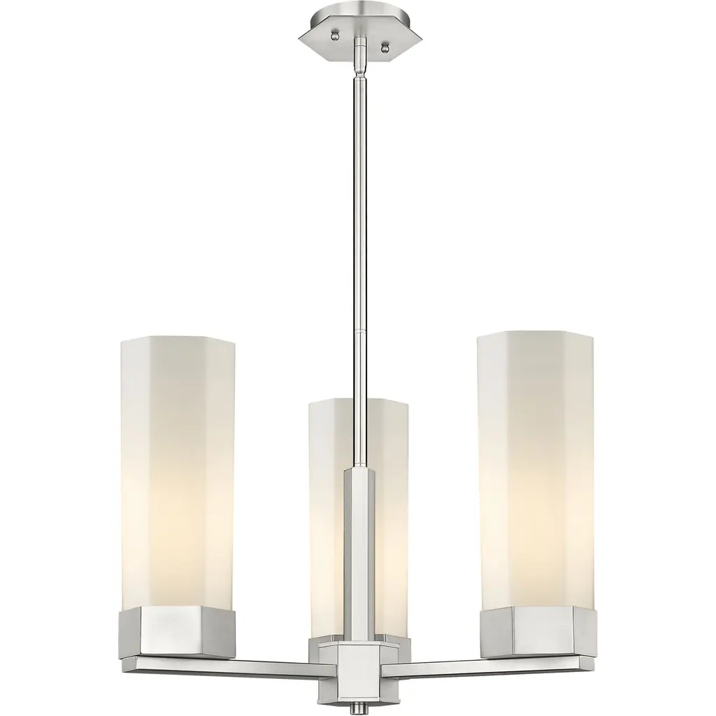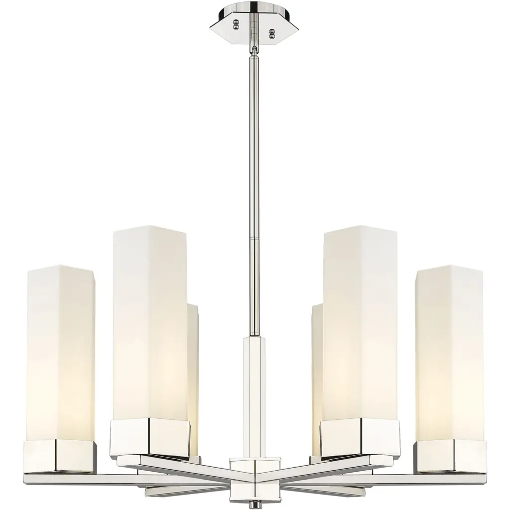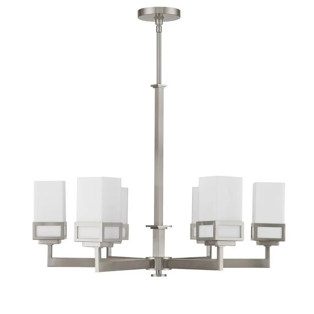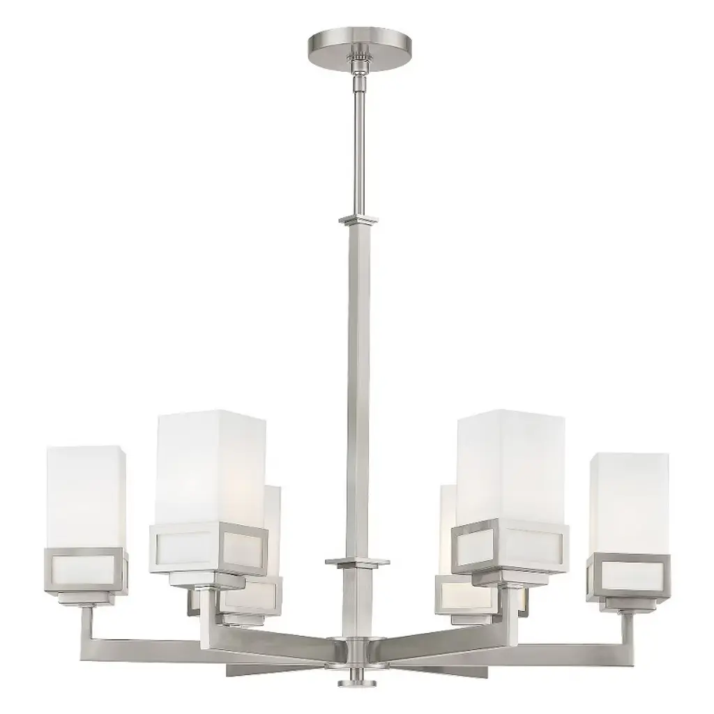 Collection: Harding, Material: Steel, Finish Color: Brushed Nickel, Width: 28.5", Height: 29.5", Hanging Method: Stem, Lamping Type: Incandescent, Number Of Bulbs: 6, Wattage: 600 Watts, Moisture Rating: Dry Rated, Desc: The transitional style of the Harding six light chandelier features an eye-catching satin opal white glass shade floating inside a unique double forged square design in a brushed nickel finish. No. of Rods: 3 / Canopy Included: Yes / Shade Included: Yes / Canopy Diameter: 4.75 / Rod Length(s): 18.00. ,