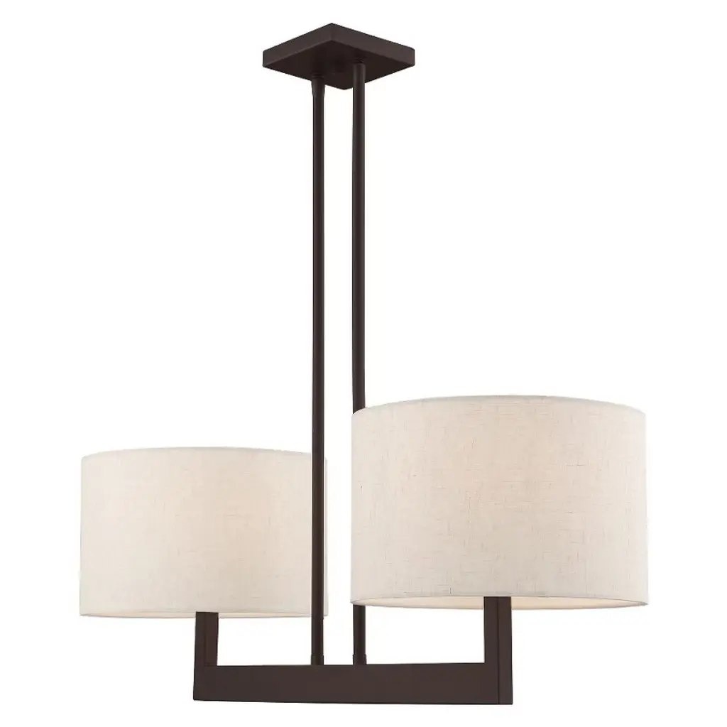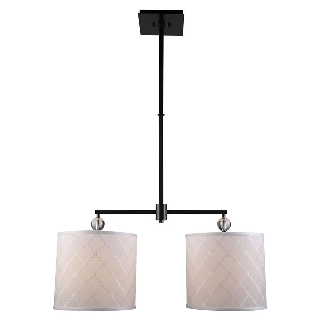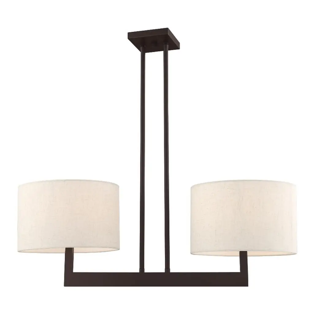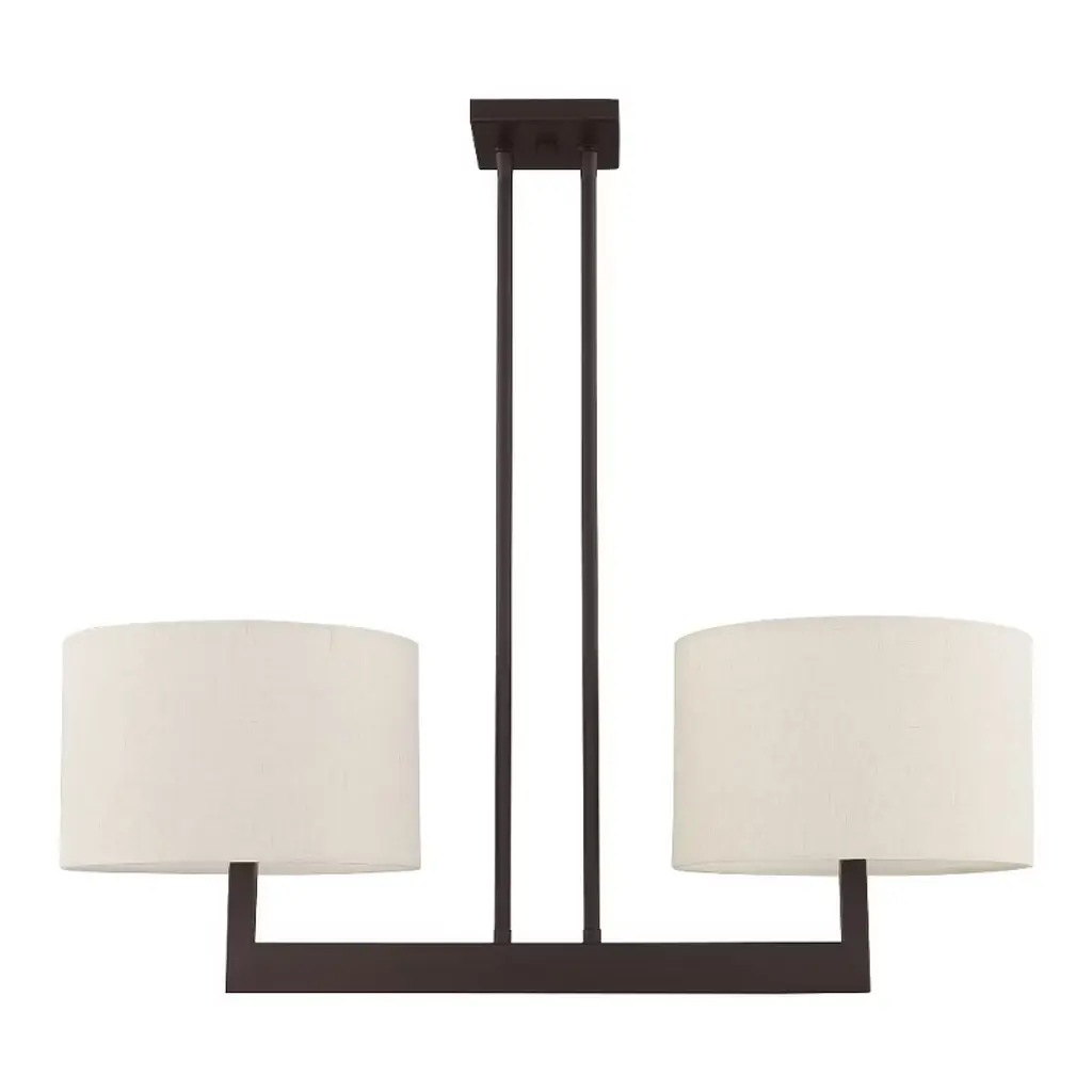 Collection: Hayworth, Material: Steel, Finish Color: Bronze, Width: 11", Height: 22", Length: 30.25", Hanging Method: Stem, Lamping Type: Incandescent, Number Of Bulbs: 2, Wattage: 120 Watts, Moisture Rating: Dry Rated, Desc: Raise the style bar with a designer linear chandelier in a handsome and versatile contemporary manner. This two light linear chandelier comes in a brushed nickel finish with round off-white fabric hardback shade.,