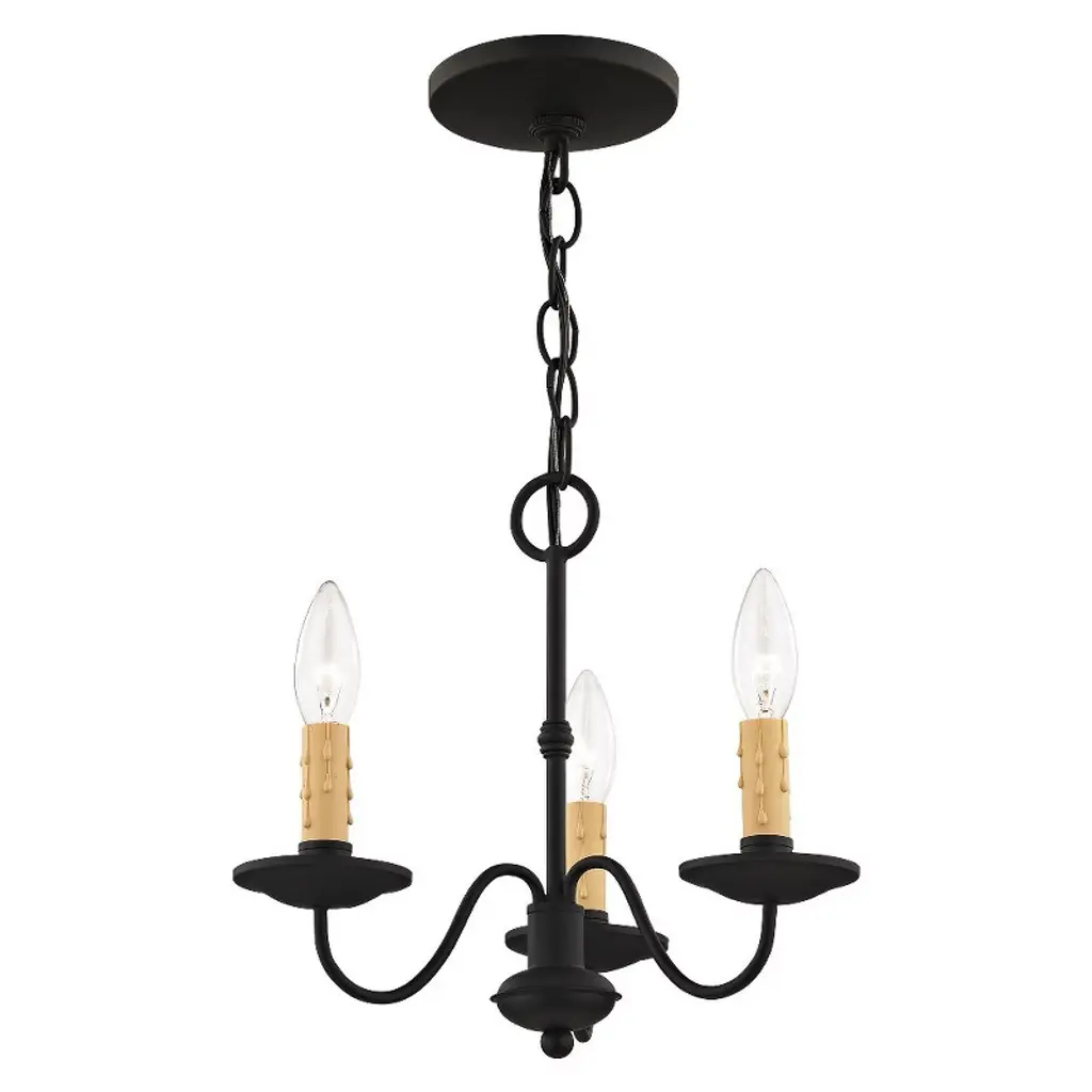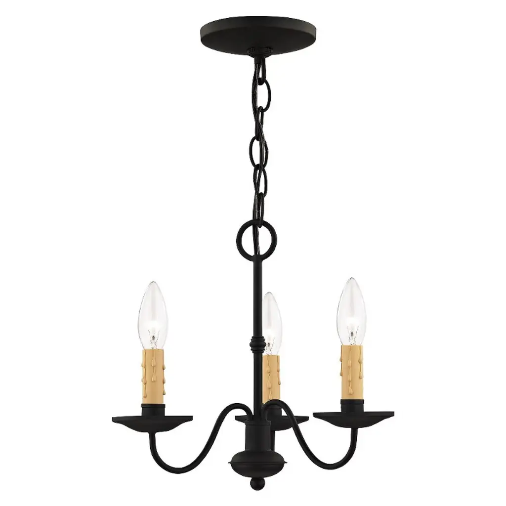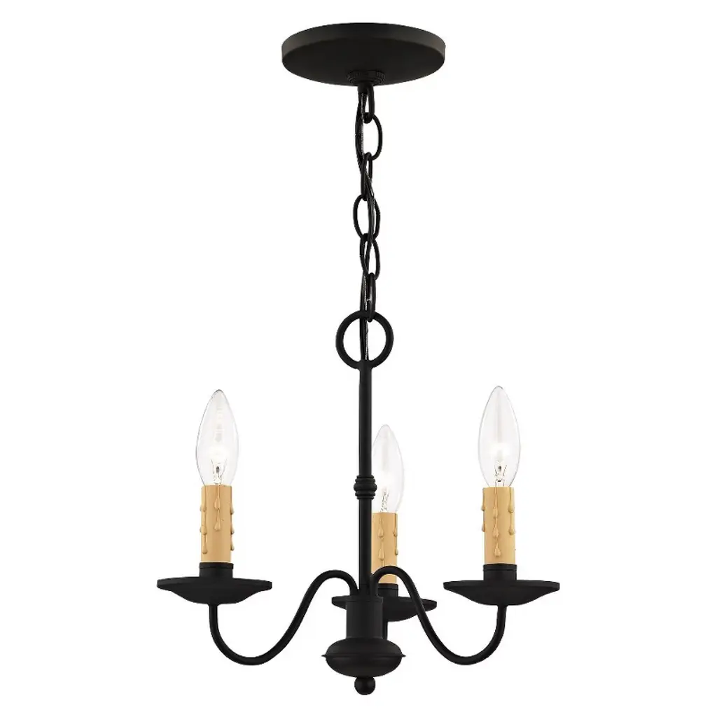 Collection: Heritage, Material: Steel, Finish Color: Black, Width: 12.5", Height: 12", Hanging Method: Chain, Chain Length: 36", Lamping Type: Incandescent, Number Of Bulbs: 3, Wattage: 180 Watts, Moisture Rating: Dry Rated, Desc: The clean design of this steel construction three light chandelier/semi flush mount is enhanced with a black finish. The sweeping arms create a slim silhouette from which the candelabra bulbs emit their soft, romantic glow. Its informal, transitional beauty works well with many room decor schemes. Canopy Included: Yes / Canopy Diameter: 5.00. ,
