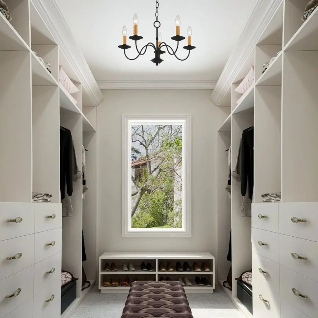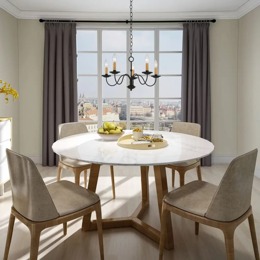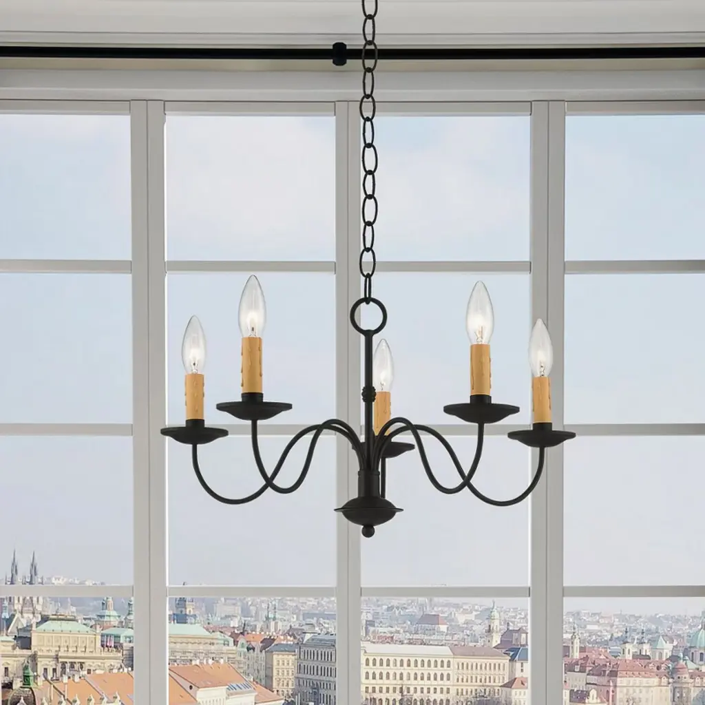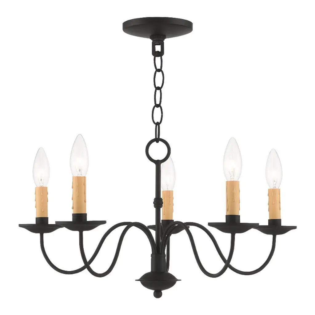 Collection: Heritage, Material: Steel, Finish Color: Black, Width: 20", Height: 11.5", Hanging Method: Chain, Chain Length: 36", Lamping Type: Incandescent, Number Of Bulbs: 5, Wattage: 300 Watts, Moisture Rating: Dry Rated, Desc: The clean design of this steel construction five light chandelier is enhanced with a black finish. The sweeping arms create a slim silhouette from which the candelabra bulbs emit their soft, romantic glow. Its informal, transitional beauty works well with many room decor schemes.,