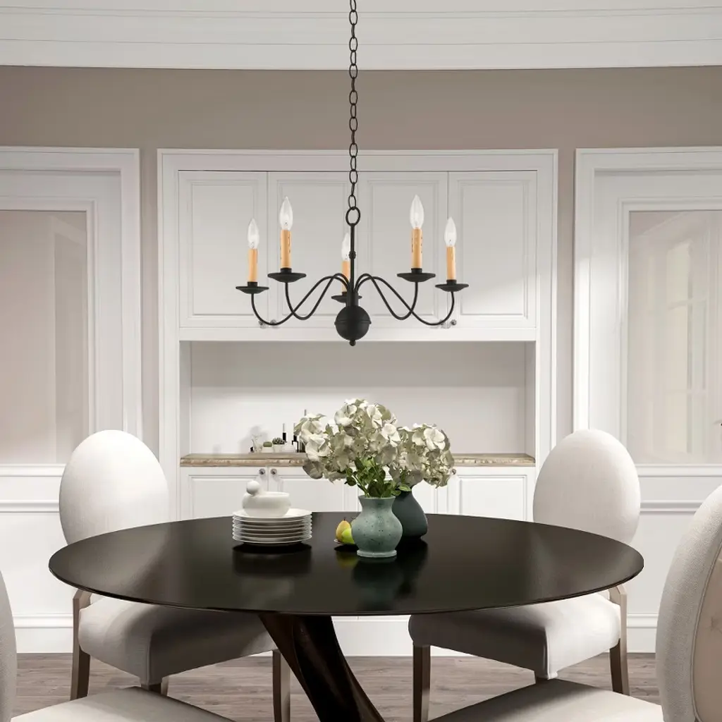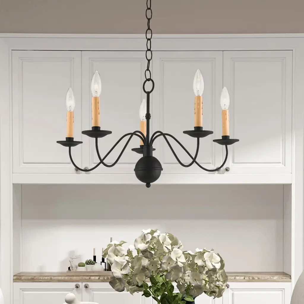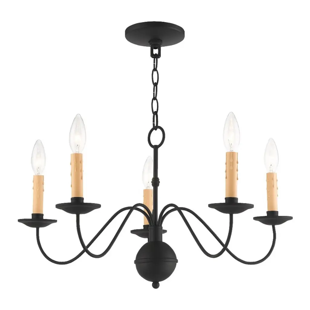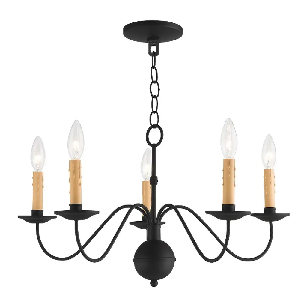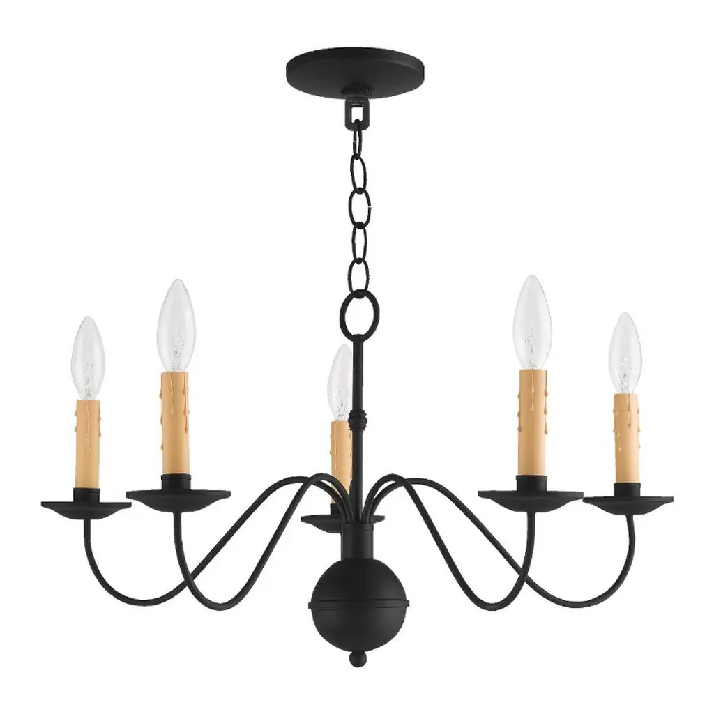 Collection: Heritage, Material: Steel, Finish Color: Black, Width: 24", Height: 13", Hanging Method: Chain, Chain Length: 36", Lamping Type: Incandescent, Number Of Bulbs: 5, Wattage: 300 Watts, Moisture Rating: Dry Rated, Desc: The clean design of this steel construction five light chandelier enhanced with a black finish. The sweeping arms create a slim silhouette from which the candelabra bulbs emit their soft, romantic glow. Its informal, transitional beauty works well with many room decor schemes.,