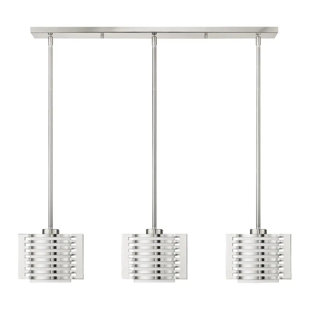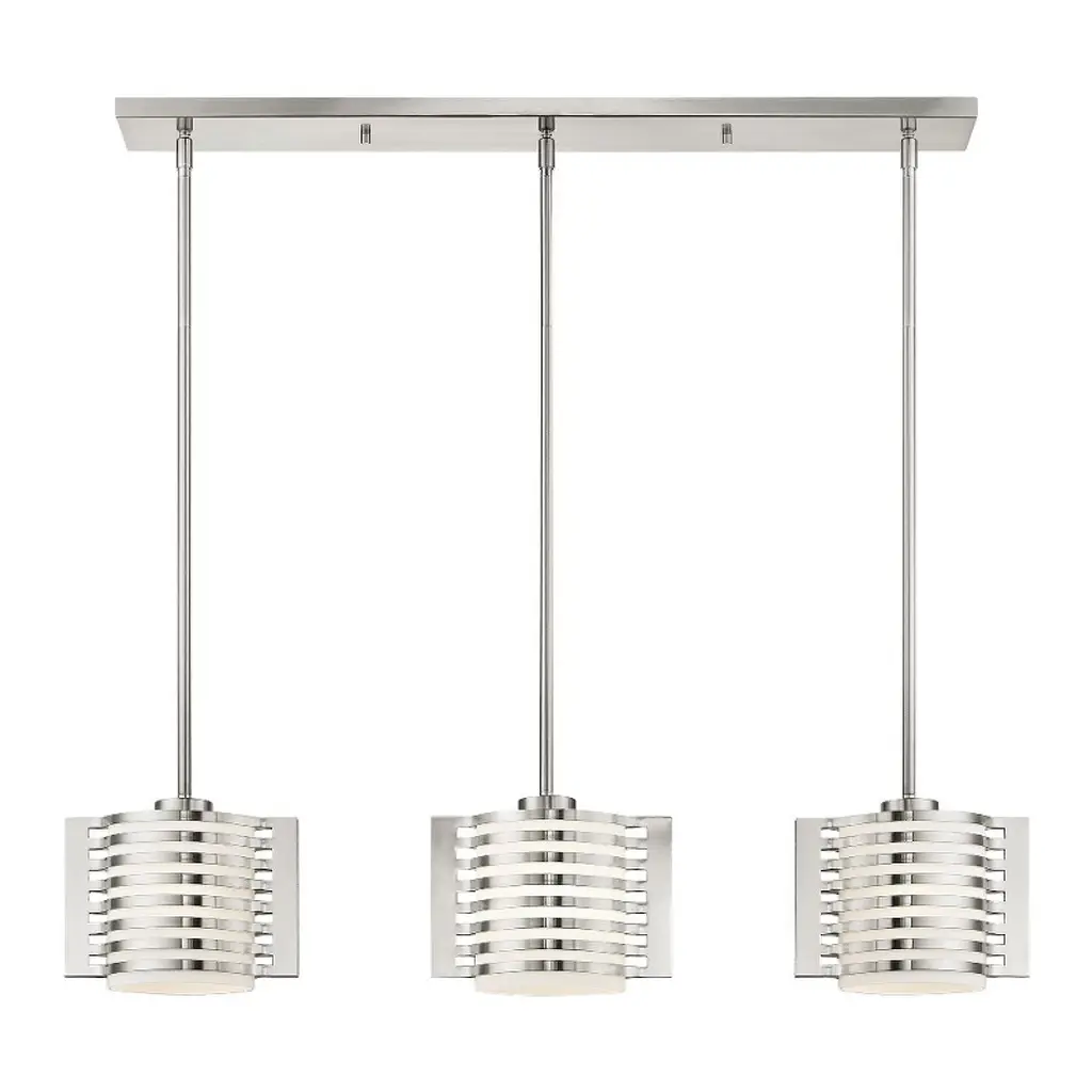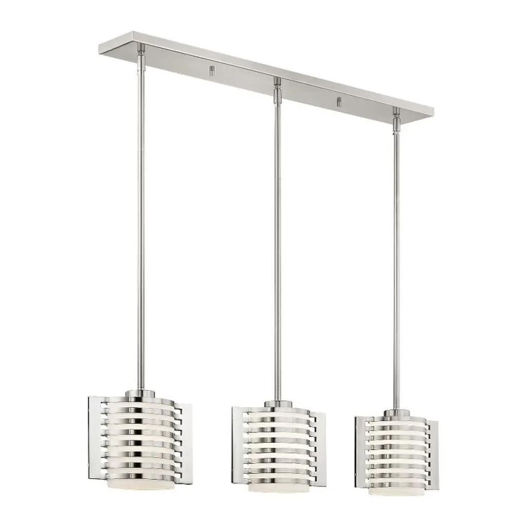 Collection: Hilliard, Material: Steel, Finish Color: Brushed Nickel, Width: 4.5", Height: 9.25", Length: 36.5", Hanging Method: Stem, Lamping Type: Incandescent, Number Of Bulbs: 3, Wattage: 300 Watts, Moisture Rating: Dry Rated, Desc: Combine a modern style with a bold aesthetic by adding this designer, polished chrome three light linear pendant to your home. Sleek polished chrome surround a satin opal white glass, creating a dimensional look and feel.,