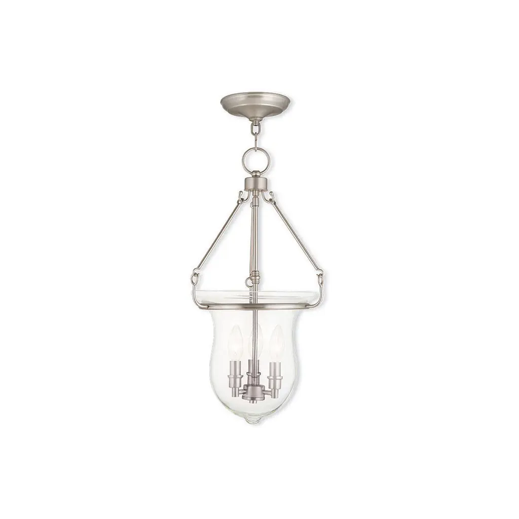 Collection: Jefferson, Material: Steel, Finish Color: Brushed Nickel, Width: 12", Height: 25", Hanging Method: Chain, Chain Length: 36", Lamping Type: Incandescent, Number Of Bulbs: 3, Wattage: 180 Watts, Moisture Rating: Damp Rated, Desc: Carrying the vision of rich opulence, the Jefferson has evolved through times remaining a focal point of richness and affluence. From visions of old time class to modern day elegance, the bell jar remains a favorite in several settings of the home. Using hand blown clear glass...the possibilities are endless to find a piece that matches your desired personality and vision. Canopy Included: Yes / Shade Included: Yes / Canopy Diameter: 6.00. ,