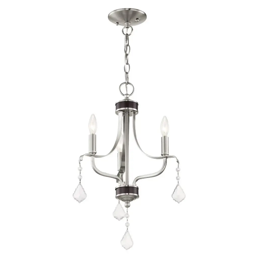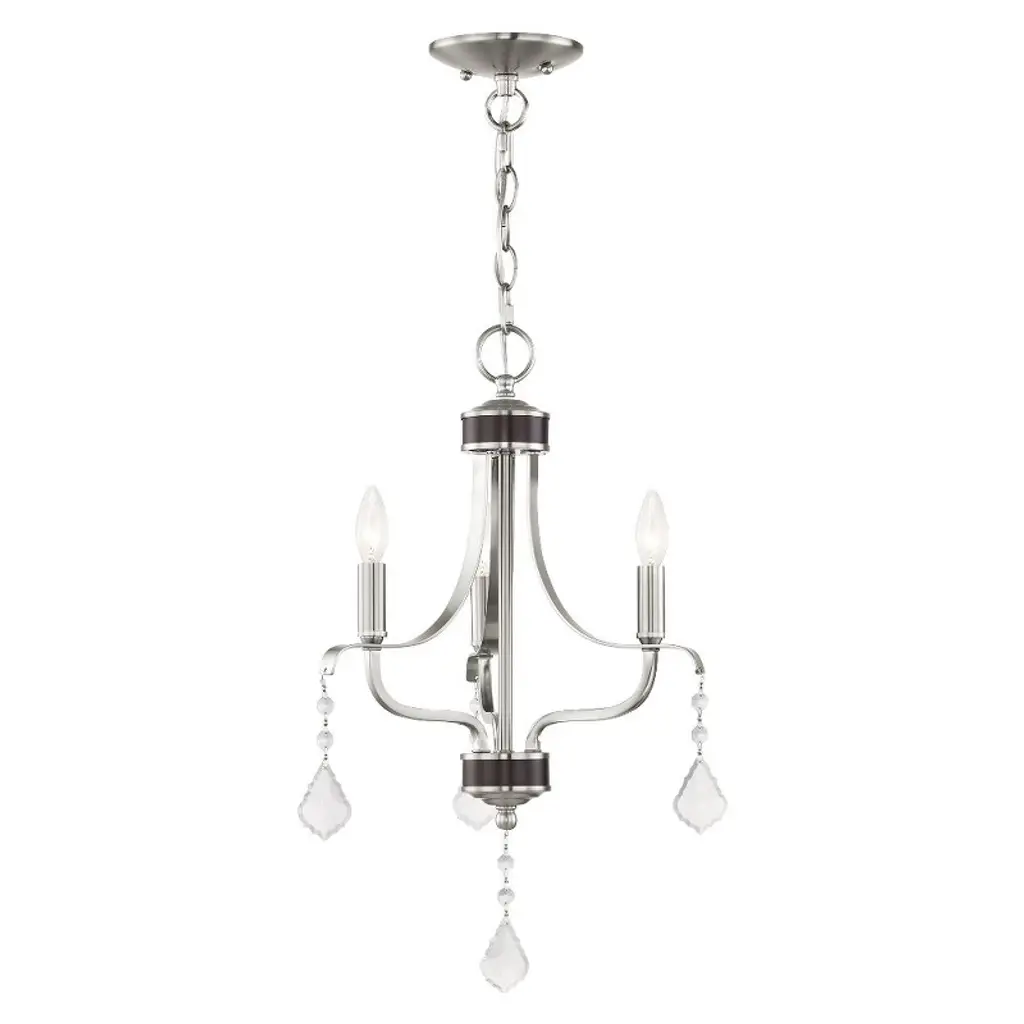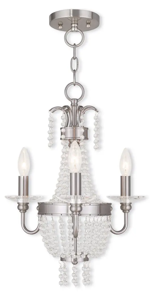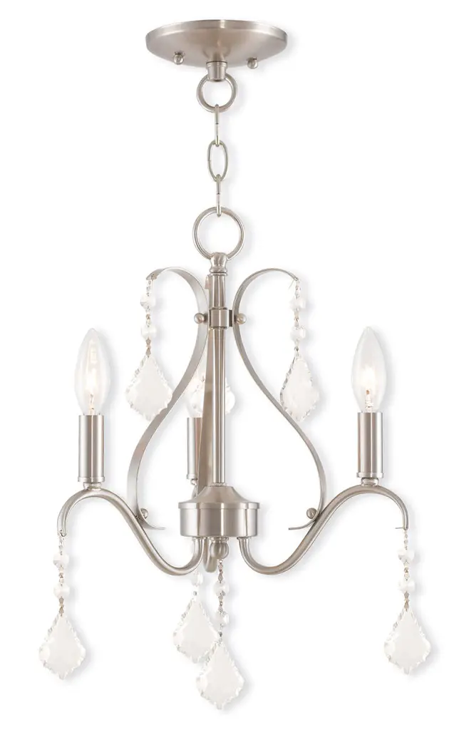 Collection: Laurel, Material: Steel, Finish Color: Brushed Nickel, Width: 13", Height: 20", Hanging Method: Chain, Chain Length: 36", Lamping Type: Incandescent, Number Of Bulbs: 3, Wattage: 180 Watts, Moisture Rating: Dry Rated, Desc: Faceted clear crystals drop beautifully from the transitional, scrolling form of this three light mini chandelier. The design is beautiful and appealing, with a brushed nickel finish. This mini chandelier is perfect for any room in your house. Canopy Included: Yes / Canopy Diameter: 5.00. ,