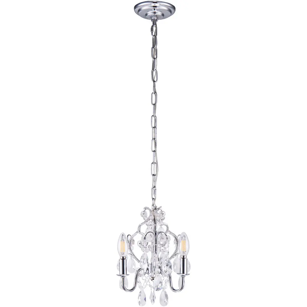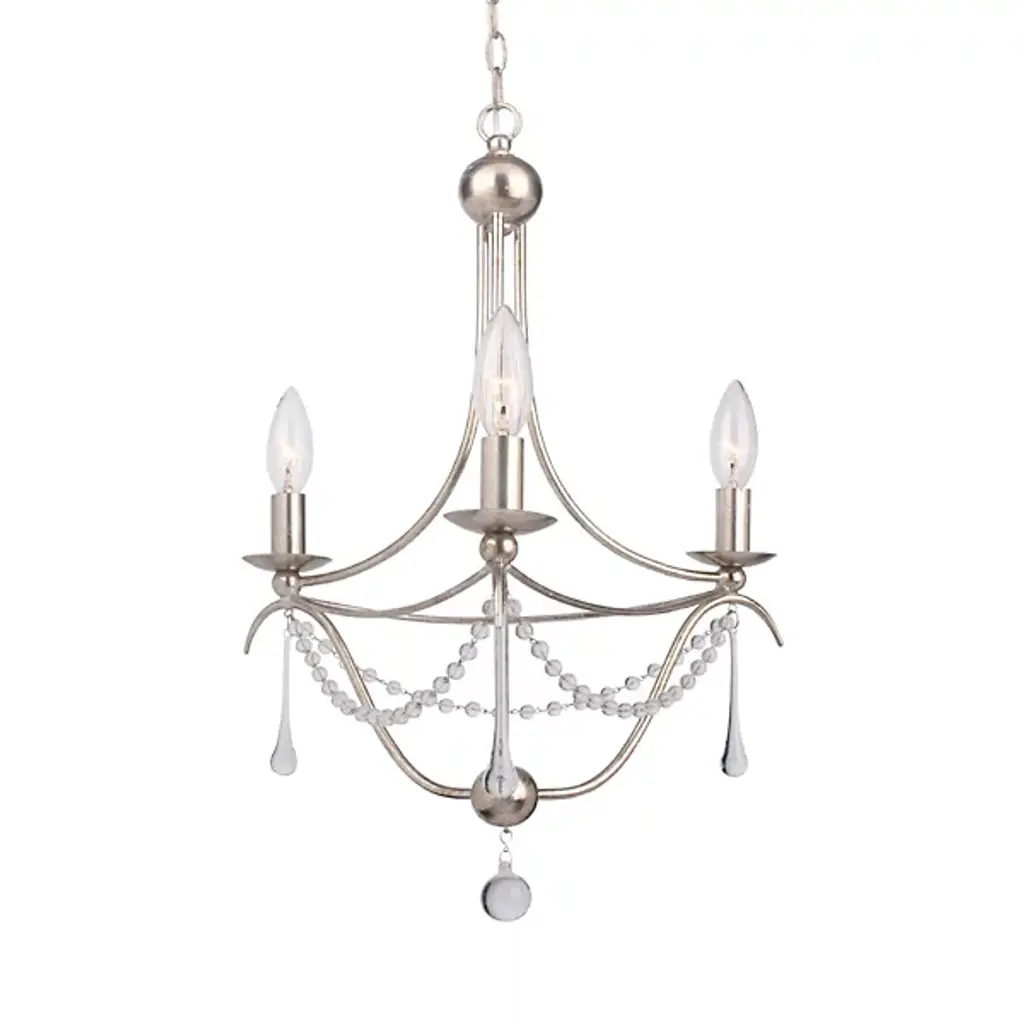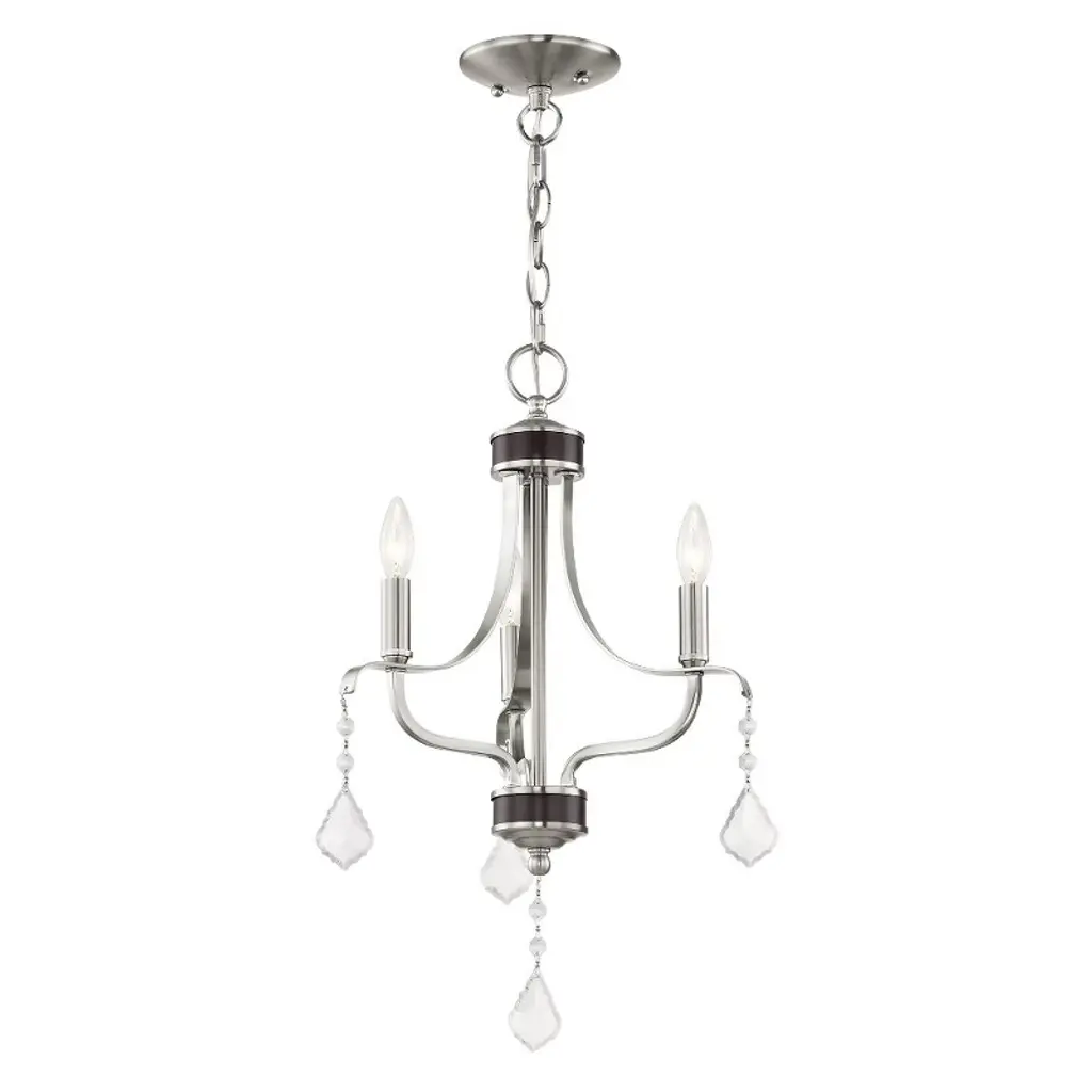 Collection: Laurel, Material: Steel, Finish Color: Brushed Nickel, Width: 13", Height: 20", Hanging Method: Chain, Chain Length: 36", Lamping Type: Incandescent, Number Of Bulbs: 3, Wattage: 180 Watts, Moisture Rating: Dry Rated, Desc: Faceted clear crystals drop beautifully from the transitional, scrolling form of this three light mini chandelier. The design is beautiful and appealing, with a brushed nickel finish. This mini chandelier is perfect for any room in your house. Canopy Included: Yes / Canopy Diameter: 5.00. ,