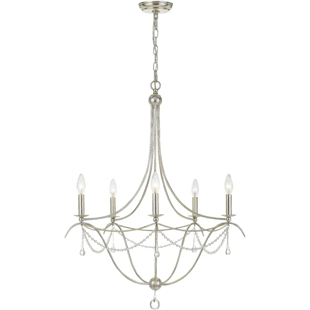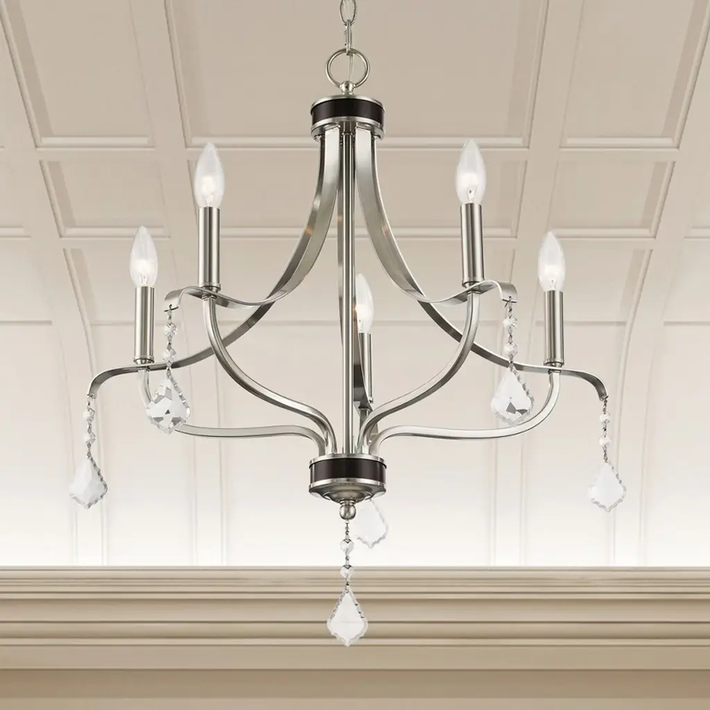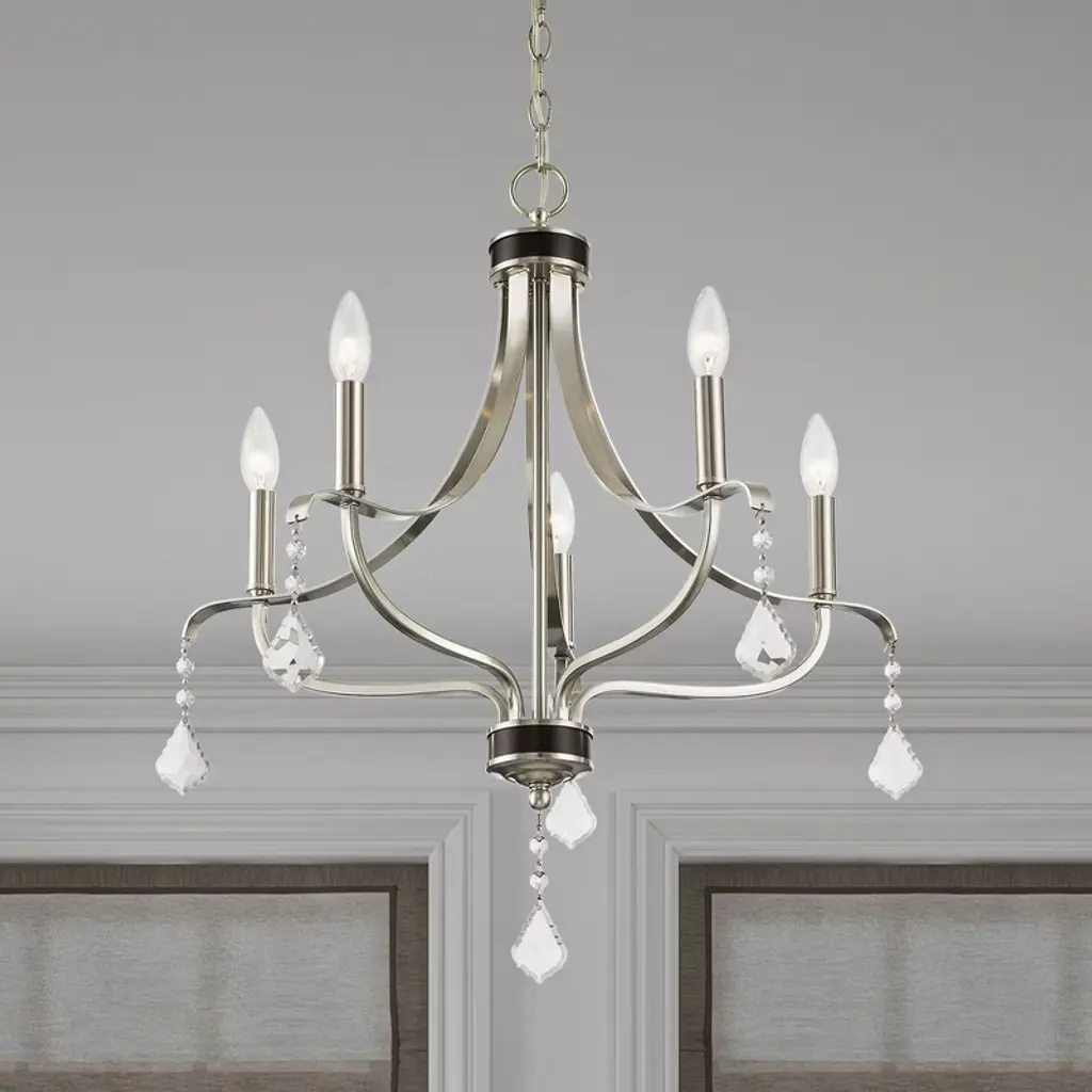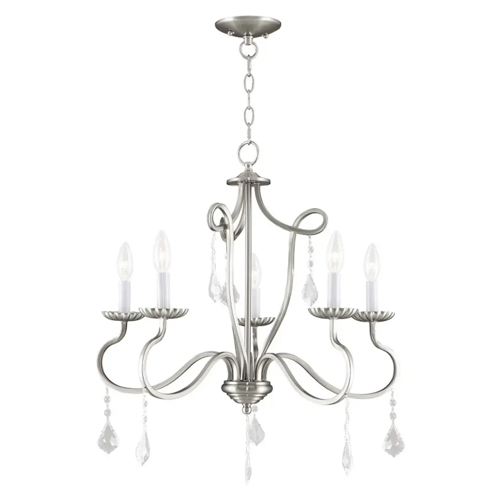 Collection: Laurel, Material: Steel, Finish Color: Brushed Nickel, Width: 24", Height: 26.5", Hanging Method: Chain, Chain Length: 36", Lamping Type: Incandescent, Number Of Bulbs: 5, Wattage: 300 Watts, Moisture Rating: Dry Rated, Desc: Faceted clear crystals drop beautifully from the transitional, scrolling form of this five light chandelier. The design is beautiful and appealing, with a brushed nickel finish. This chandelier is perfect for any room in your house.,