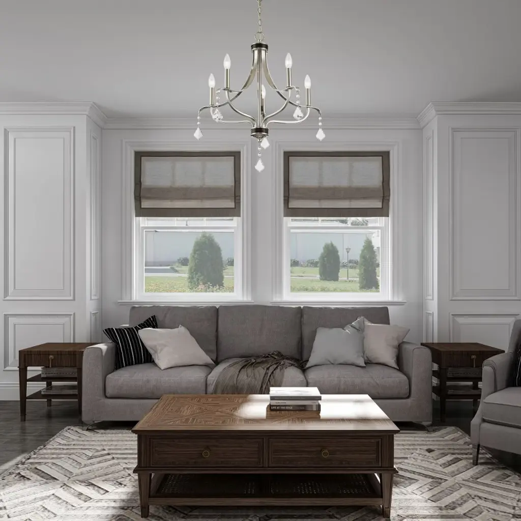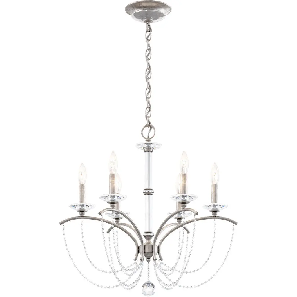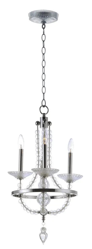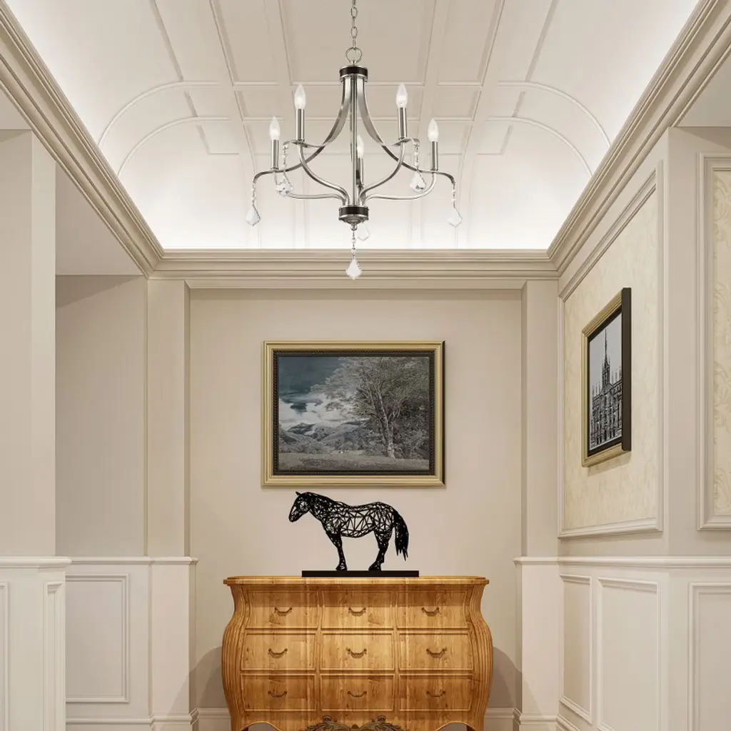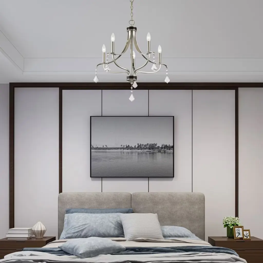 Collection: Laurel, Material: Steel, Finish Color: Brushed Nickel, Width: 24", Height: 26.5", Hanging Method: Chain, Chain Length: 36", Lamping Type: Incandescent, Number Of Bulbs: 5, Wattage: 300 Watts, Moisture Rating: Dry Rated, Desc: Faceted clear crystals drop beautifully from the transitional, scrolling form of this five light chandelier. The design is beautiful and appealing, with a brushed nickel finish. This chandelier is perfect for any room in your house.,