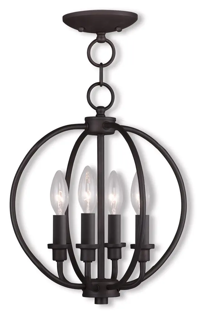 Collection: Milania, Material: Steel, Finish Color: Bronze, Width: 12.5", Height: 14.5", Hanging Method: Chain, Chain Length: 36", Lamping Type: Incandescent, Number Of Bulbs: 4, Wattage: 240 Watts, Moisture Rating: Dry Rated, Desc: Add fresh style to an entryway, dining room and more. Clean, elegant curves define this handsome pendant design. Inspired by classic cottage and continental style lighting, it comes in an brushed nickel finish on the orb shaped frame and canopy. Canopy Included: Yes / Canopy Diameter: 5.00. ,