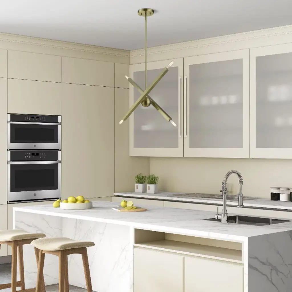 Collection: Monaco, Material: Steel, Finish Color: Antique Brass, Width: 6", Height: 19.5", Length: 28", Hanging Method: Stem, Lamping Type: Incandescent, Number Of Bulbs: 4, Wattage: 240 Watts, Moisture Rating: Dry Rated, Desc: The Monaco collection inherits the multidirectional lines inspired by the Sputnik. The exposed bulbs glimmer at the end of each rectangular arm to create a touch of understated glamour for today�s modern spaces. The timeless design will add a sense of airiness and motion to any room. This four-light chandelier would look great suspended in a living room, a modern dining room, a kitchen or a bedroom. It is presented in an antique brass finish.,