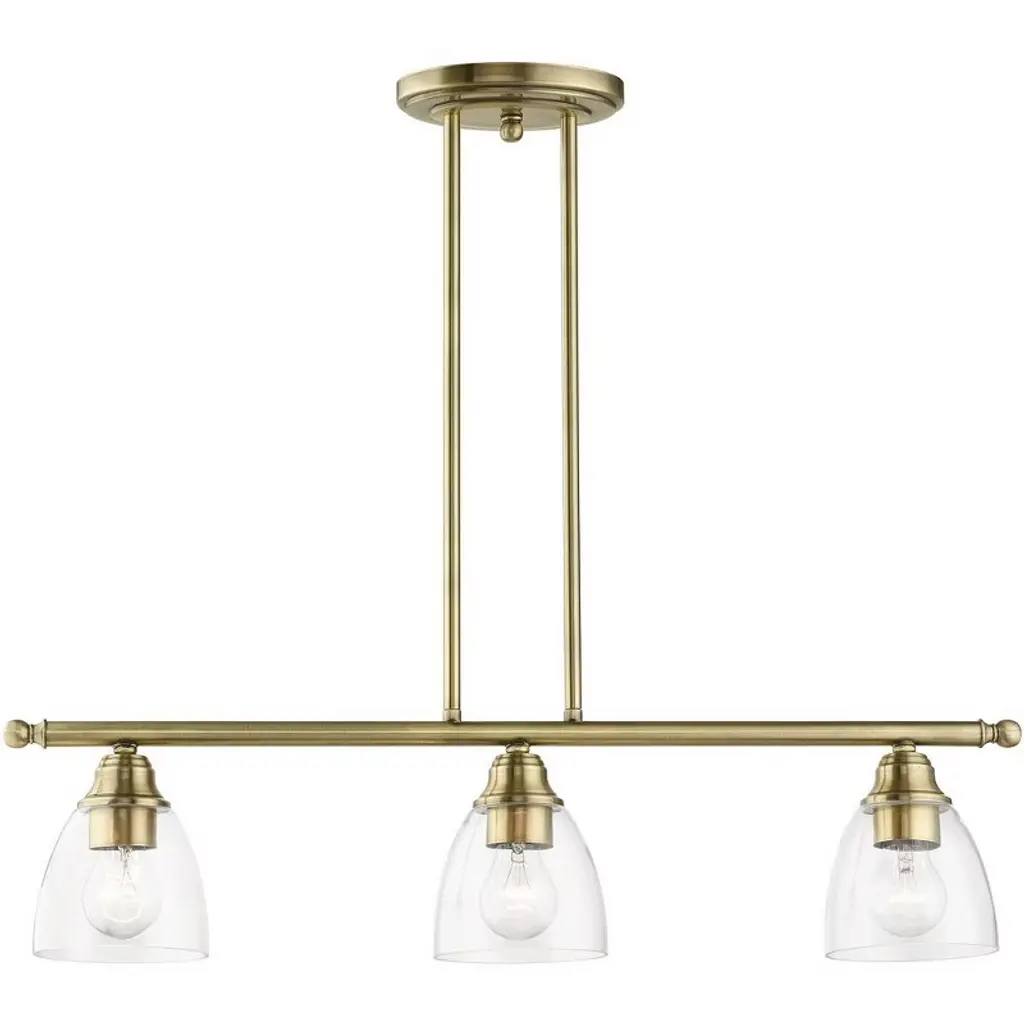 Collection: Montgomery, Material: Steel, Finish Color: Antique Brass, Width: 5", Height: 14.25", Length: 30", Hanging Method: Stem, Lamping Type: Incandescent, Number Of Bulbs: 3, Wattage: 300 Watts, Moisture Rating: Dry Rated, Desc: Whether it's style or practical lighting, this linear chandelier is the perfect addition to your kitchen island or dining room. This three-light island fixture from the Montgomery Collection features clear hand-blown glass shades and is shown in an antique brass finish. The clean graceful lines of this piece complement the shade, creating a transitional look that works well in most decors. Classic elegance combines with contemporary appeal to enhance any home in style.,