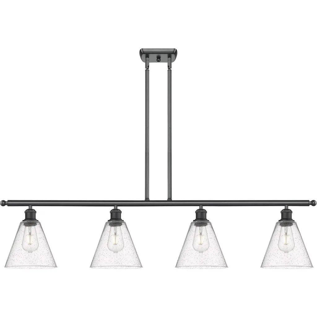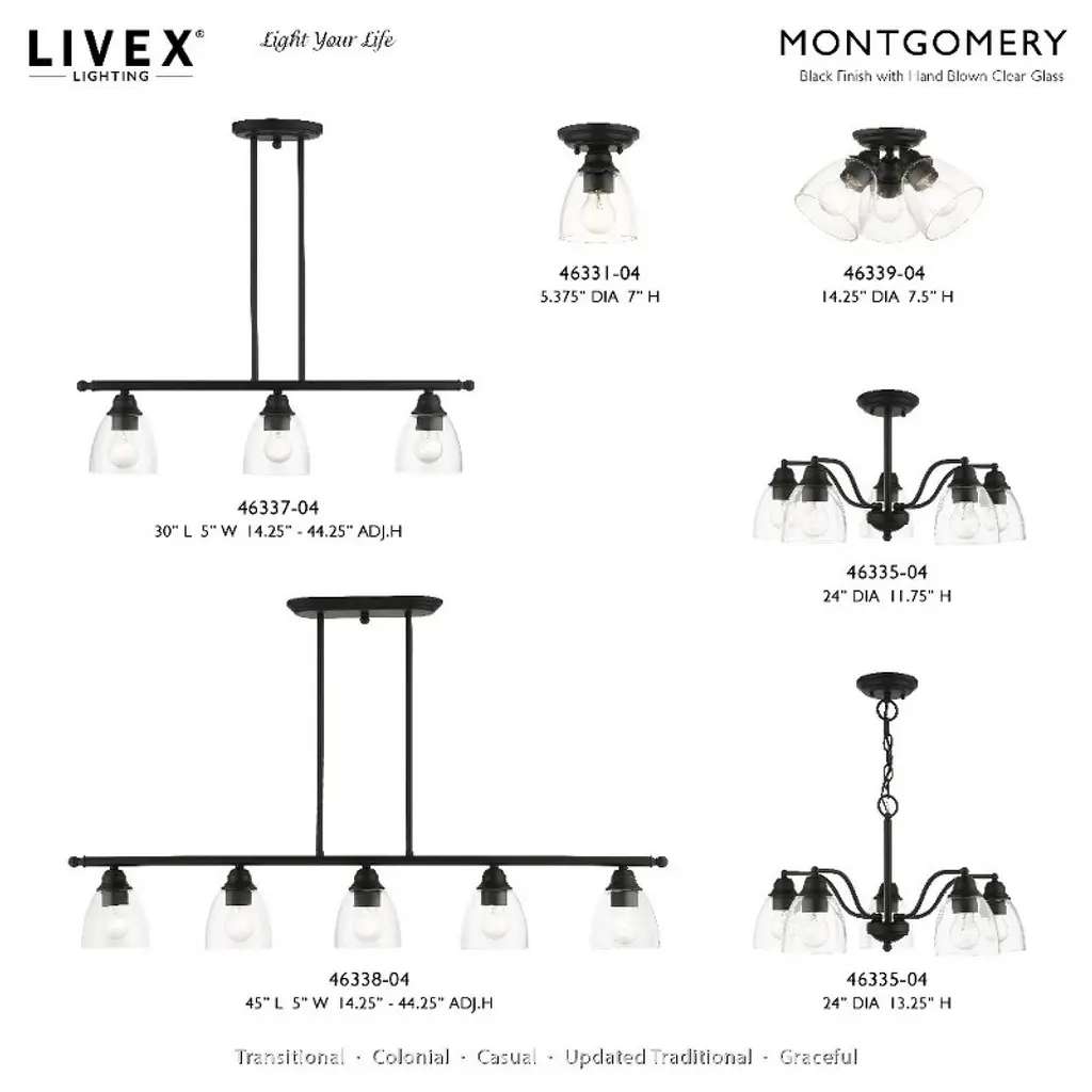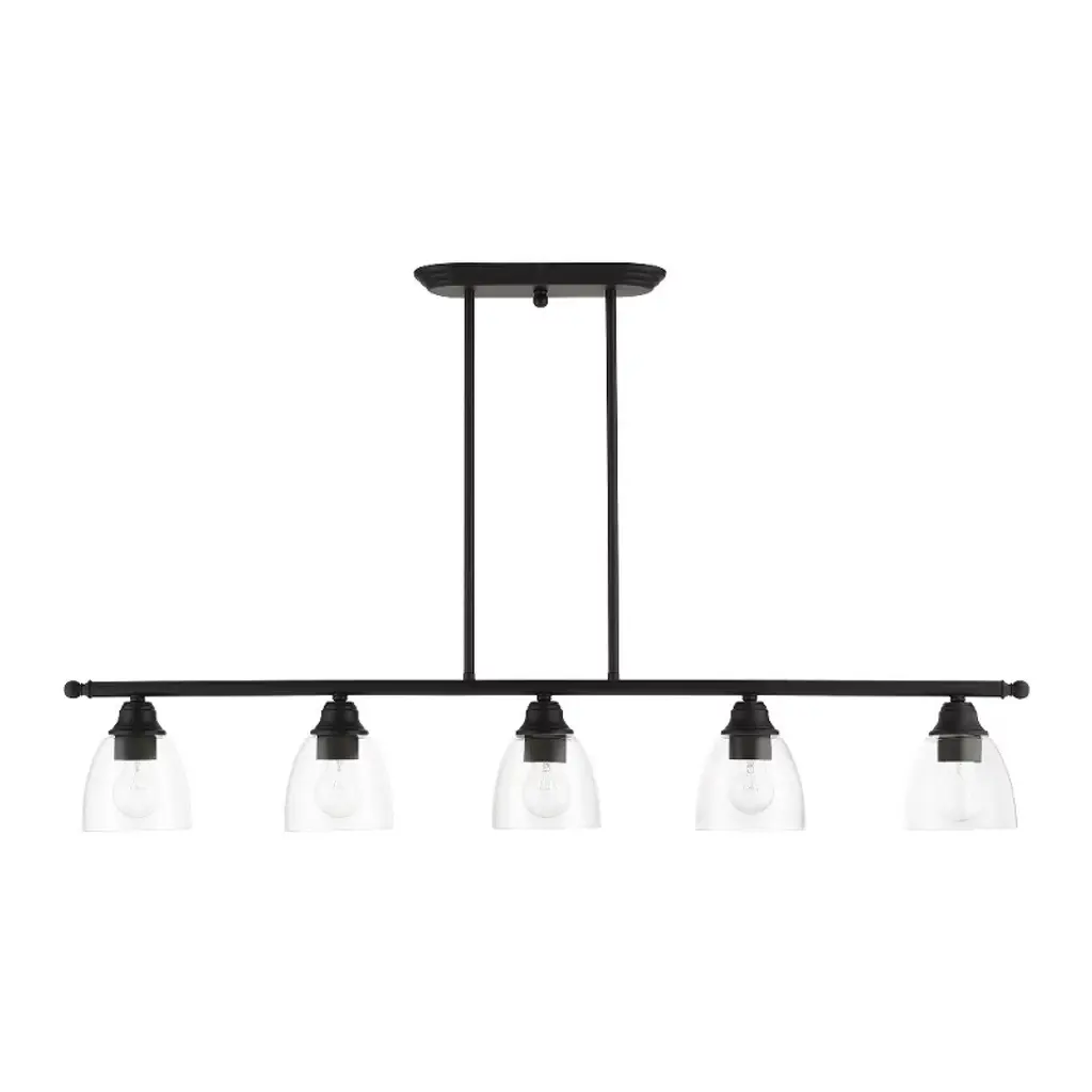 Collection: Montgomery, Material: Steel, Finish Color: Black, Width: 5", Height: 14.25", Length: 45", Hanging Method: Stem, Lamping Type: Incandescent, Number Of Bulbs: 5, Wattage: 500 Watts, Moisture Rating: Dry Rated, Desc: Whether it's style or practical lighting, this linear chandelier is the perfect addition to your kitchen island or dining room. This five-light island fixture from the Montgomery Collection features clear hand-blown glass shades and is shown in a black finish. The clean graceful lines of this piece complement the shade, creating a transitiol look that works well in most decors. Classic elegance combines with contemporary appeal to enhance any home in style. No. of Rods: 6 / Canopy Included: Yes / Shade Included: Yes / Canopy Diameter: 11.75 x 4.63 x 1 / Rod Length(s): 18.00. ,