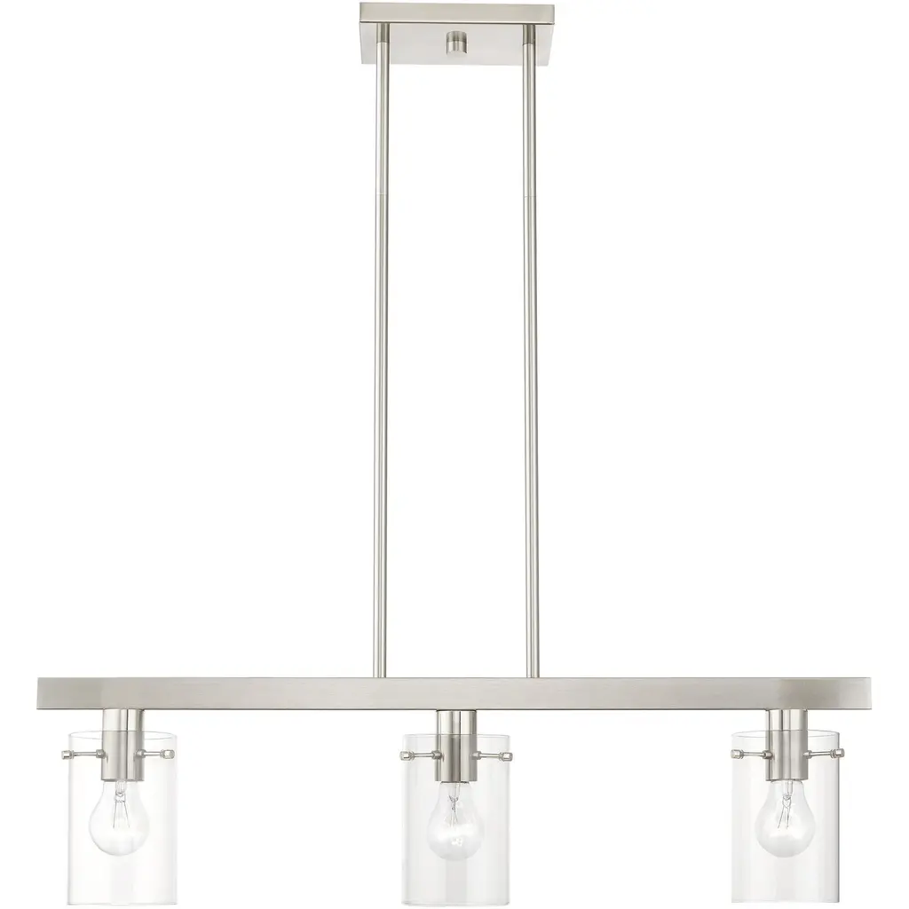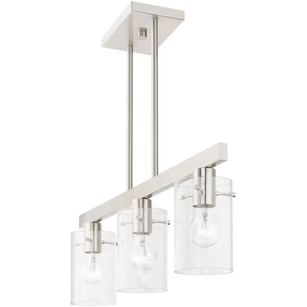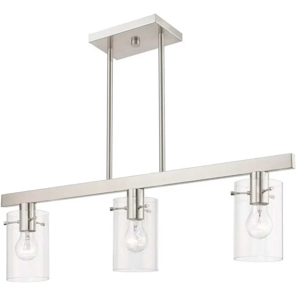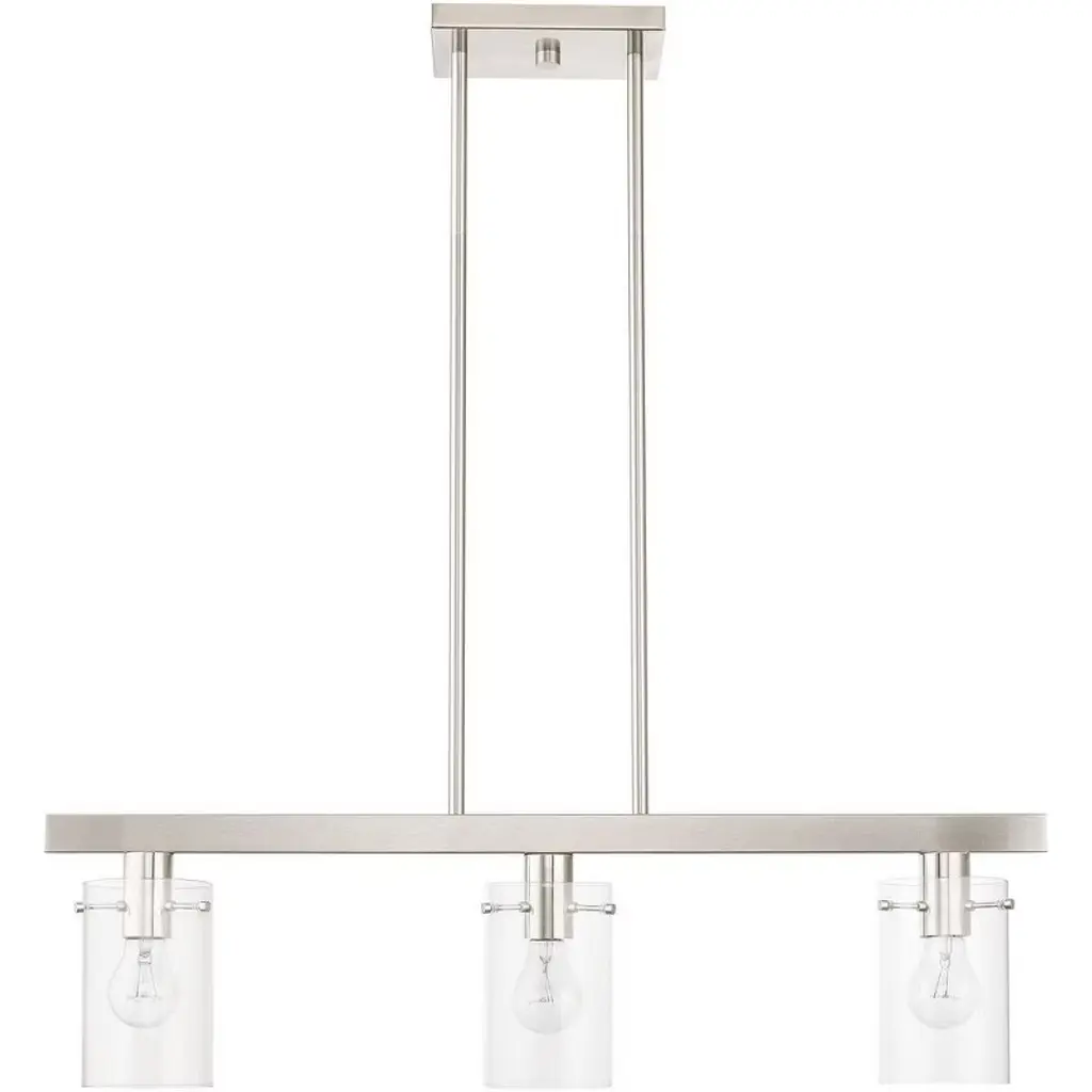 Collection: Munich, Material: Steel, Finish Color: Brushed Nickel, Width: 4.5", Height: 14.5", Length: 30", Hanging Method: Stem, Lamping Type: Incandescent, Number Of Bulbs: 3, Wattage: 180 Watts, Moisture Rating: Dry Rated, Desc: Illuminate your home with a bright design from the Munich collection. This three-light down linear chandelier features a black chrome finish with clear glass. Perfect for a contemporary or transitional luxury kitchen or dining room setting.,