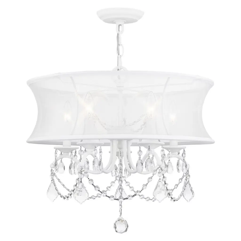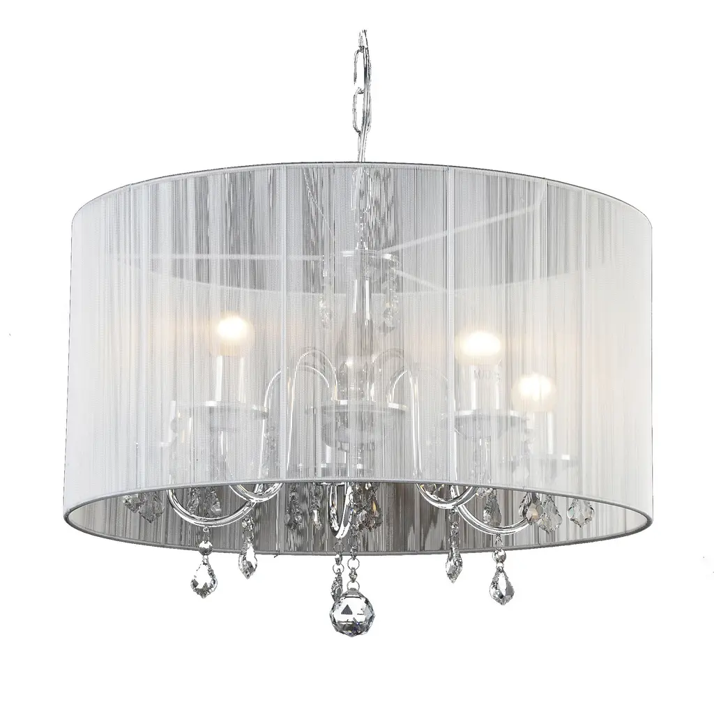 Collection: Newcastle, Material: Steel, Finish Color: Brushed Nickel, Width: 16", Height: 17.75", Chain Length: 36", Lamping Type: Incandescent, Number Of Bulbs: 4, Wattage: 60 Watts, Moisture Rating: Damp Rated, Desc: Add glamour to your home with this enchanting shaded chandelier. Scrolling arms adorned in a white finish are paired with glittering crystal drops that reflect light when illuminated. A white handmade silk shimmer shade completes this chic design. Canopy Included: Yes / Shade Included: Yes / Canopy Diameter: 5.00. ,