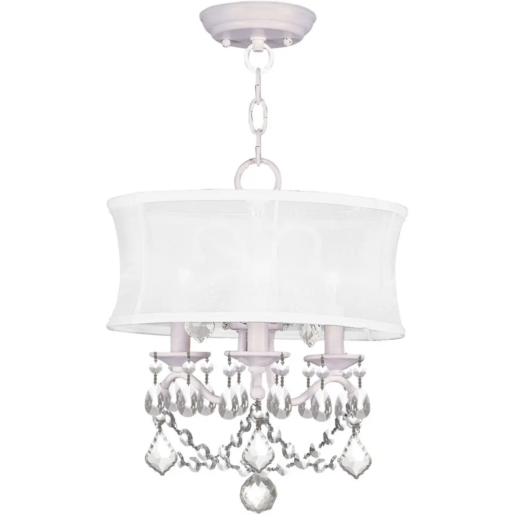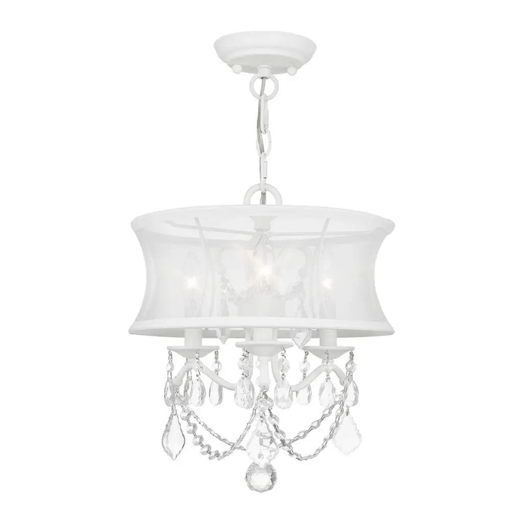 Collection: Newcastle, Material: Steel, Finish Color: White, Width: 20", Height: 18.5", Hanging Method: Chain, Chain Length: 36", Lamping Type: Incandescent, Number Of Bulbs: 5, Wattage: 300 Watts, Moisture Rating: Dry Rated, Desc: Add glamour to your home with this enchanting shaded chandelier. Scrolling arms adorned in a brushed nickel finish are paired with glittering crystal drops that reflect light when illuminated. A white handmade silk shimmer shade completes this chic design. Canopy Included: Yes / Shade Included: Yes / Canopy Diameter: 5.00. ,