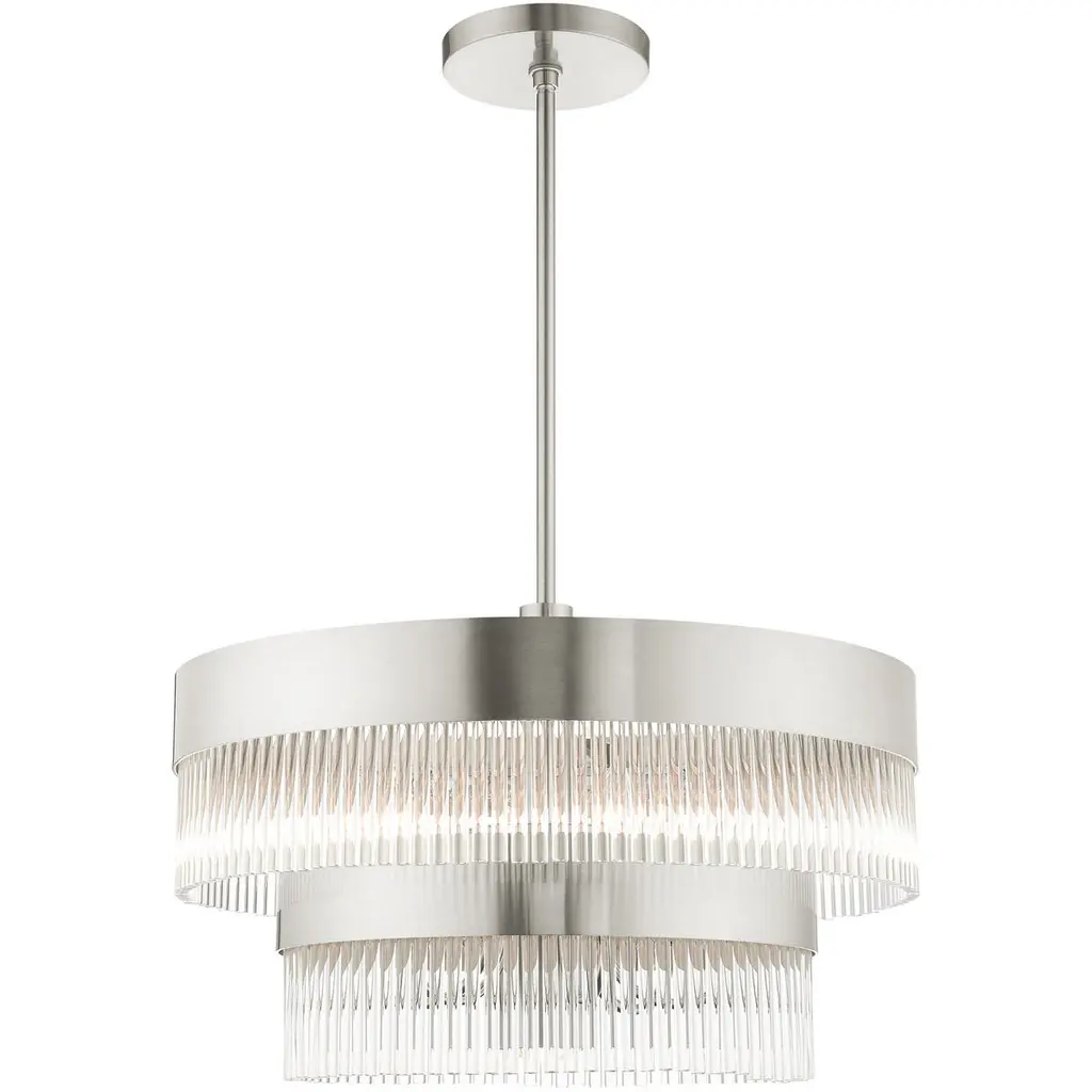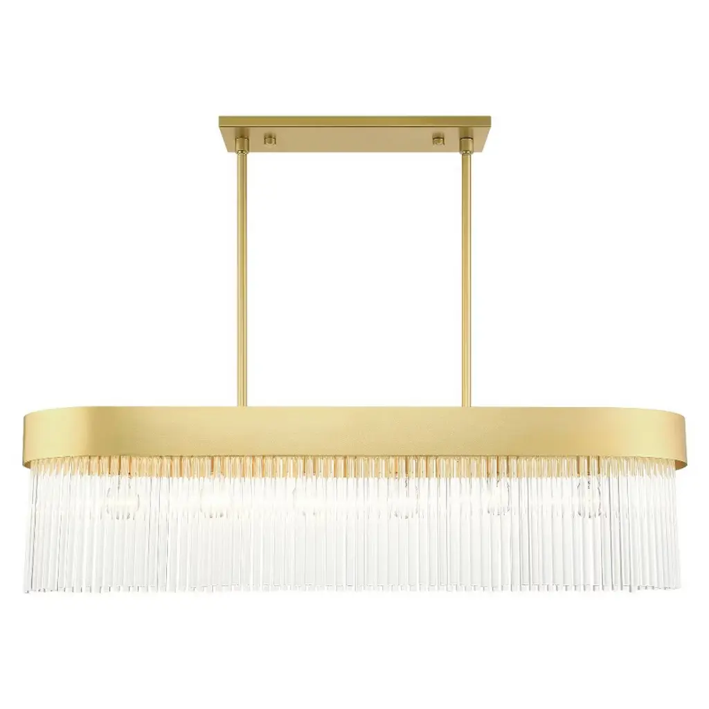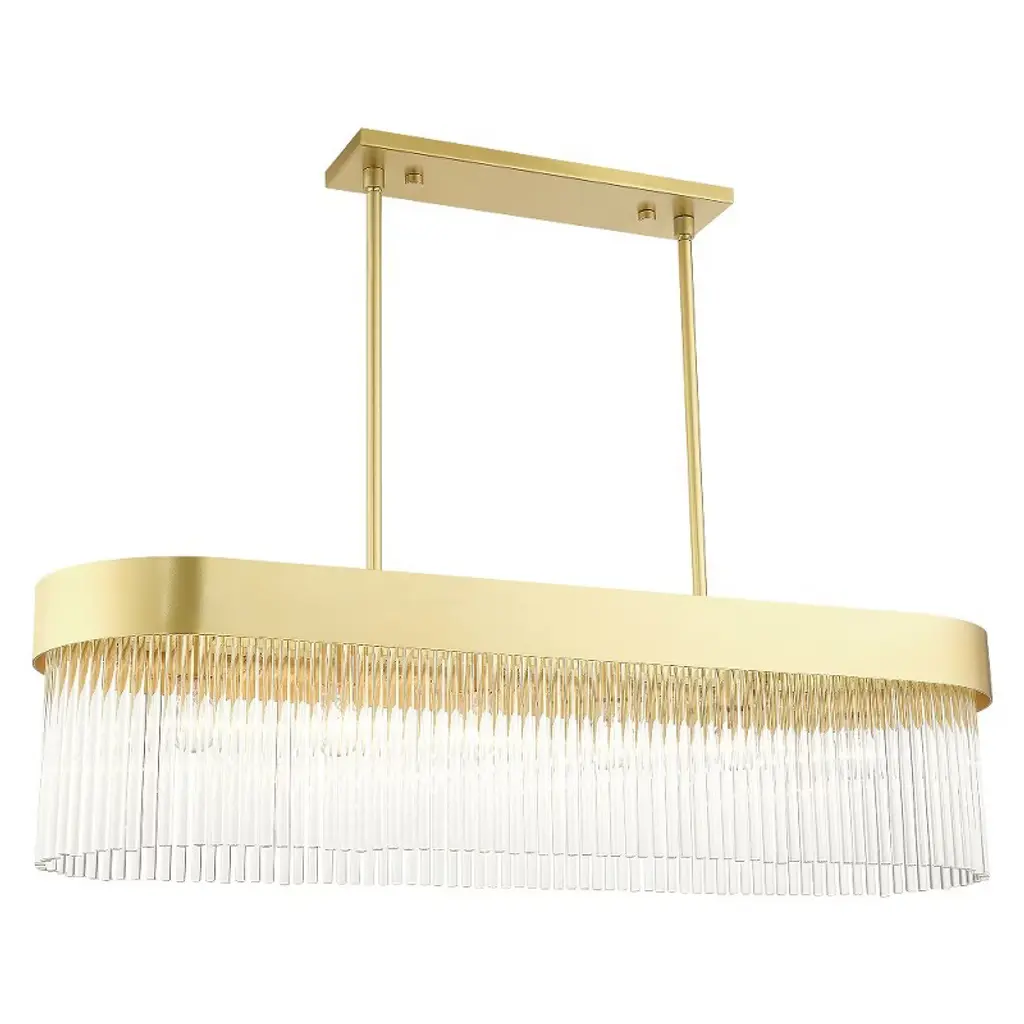 Collection: Norwich, Material: Steel, Finish Color: Soft Gold, Width: 12", Height: 18.5", Length: 42", Hanging Method: Stem, Lamping Type: Incandescent, Number Of Bulbs: 6, Wattage: 360 Watts, Moisture Rating: Dry Rated, Desc: The Norwich six-light large linear crystal chandelier will become an attention-grabbing feature in your modern home decor. The soft gold finish graces the design with elegance and charm, providing a timeless and glamorous quality to any interior. The clear crystal rods give the sconce a sleek and attractive appearance. No. of Rods: 6 / Canopy Included: Yes / Shade Included: Yes / Canopy Diameter: 17.75 x 4.75 x 0.75 / Rod Length(s): 18.00. ,