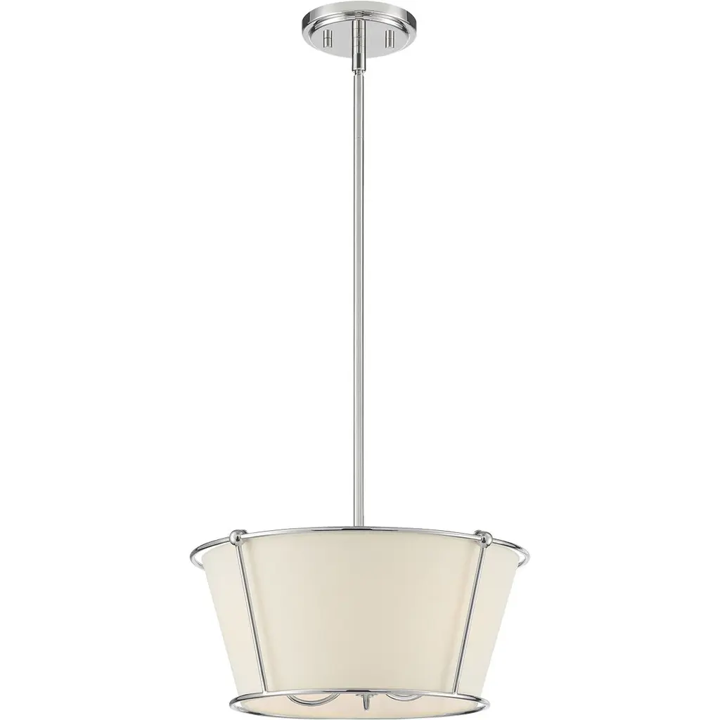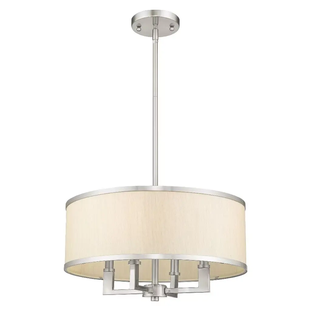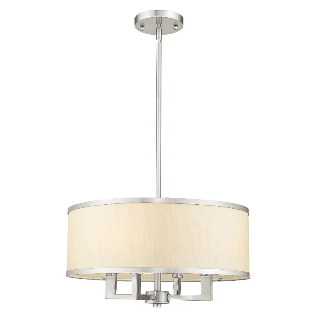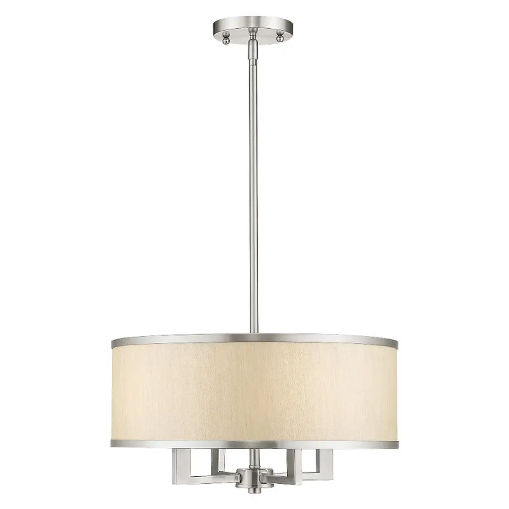 Collection: Park Ridge, Material: Steel, Finish Color: Brushed Nickel, Width: 18", Height: 18", Lamping Type: Incandescent, Number Of Bulbs: 4, Wattage: 60 Watts, Moisture Rating: Damp Rated, Desc: Update your decor with this sleek pendant light design. The angular frame comes in a brushed nickel finish which nicely complements the hand crafted champagne hardback shade. No. of Rods: 3 / Canopy Included: Yes / Shade Included: Yes / Canopy Diameter: 5.00 / Rod Length(s): 18.00. ,