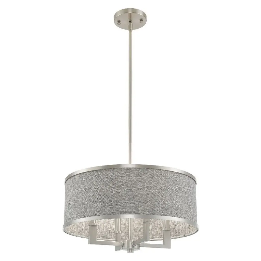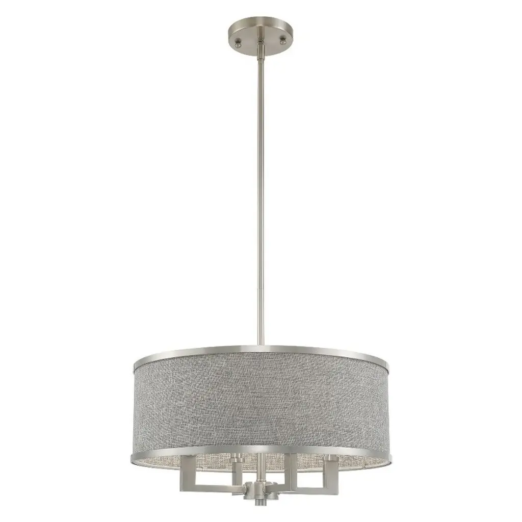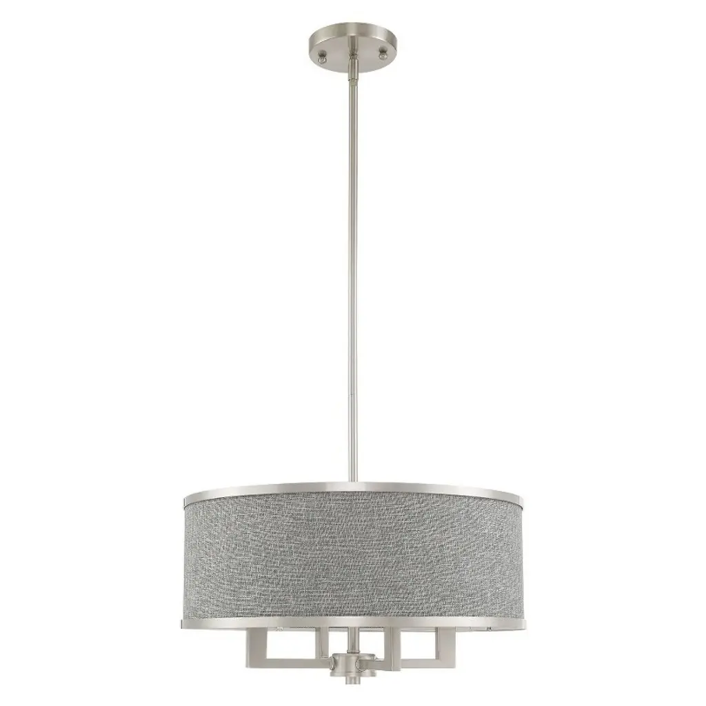 Collection: Park Ridge, Material: Steel, Finish Color: Brushed Nickel, Width: 18", Height: 18", Hanging Method: Stem, Lamping Type: Incandescent, Number Of Bulbs: 4, Wattage: 240 Watts, Moisture Rating: Dry Rated, Desc: Update your decor with this sleek pendant light design. The angular frame comes in a brushed nickel finish which nicely complements the hand crafted gray fabric hardback shade. No. of Rods: 3 / Canopy Included: Yes / Shade Included: Yes / Canopy Diameter: 5.13 / Rod Length(s): 18.00. ,