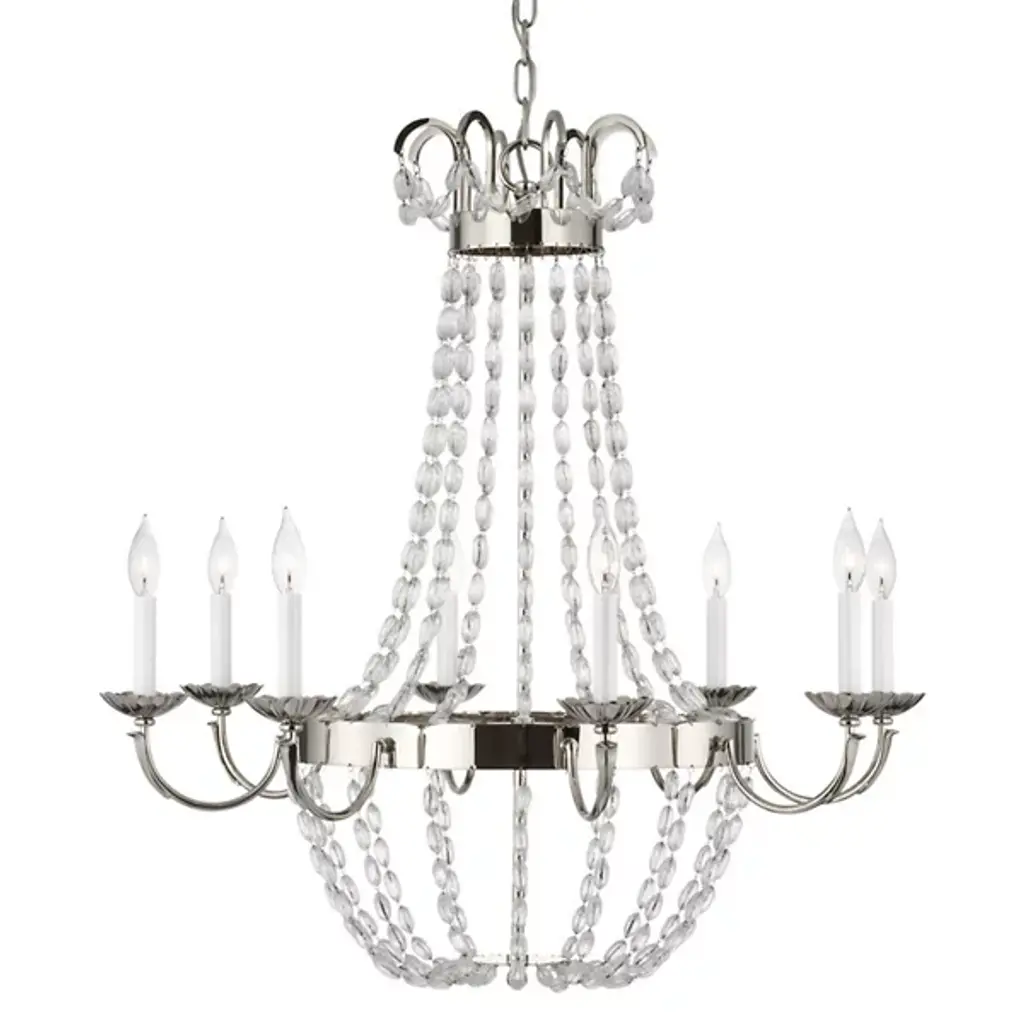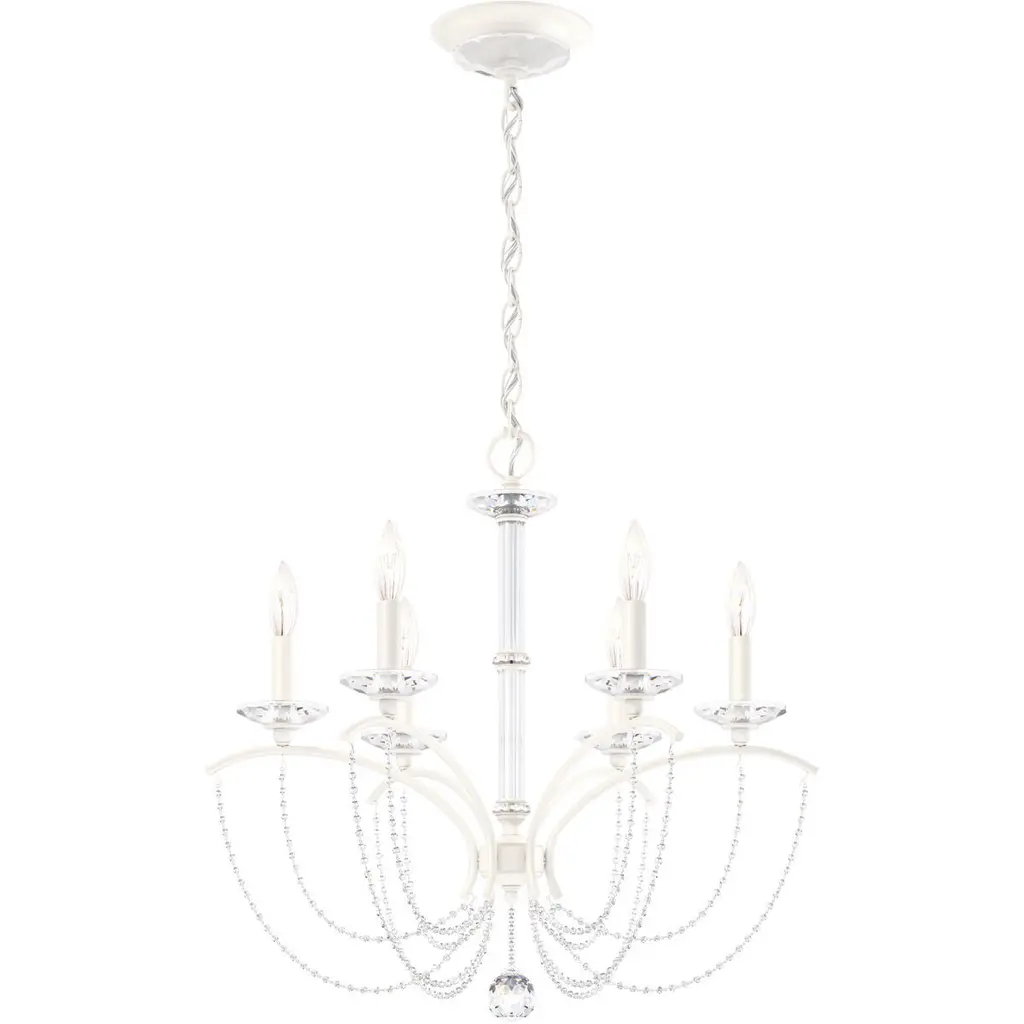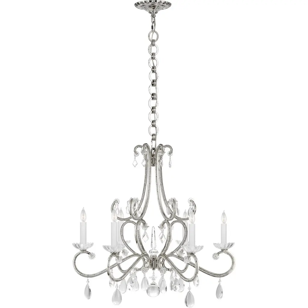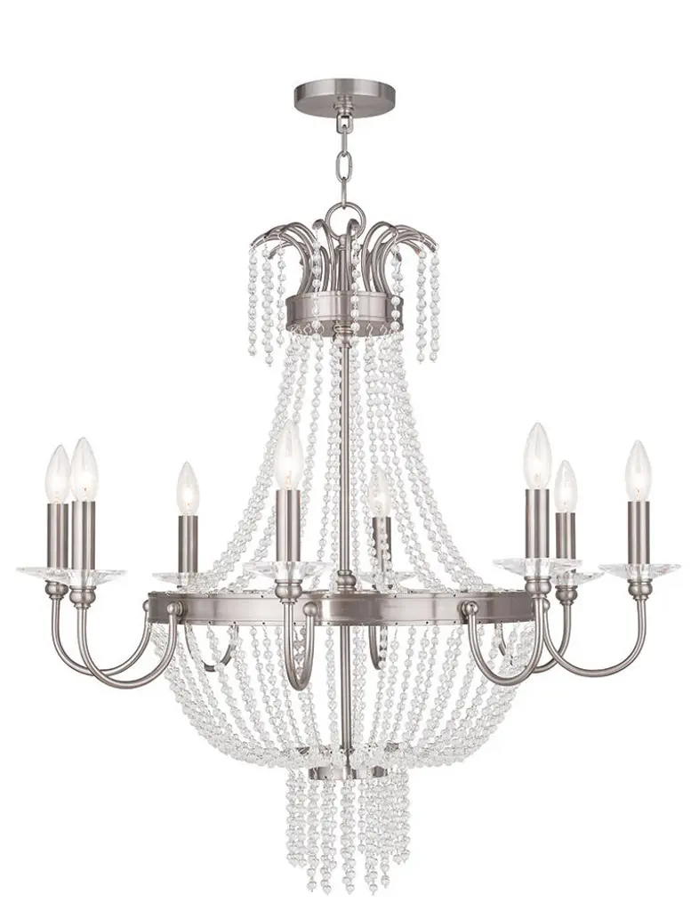 Collection: Pennington, Material: Steel, Finish Color: Brushed Nickel, Width: 28", Height: 24", Hanging Method: Chain, Chain Length: 36", Lamping Type: Incandescent, Number Of Bulbs: 6, Wattage: 360 Watts, Moisture Rating: Dry Rated, Desc: This intricately accented and masterfully forged six light chandelier is from the Pennington collection. Finish is an antique brass and features include gracefully sculpted arms and with sparkling clear crystal.,