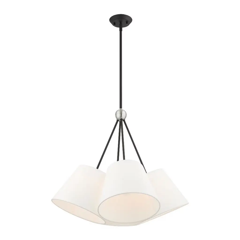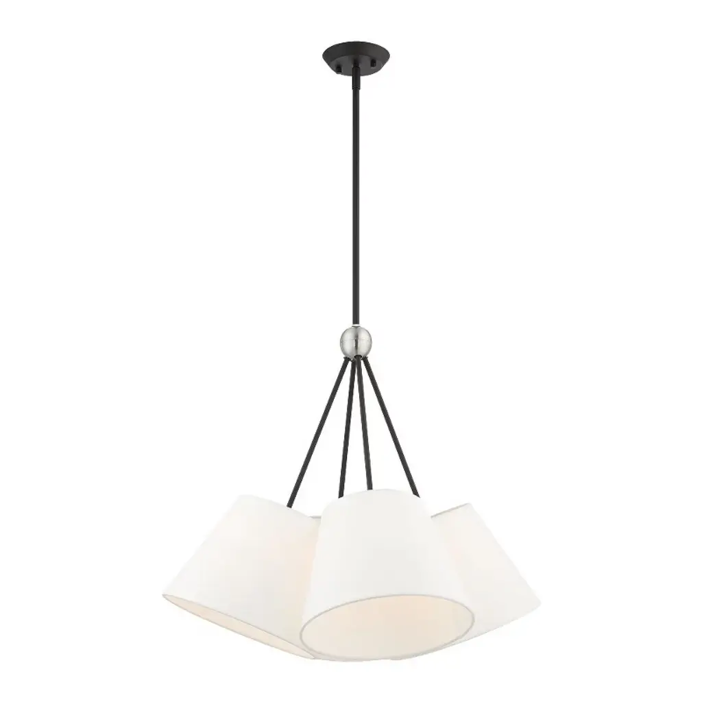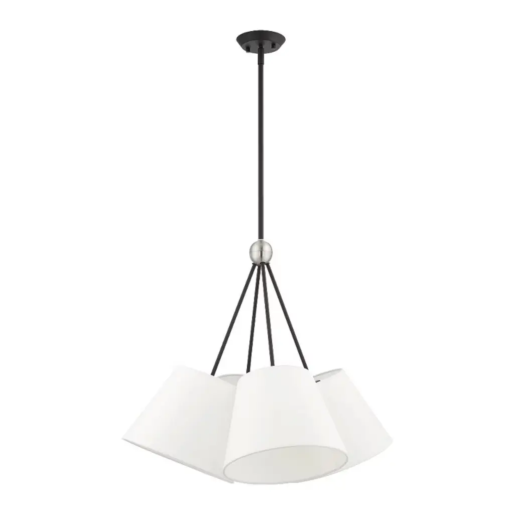 Collection: Prato, Material: Steel, Finish Color: Black, Width: 25", Height: 25.5", Hanging Method: Stem, Lamping Type: Incandescent, Number Of Bulbs: 4, Wattage: 160 Watts, Moisture Rating: Dry Rated, Desc: The Prato collection is both modern and versatile. The hand-crafted off-white colored fabric hardback shade sets a pleasant and current mood. The four-light shade cluster add character to this handsomely styled pendant. Perfect fit for the living room, dining room, kitchen and bedroom. This sleek design is shown in a black finish with a brushed nickel finish accent. No. of Rods: 3 / Canopy Included: Yes / Shade Included: Yes / Canopy Diameter: 5 x 0.75 / Rod Length(s): 18.00. ,