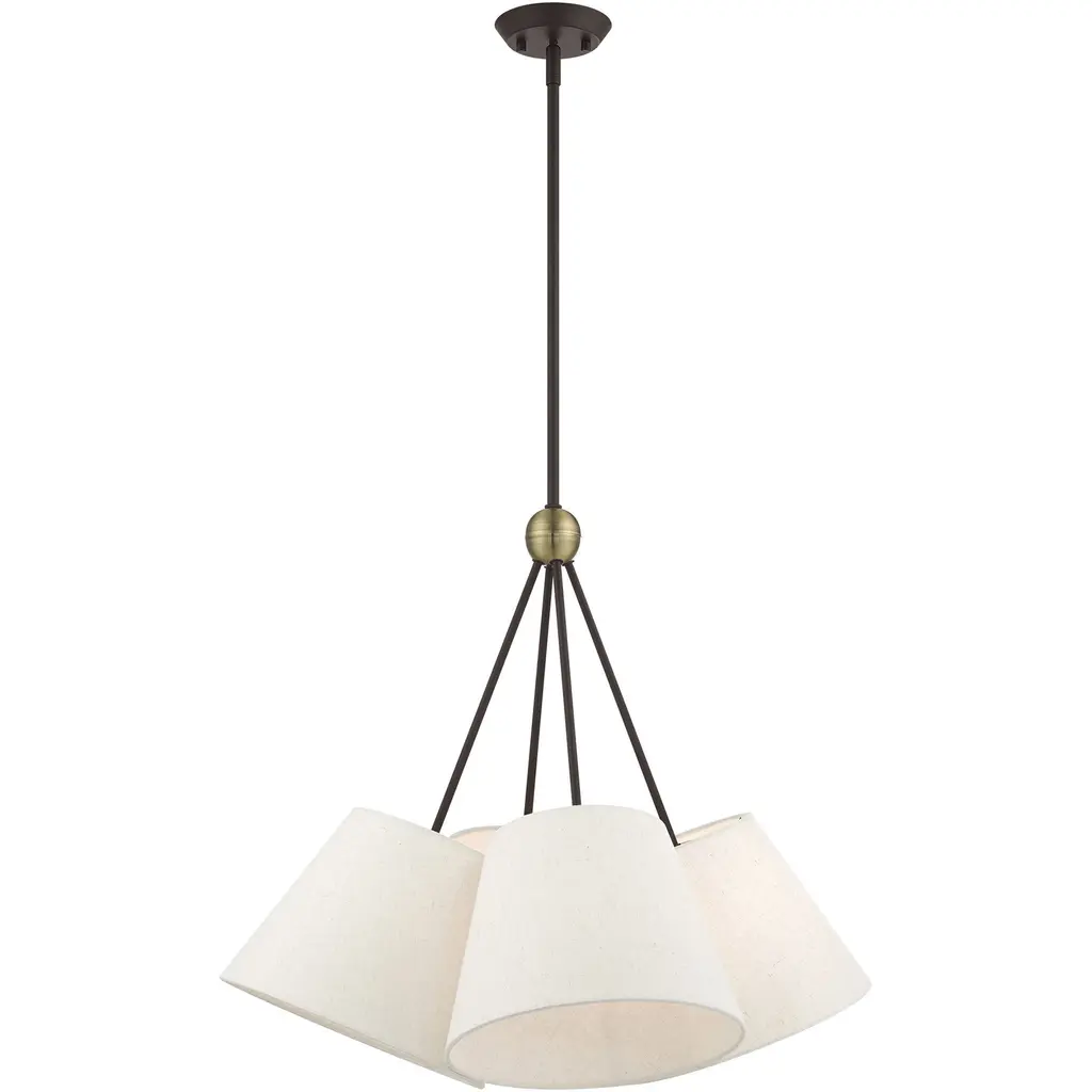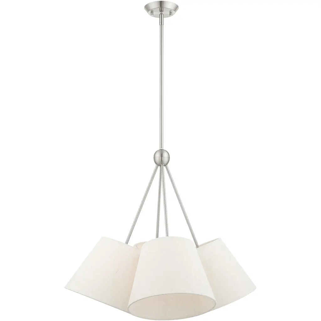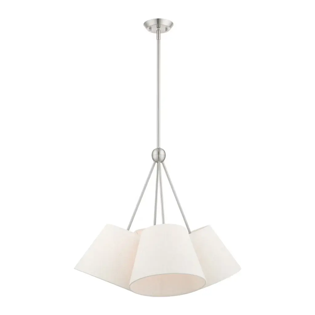 Collection: Prato, Material: Steel, Finish Color: Black, Width: 25", Height: 25.5", Hanging Method: Stem, Lamping Type: Incandescent, Number Of Bulbs: 4, Wattage: 160 Watts, Moisture Rating: Dry Rated, Desc: The Prato collection is both modern and versatile. The hand-crafted off-white colored fabric hardback shade sets a pleasant and current mood. The four-light shade cluster add character to this handsomely styled pendant. Perfect fit for the living room, dining room, kitchen and bedroom. This sleek design is shown in a black finish with a brushed nickel finish accent. No. of Rods: 3 / Canopy Included: Yes / Shade Included: Yes / Canopy Diameter: 5 x 0.75 / Rod Length(s): 18.00. ,