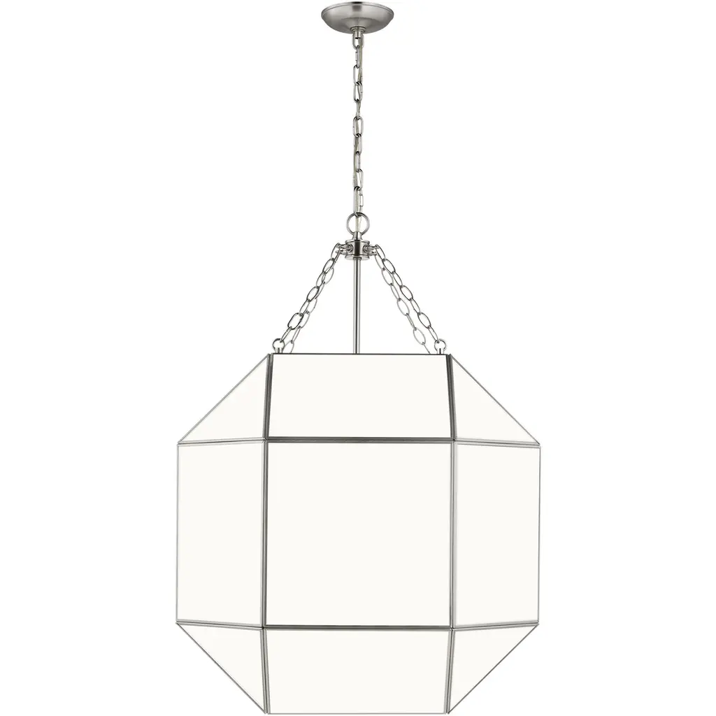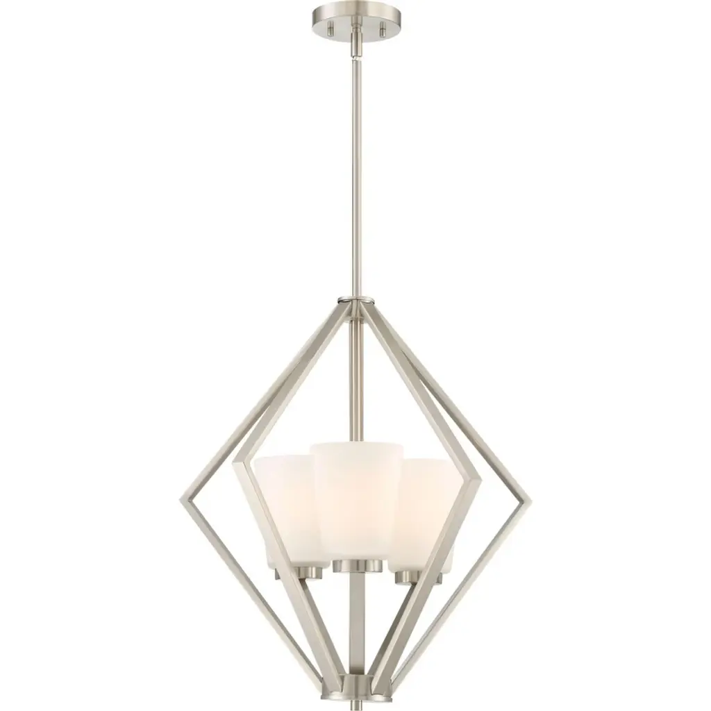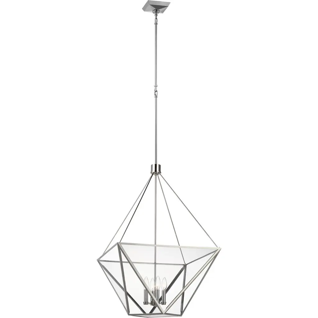 Collection: Prism, Material: Steel, Finish Color: Brushed Nickel, Width: 26", Height: 25", Hanging Method: Chain, Chain Length: 72", Lamping Type: Incandescent, Number Of Bulbs: 6, Wattage: 360 Watts, Moisture Rating: Dry Rated, Desc: Sleek and contemporary, our Prism collection is influenced by modern industrial style. This chandelier features a antique brass finish which has a striking triangular shape.,
