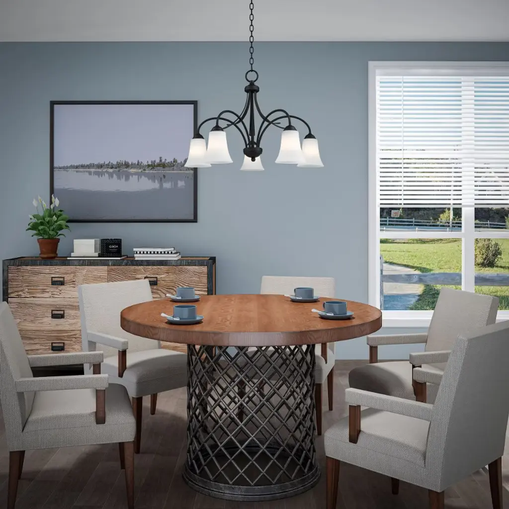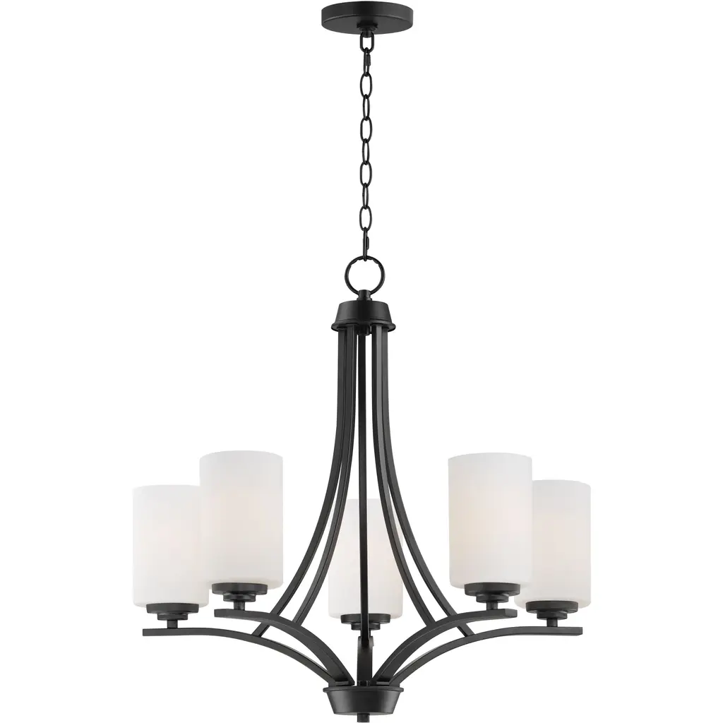 Collection: Ridgedale, Material: Steel, Finish Color: Black, Width: 25.5", Height: 17.75", Hanging Method: Chain, Chain Length: 36", Lamping Type: Incandescent, Number Of Bulbs: 5, Wattage: 500 Watts, Moisture Rating: Dry Rated, Desc: Bring a simple, yet eye-catching style into your home with this lovely chandelier. The geometric design will add interest to kitchens and breakfast nooks alike. Painted in a black finish, this design will bring light for years to come.�,