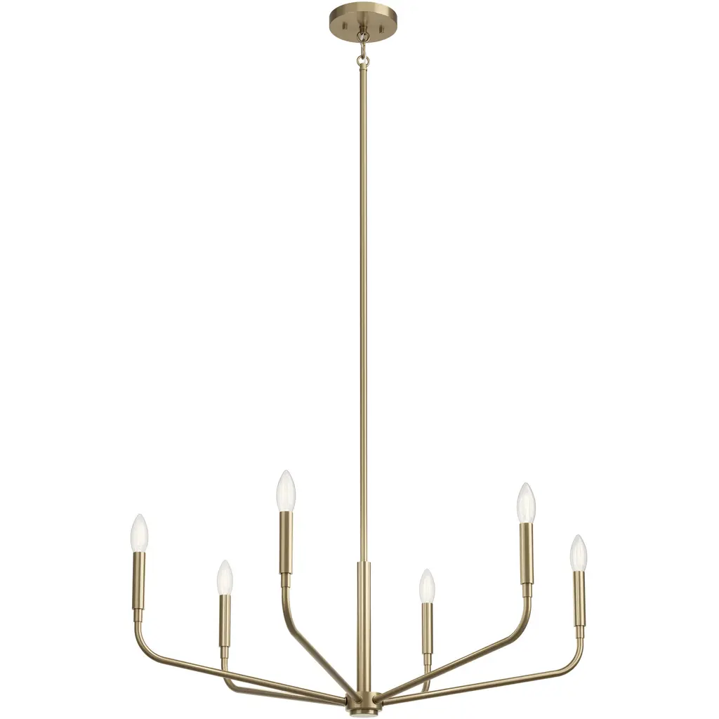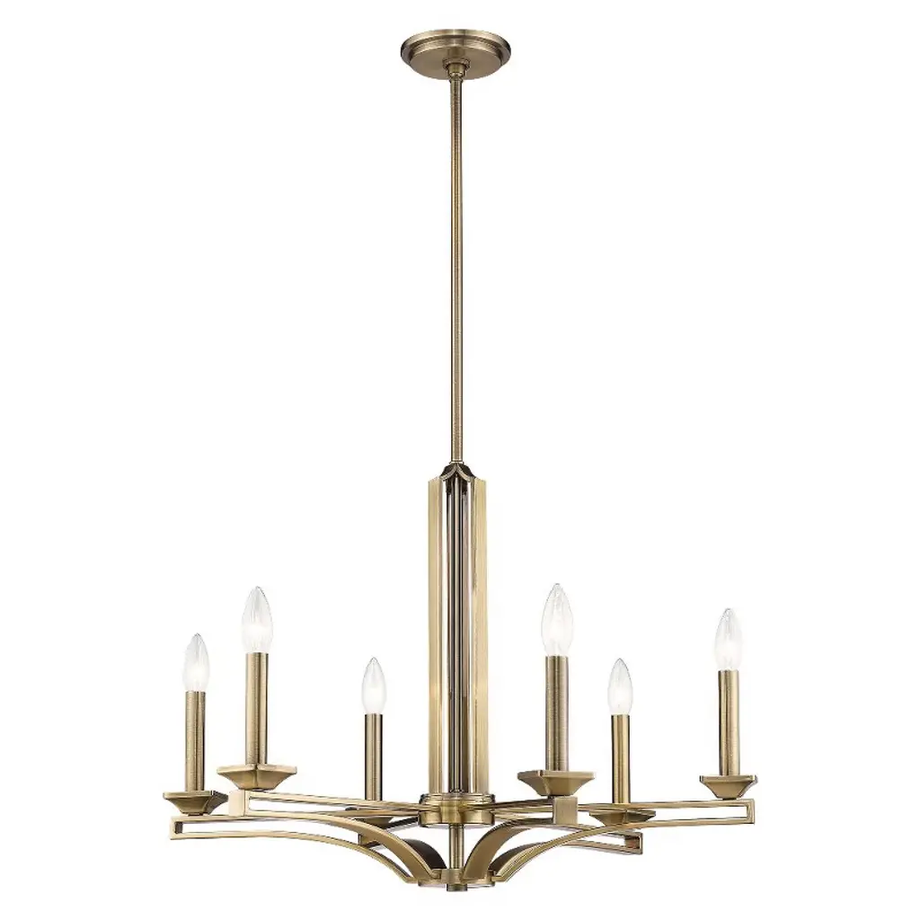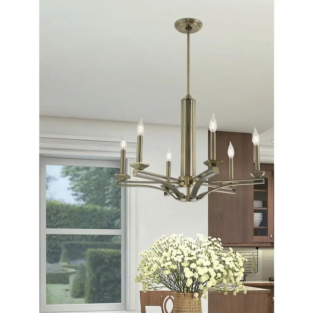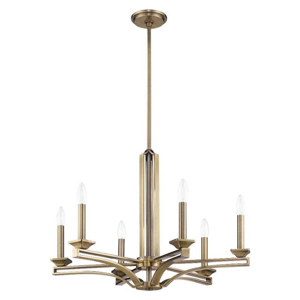 Collection: Trumbull, Material: Steel, Finish Color: Antique Brass, Width: 26", Height: 27", Hanging Method: Stem, Lamping Type: Incandescent, Number Of Bulbs: 6, Wattage: 360 Watts, Moisture Rating: Dry Rated, Desc: A stylish interpretation of simplicity is evident in the expansive Trumbull collection. Every element is both functional and stylish. This six light chandelier features a antique brass finish.,