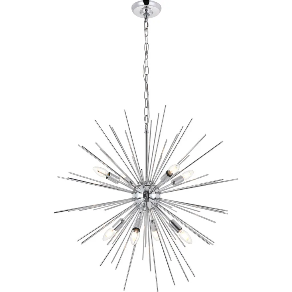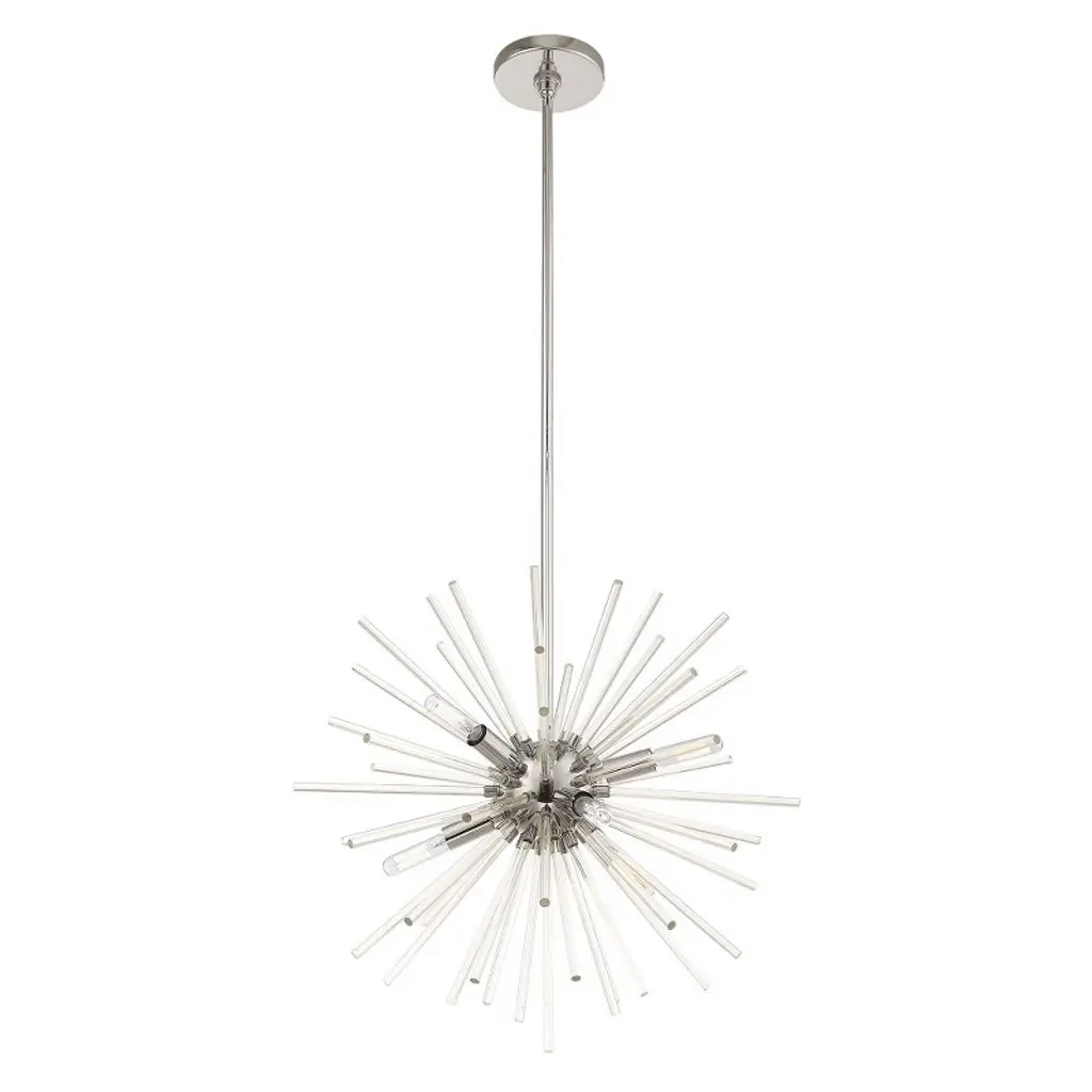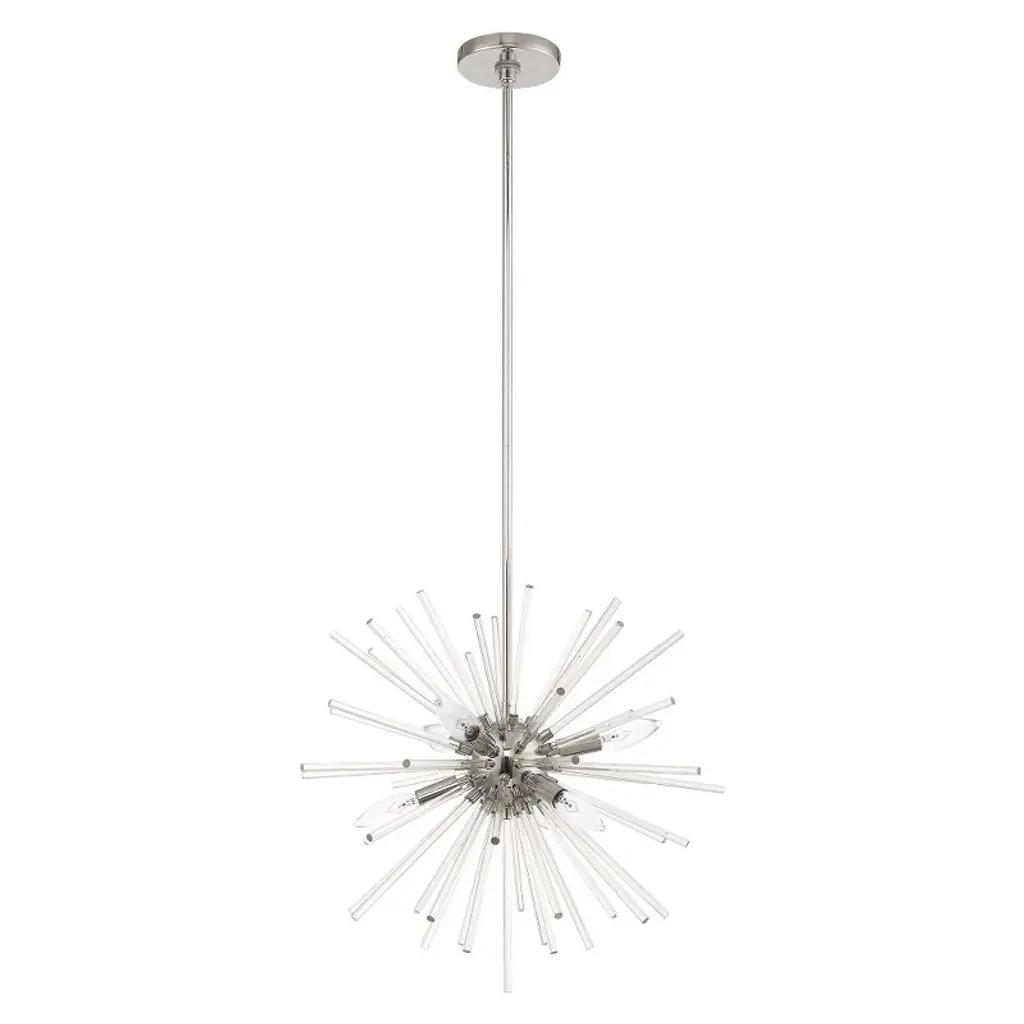 Collection: Utopia, Material: Steel, Finish Color: Polished Chrome, Width: 20", Height: 25.25", Hanging Method: Stem, Lamping Type: Incandescent, Number Of Bulbs: 6, Wattage: 360 Watts, Moisture Rating: Dry Rated, Desc: The Utopia six light pendant chandelier will become an attention-grabbing feature in your modern home decor. The polished chrome finish graces the design with elegance and charm, providing a traditional quality to the appearance. The clear crystal rods gives the pendant chandelier a sleek and attractive style. No. of Rods: 3 / Canopy Included: Yes / Shade Included: Yes / Canopy Diameter: 5.13 / Rod Length(s): 18.00. ,