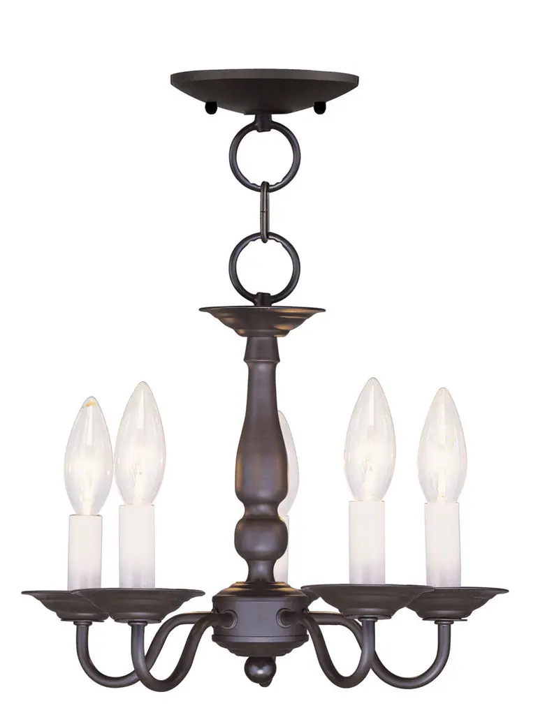 Collection: Williamsburgh, Material: Steel, Finish Color: Bronze, Width: 13", Height: 11", Hanging Method: Chain, Chain Length: 36", Lamping Type: Incandescent, Number Of Bulbs: 5, Wattage: 300 Watts, Moisture Rating: Damp Rated, Desc: Simple, yet refined, the traditional, colonial mini chandelier/semi flush mount is a perennial favorite. Part of the Williamsburgh series, this handsome mini chandelier/semi flush mount is a timeless beauty. Canopy Included: Yes / Canopy Diameter: 5.00. ,