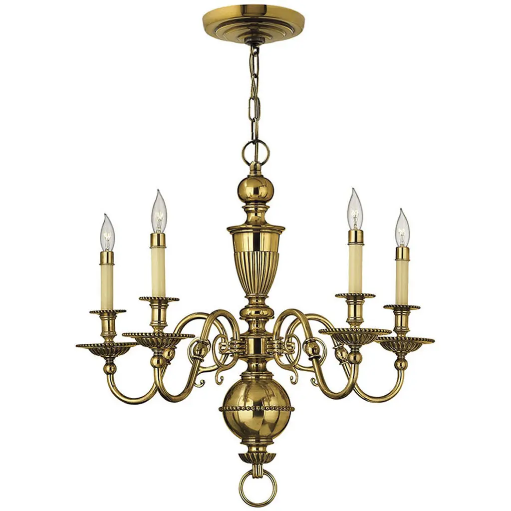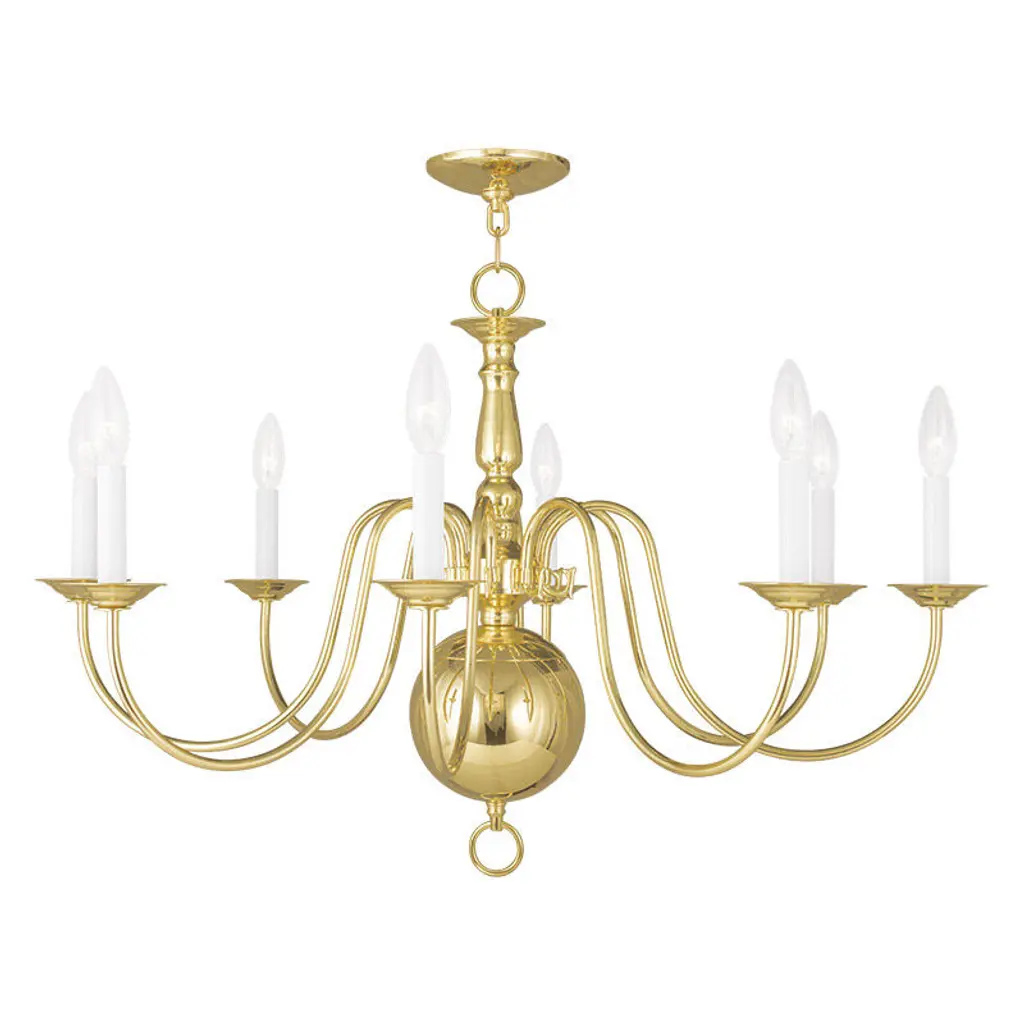 Collection: Williamsburgh, Material: Steel, Finish Color: Polished Brass, Width: 24", Height: 18", Hanging Method: Chain, Chain Length: 36", Lamping Type: Incandescent, Number Of Bulbs: 6, Wattage: 360 Watts, Moisture Rating: Dry Rated, Desc: Simple, yet refined, the traditional, colonial chandelier is a perennial favorite. Part of the Williamsburgh series, this handsome chandelier is a timeless beauty.,