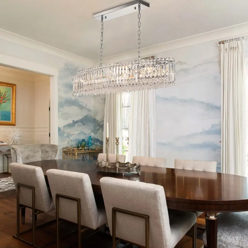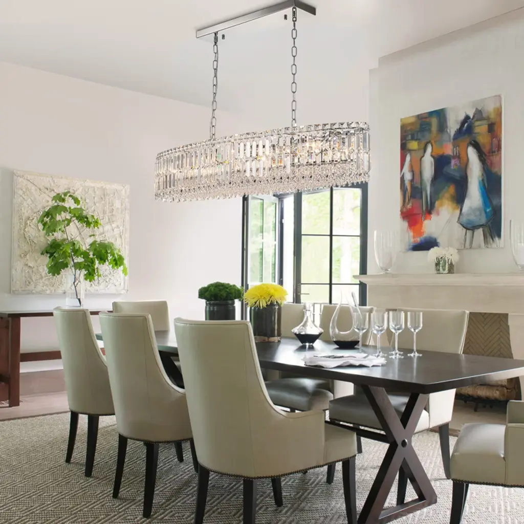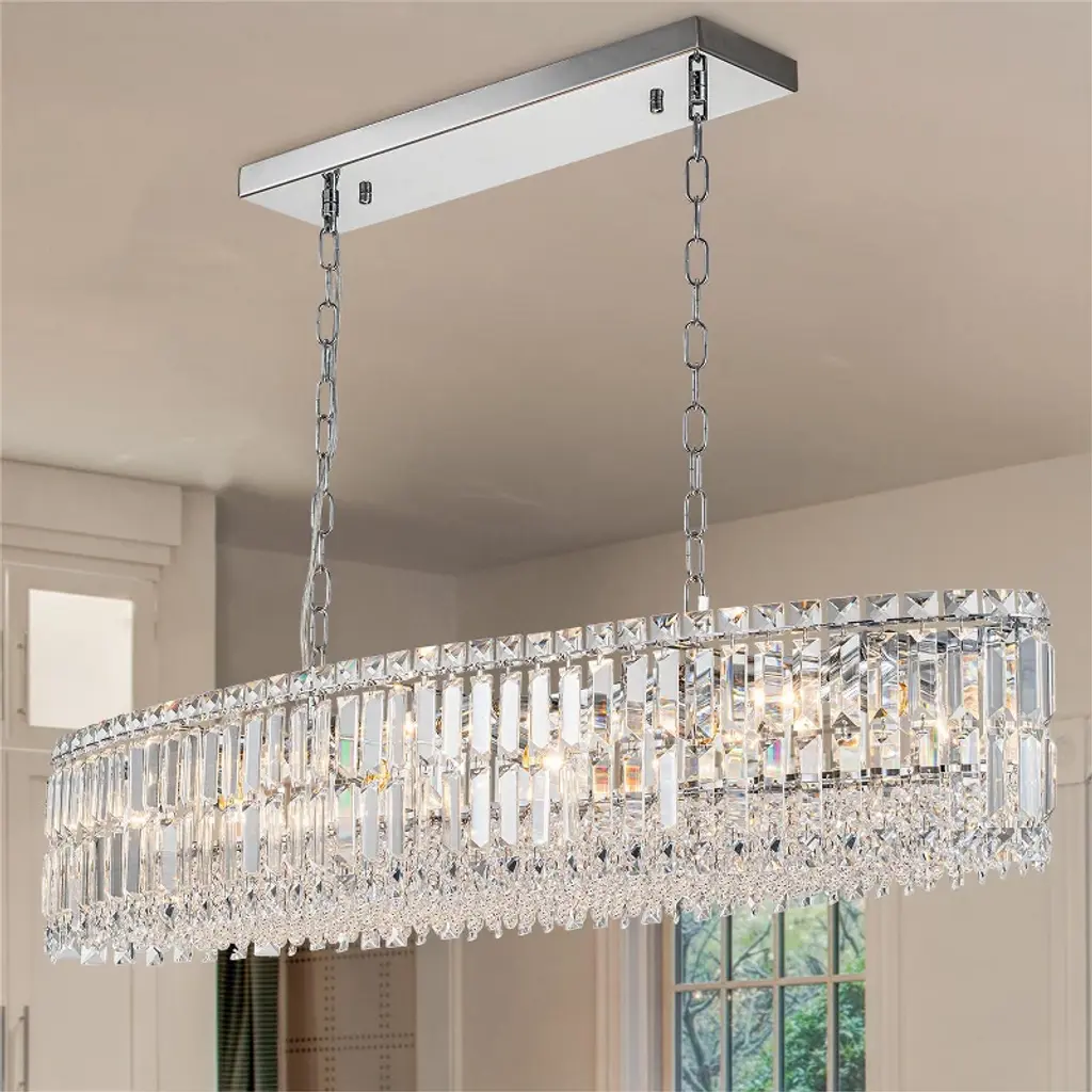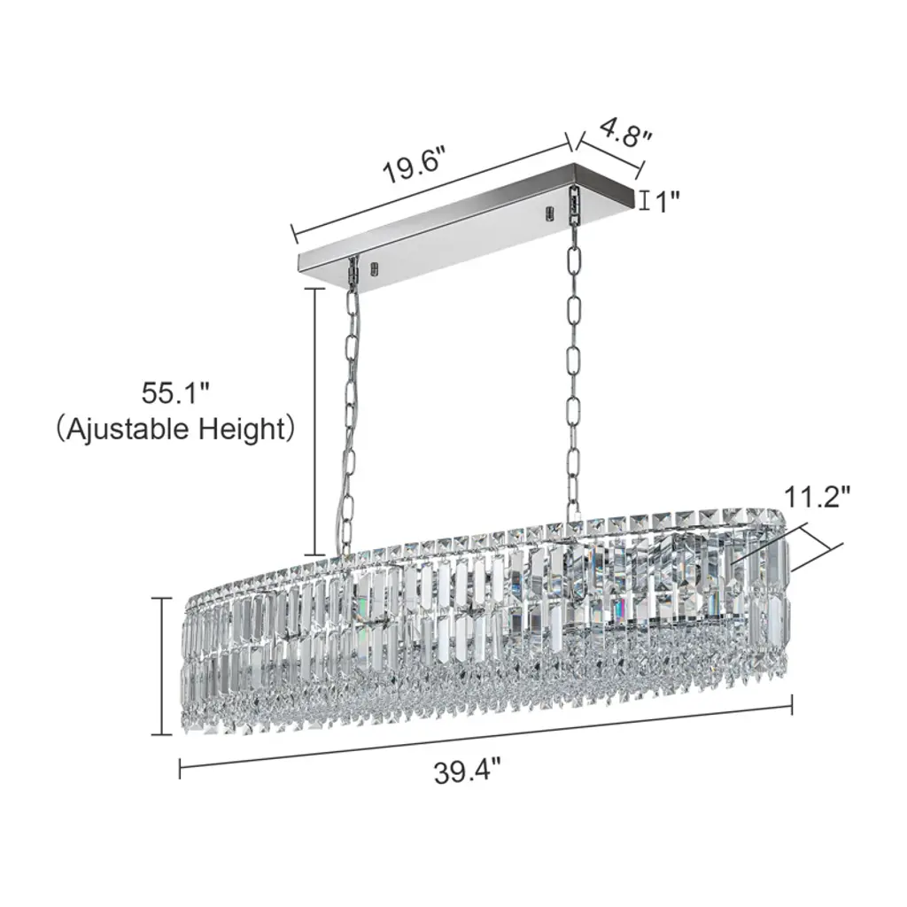 This modern oval crystal chandelier brings elegance and sophistication to dining spaces. Measuring 39 3/8" × 11 1/4" × 6 7/8", it features a sleek rectangular canopy (19 11/16" × 4 13/16" × 1") and 10 E12 sockets (bulbs not included). The 55 1/8" adjustable chain allows for flexible installation, making it ideal for dining rooms, kitchens, and contemporary interiors.
