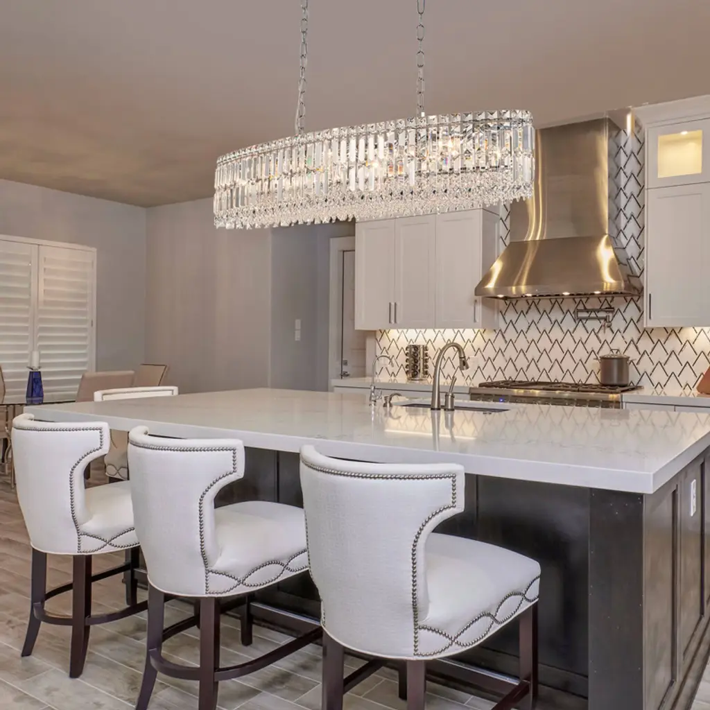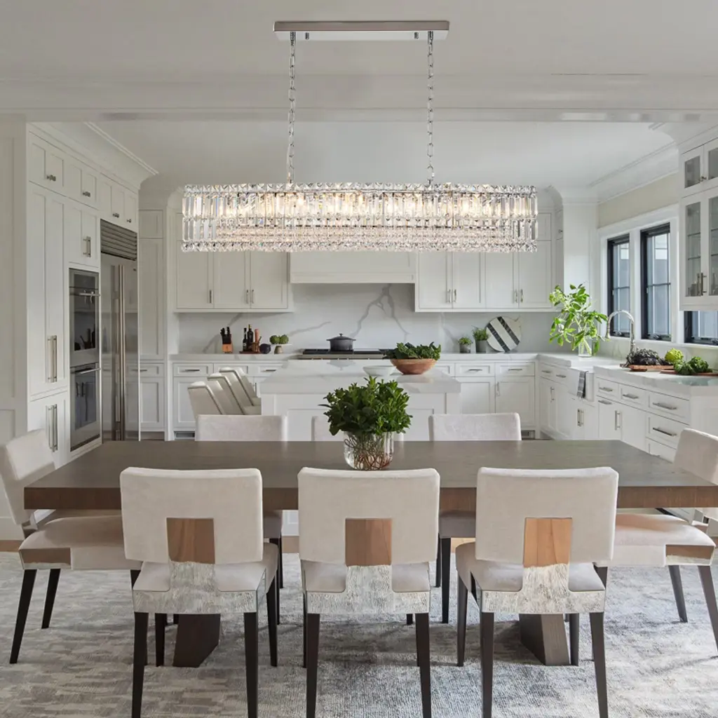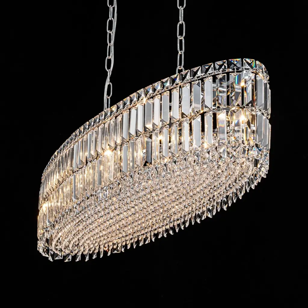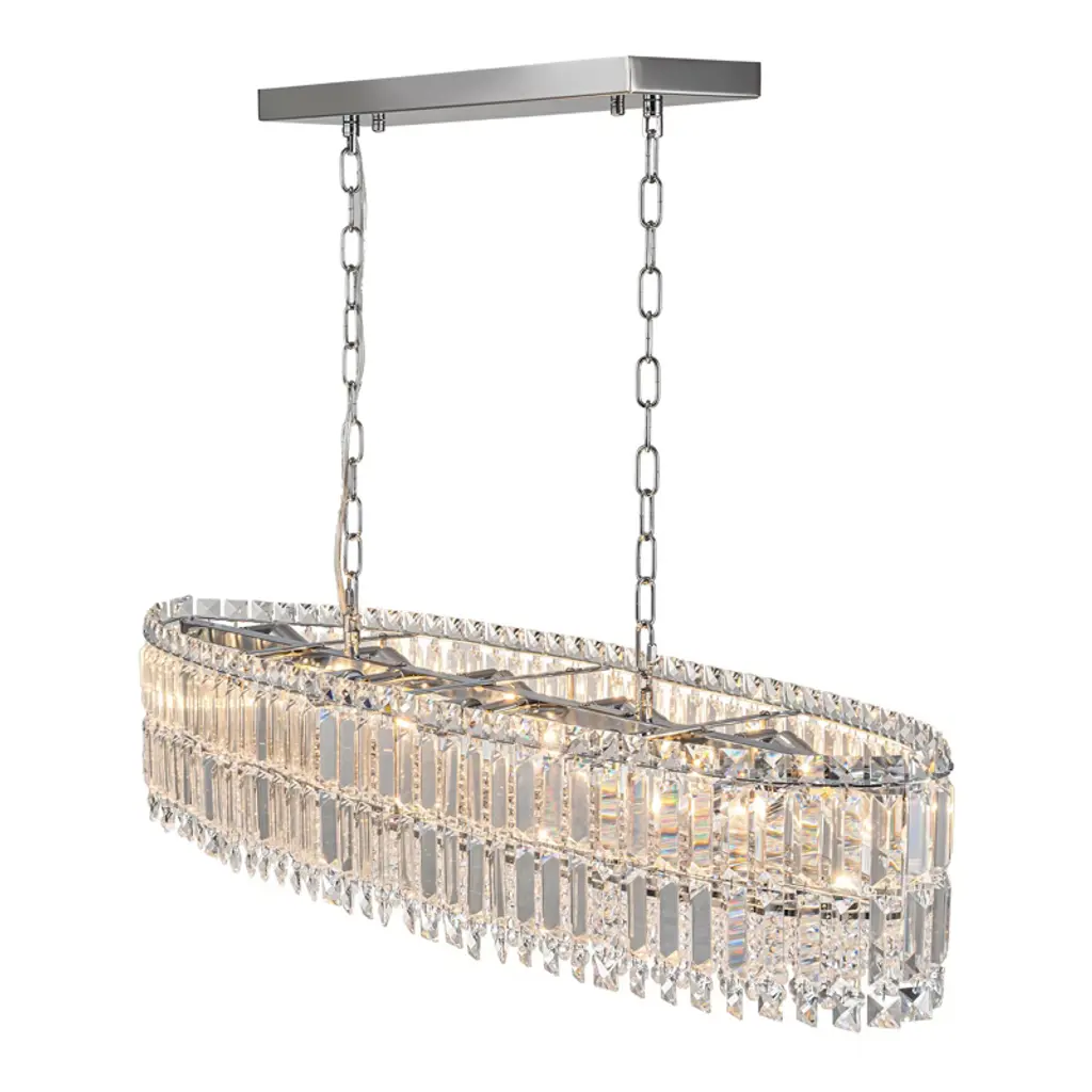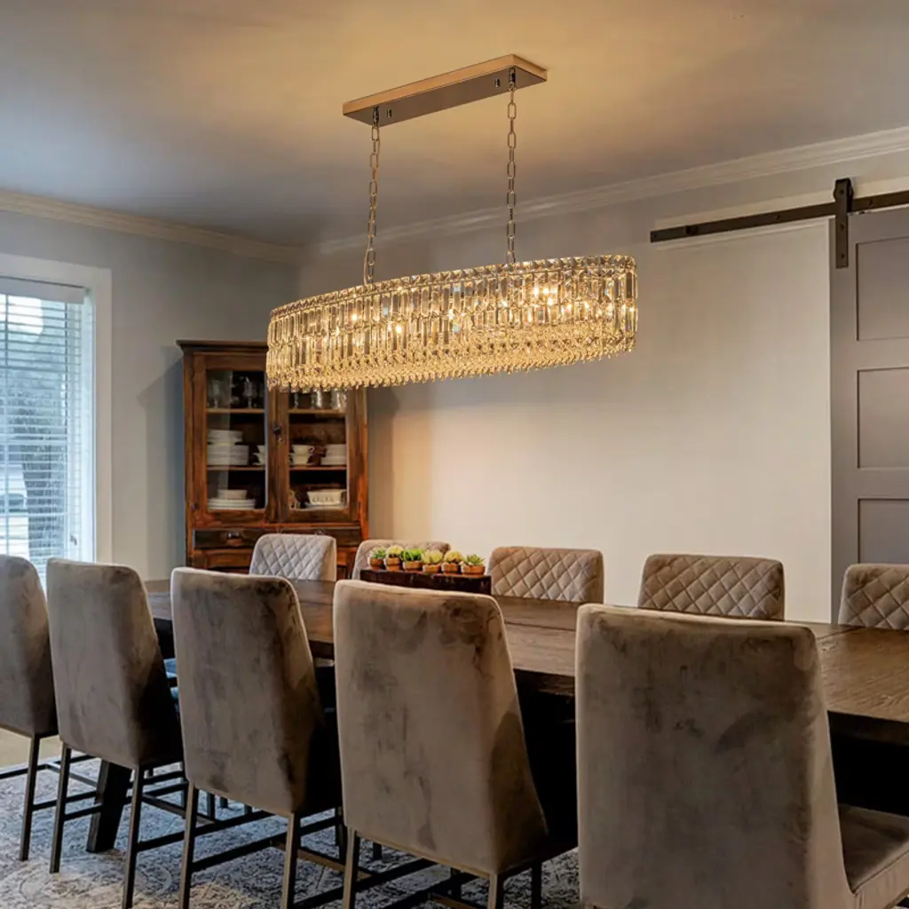 This modern oval crystal chandelier brings elegance and sophistication to dining spaces. Measuring 39 3/8" × 11 1/4" × 6 7/8", it features a sleek rectangular canopy (19 11/16" × 4 13/16" × 1") and 10 E12 sockets (bulbs not included). The 55 1/8" adjustable chain allows for flexible installation, making it ideal for dining rooms, kitchens, and contemporary interiors.