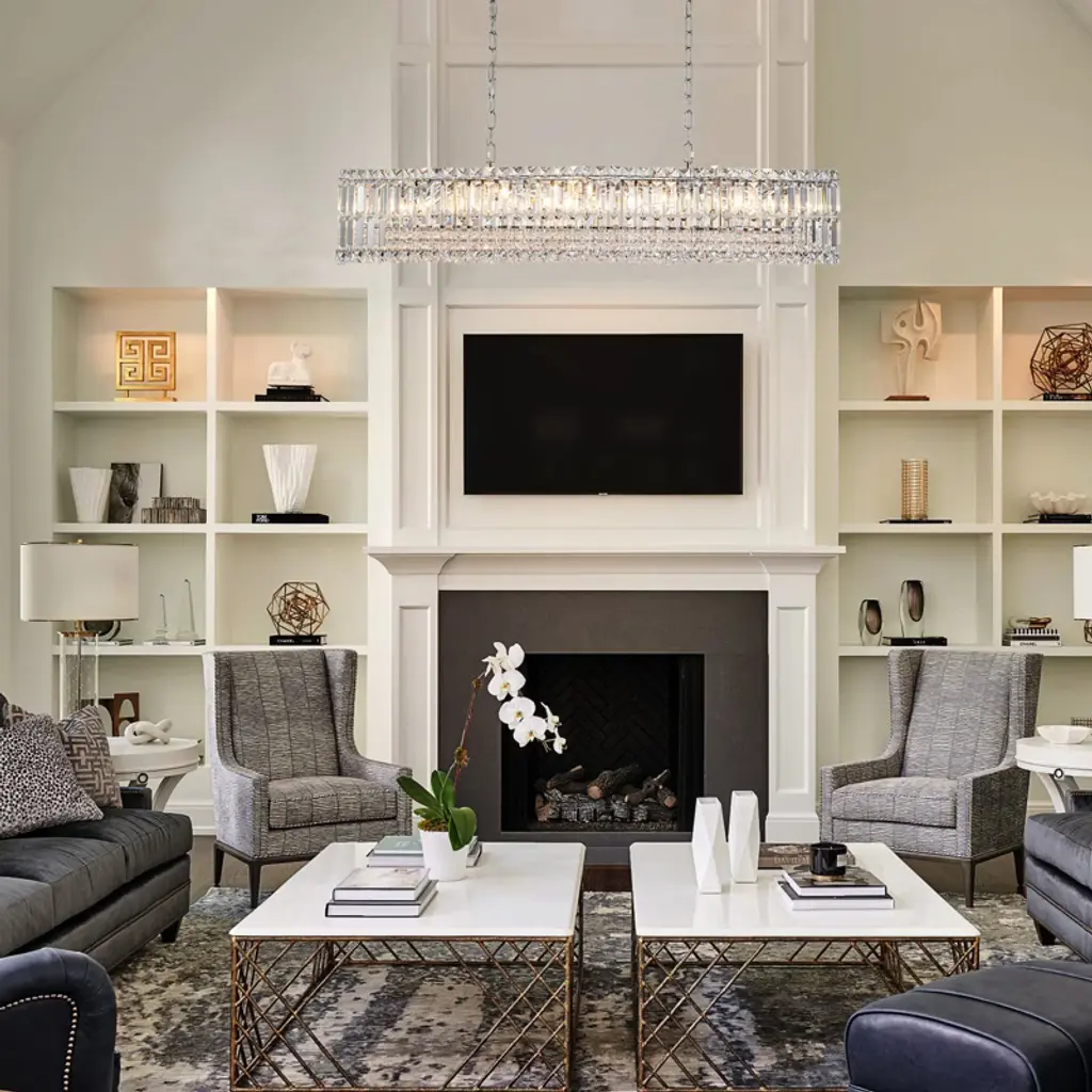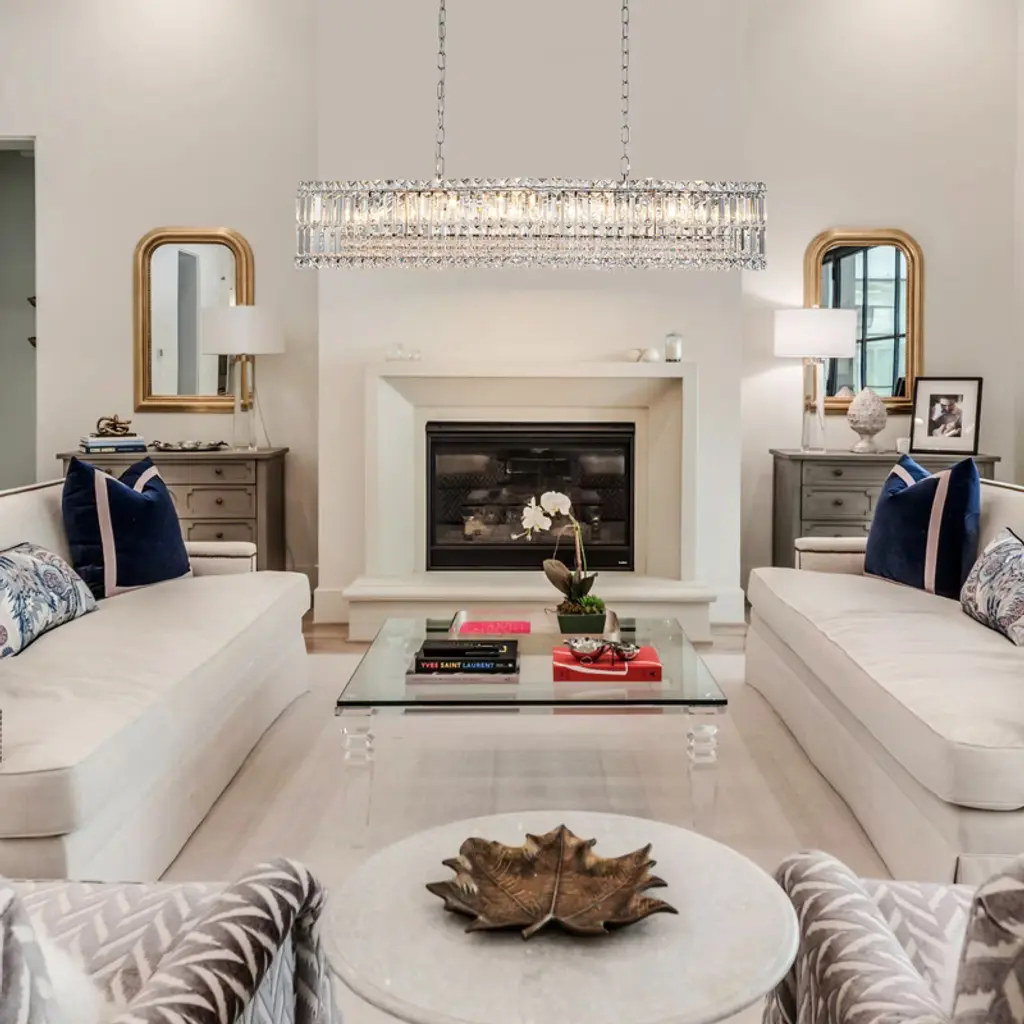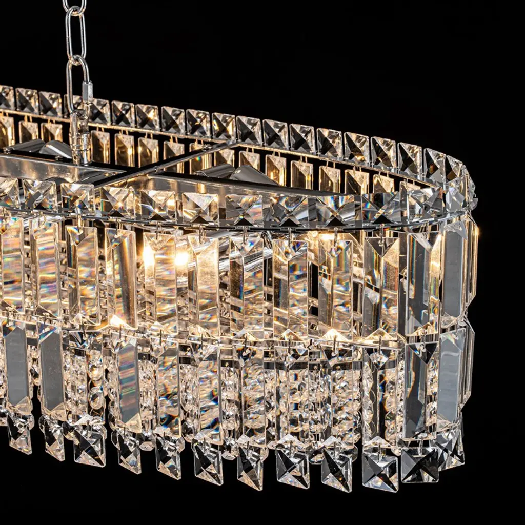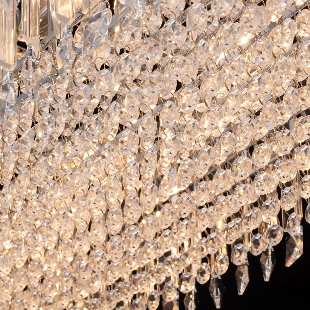 This modern oval crystal chandelier brings elegance and sophistication to dining spaces. Measuring 39 3/8" × 11 1/4" × 6 7/8", it features a sleek rectangular canopy (19 11/16" × 4 13/16" × 1") and 10 E12 sockets (bulbs not included). The 55 1/8" adjustable chain allows for flexible installation, making it ideal for dining rooms, kitchens, and contemporary interiors.