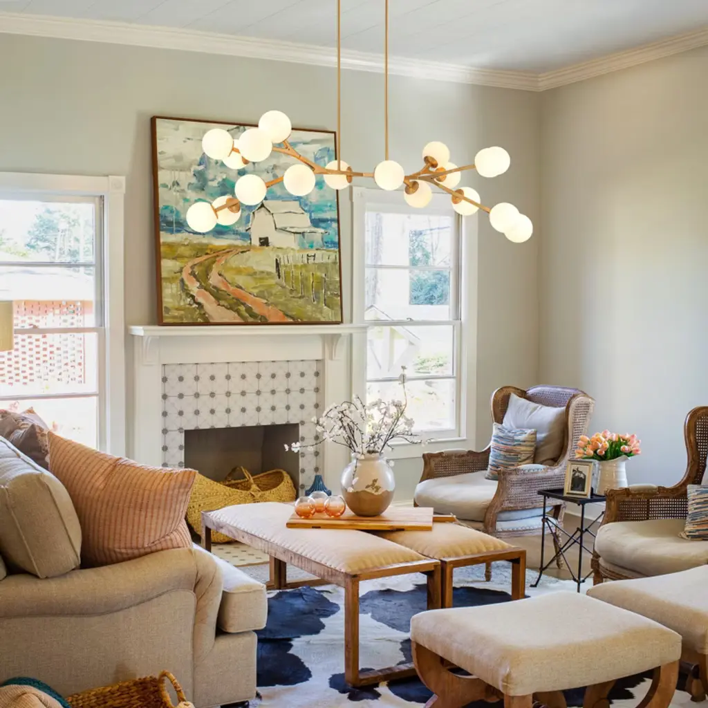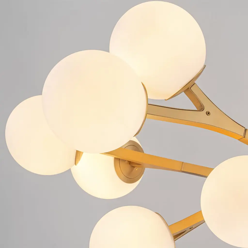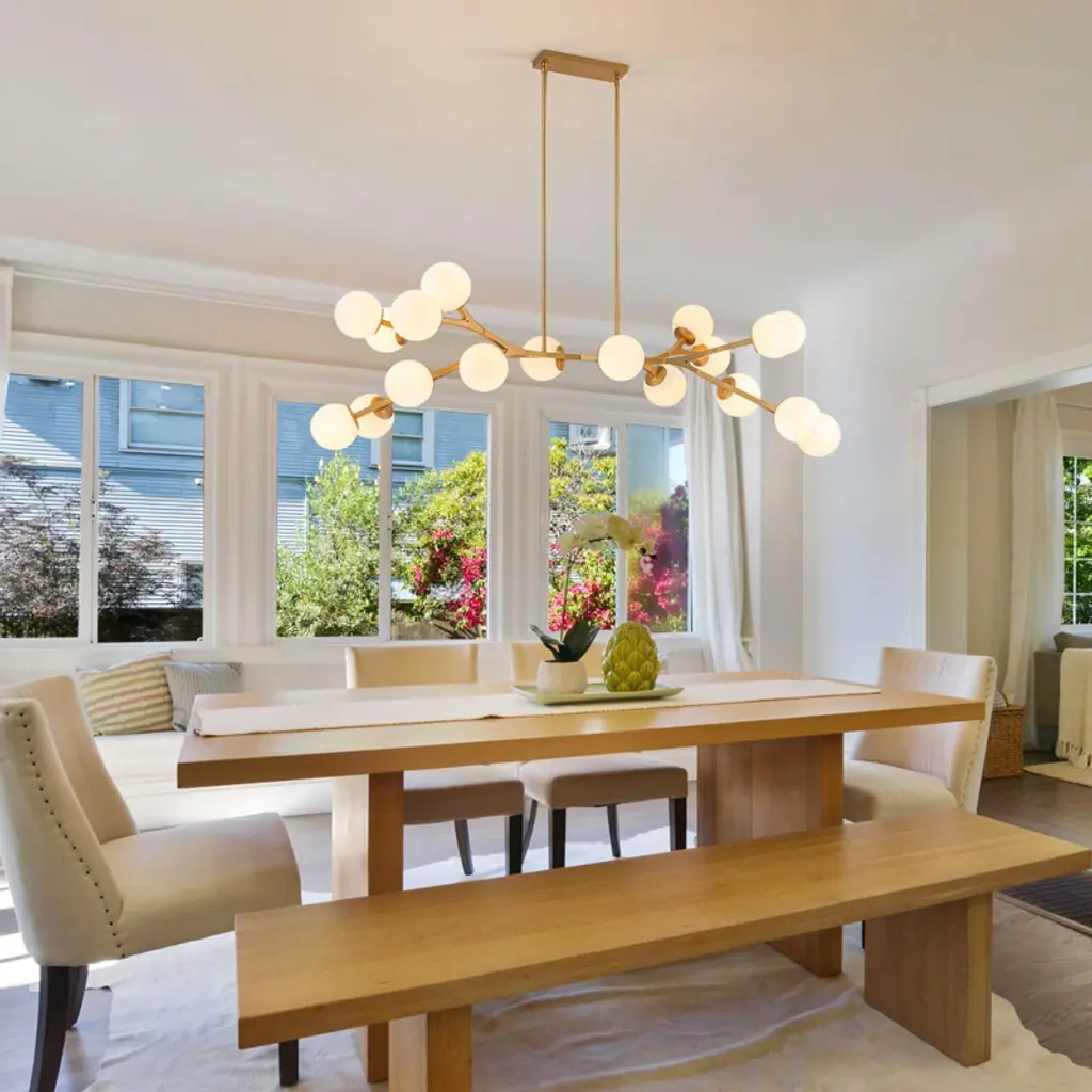 This stunning 18-light Sputnik Globe Chandelier combines mid-century modern style with a sophisticated touch. Designed with 18 white frosted glass globes and a brass finish, it brings a noble elegance to your living or dining space. The adjustable height feature, with 8 x 12" and 4 x 6" rods, allows for easy customization, making it suitable for various ceiling types, including sloped, flat, or vaulted ceilings. The chandelier requires 18 E12 bulbs (not included), with a maximum of 40W per bulb. It’s fully dimmable with compatible bulbs and dimmer switches, providing the perfect ambiance for any occasion.