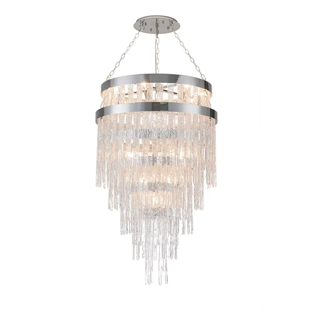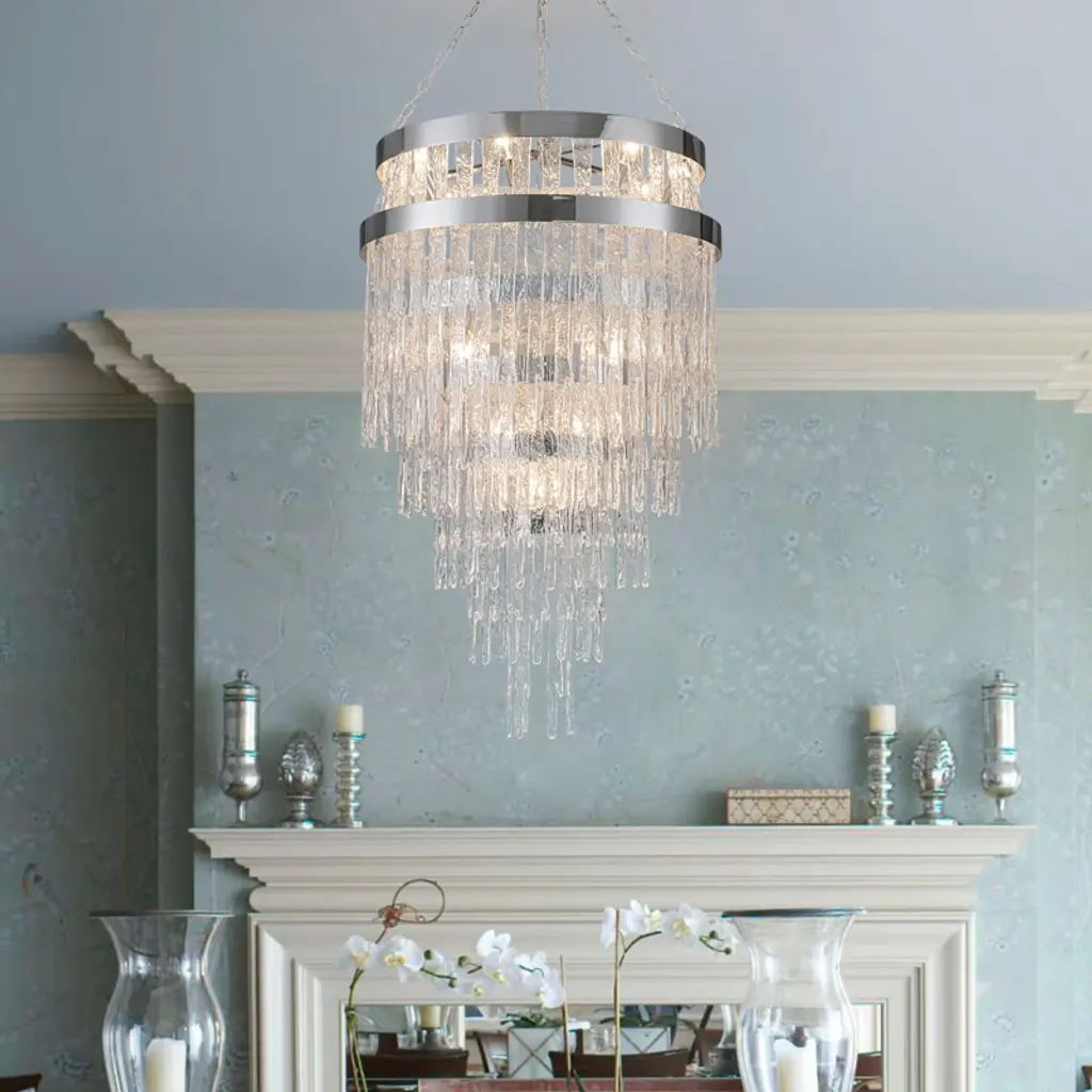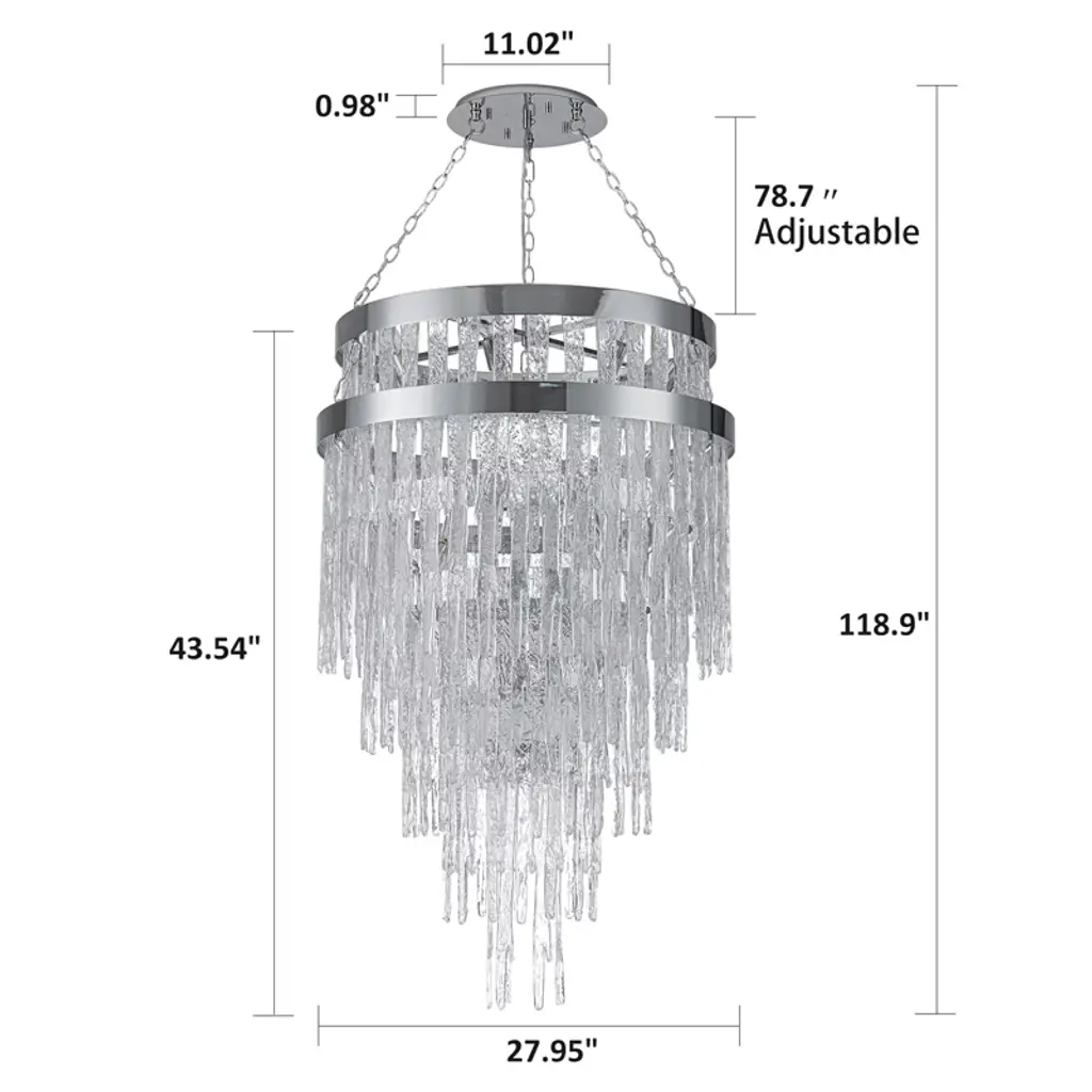 Elevate your space with this luxurious 15-light multi-tier crystal chandelier. Crafted with a 28" diameter and standing 43 1/2" tall, this fixture boasts 158 hand-crafted crystal icicle rods (plus 4 spares), each measuring 16 1/8" long, cascading in layered brilliance. The chrome-finished frame and 15 E12 sockets (bulbs not included) provide ample illumination, ideal for high-ceiling entryways, staircases, or formal dining rooms. With a 78 3/4" chain and clear 3-core wiring, this fixture reaches a max height of 118 9/10", with a minimum drop of 55 1/8". Includes ETL certification label for safe residential installation.