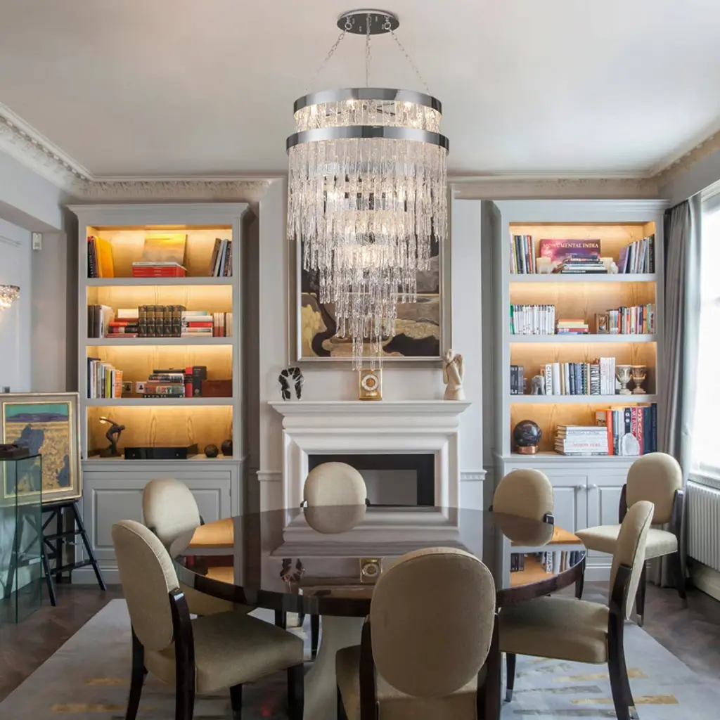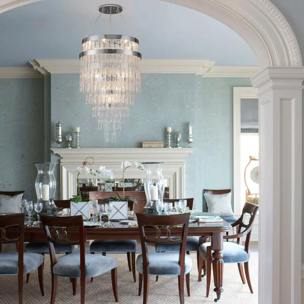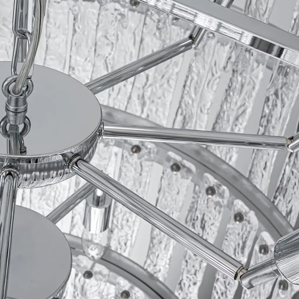 Elevate your space with this luxurious 15-light multi-tier crystal chandelier. Crafted with a 28" diameter and standing 43 1/2" tall, this fixture boasts 158 hand-crafted crystal icicle rods (plus 4 spares), each measuring 16 1/8" long, cascading in layered brilliance. The chrome-finished frame and 15 E12 sockets (bulbs not included) provide ample illumination, ideal for high-ceiling entryways, staircases, or formal dining rooms. With a 78 3/4" chain and clear 3-core wiring, this fixture reaches a max height of 118 9/10", with a minimum drop of 55 1/8". Includes ETL certification label for safe residential installation.